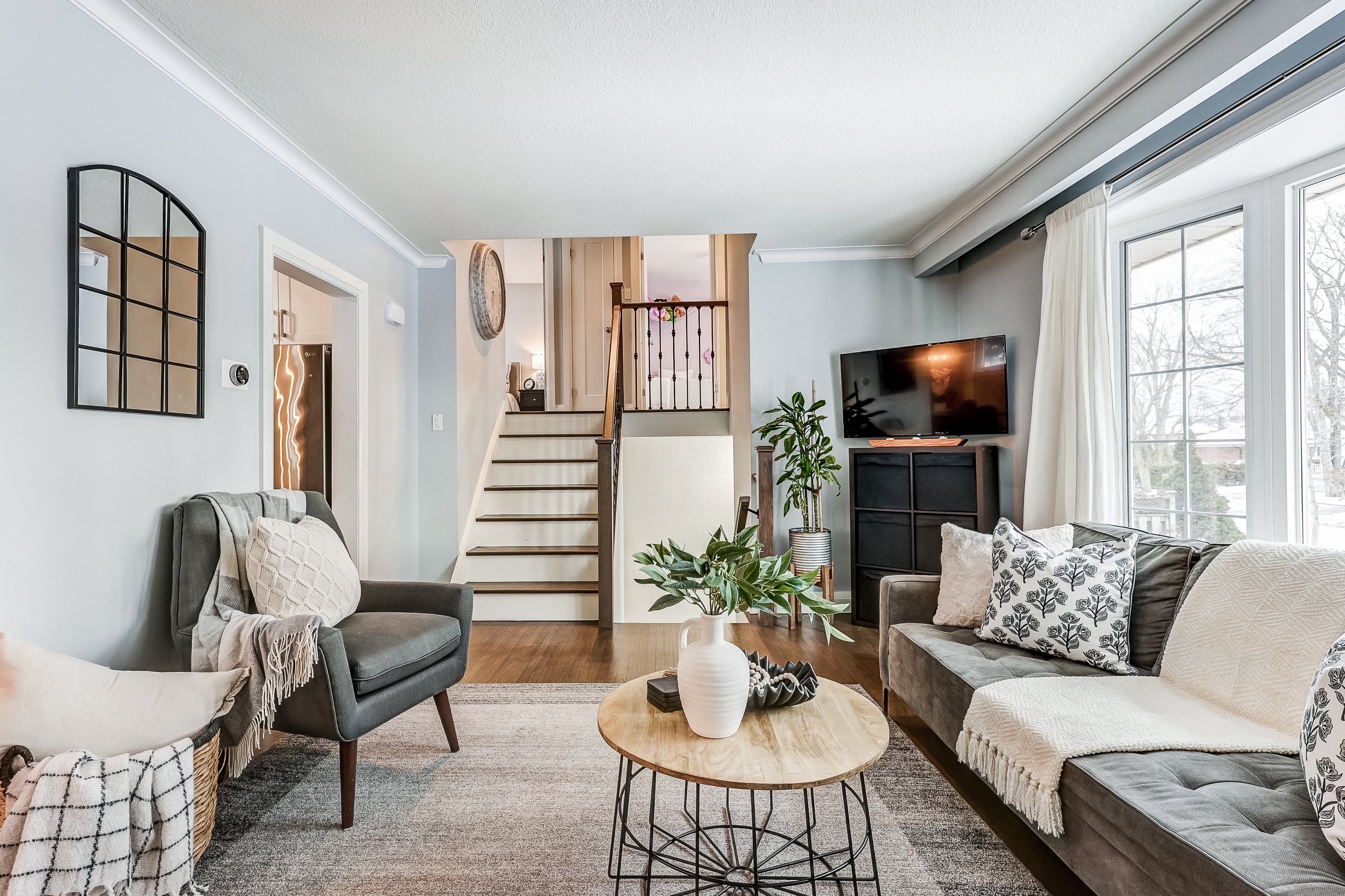 • Open-concept design with stylish hardwood floors throughout.