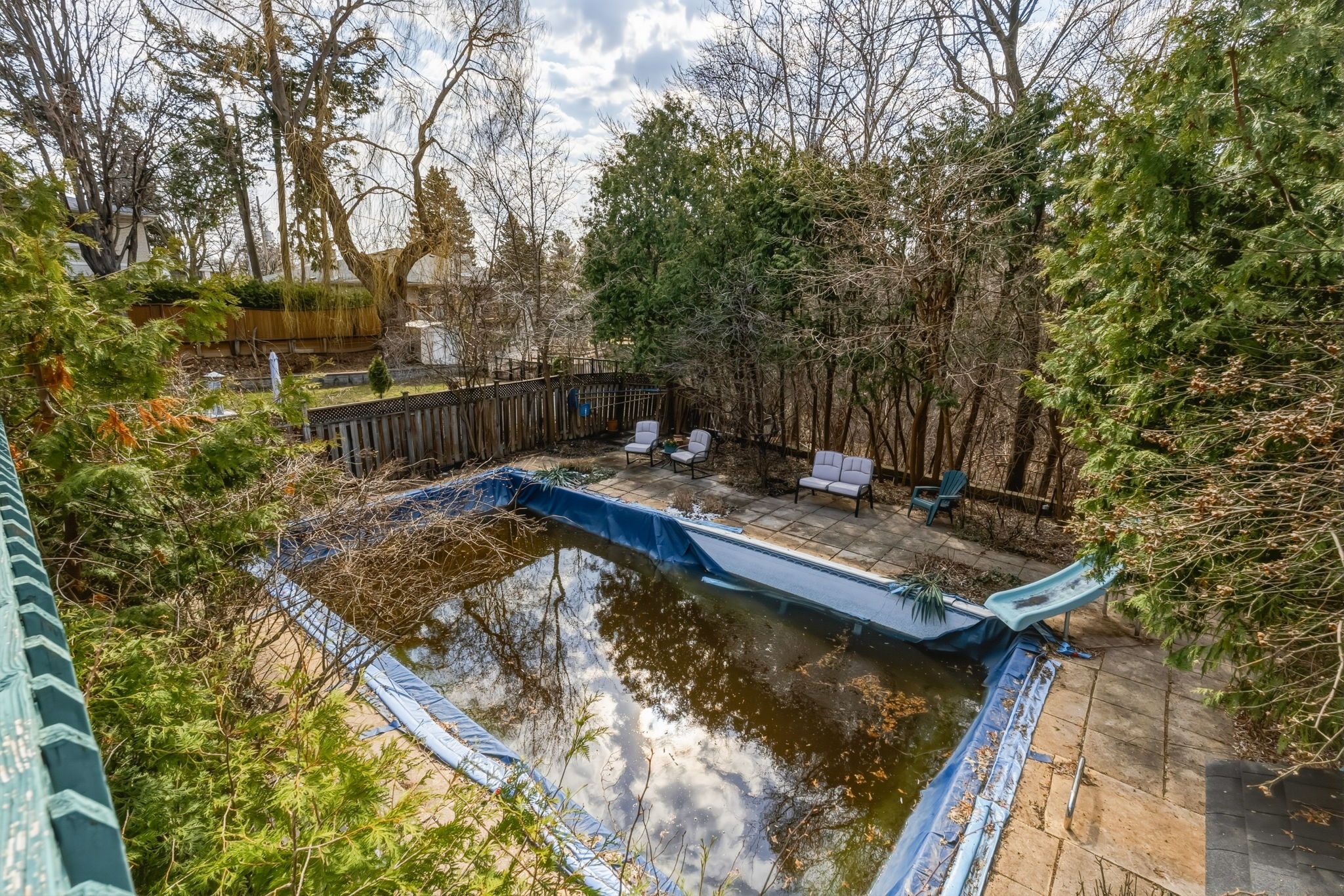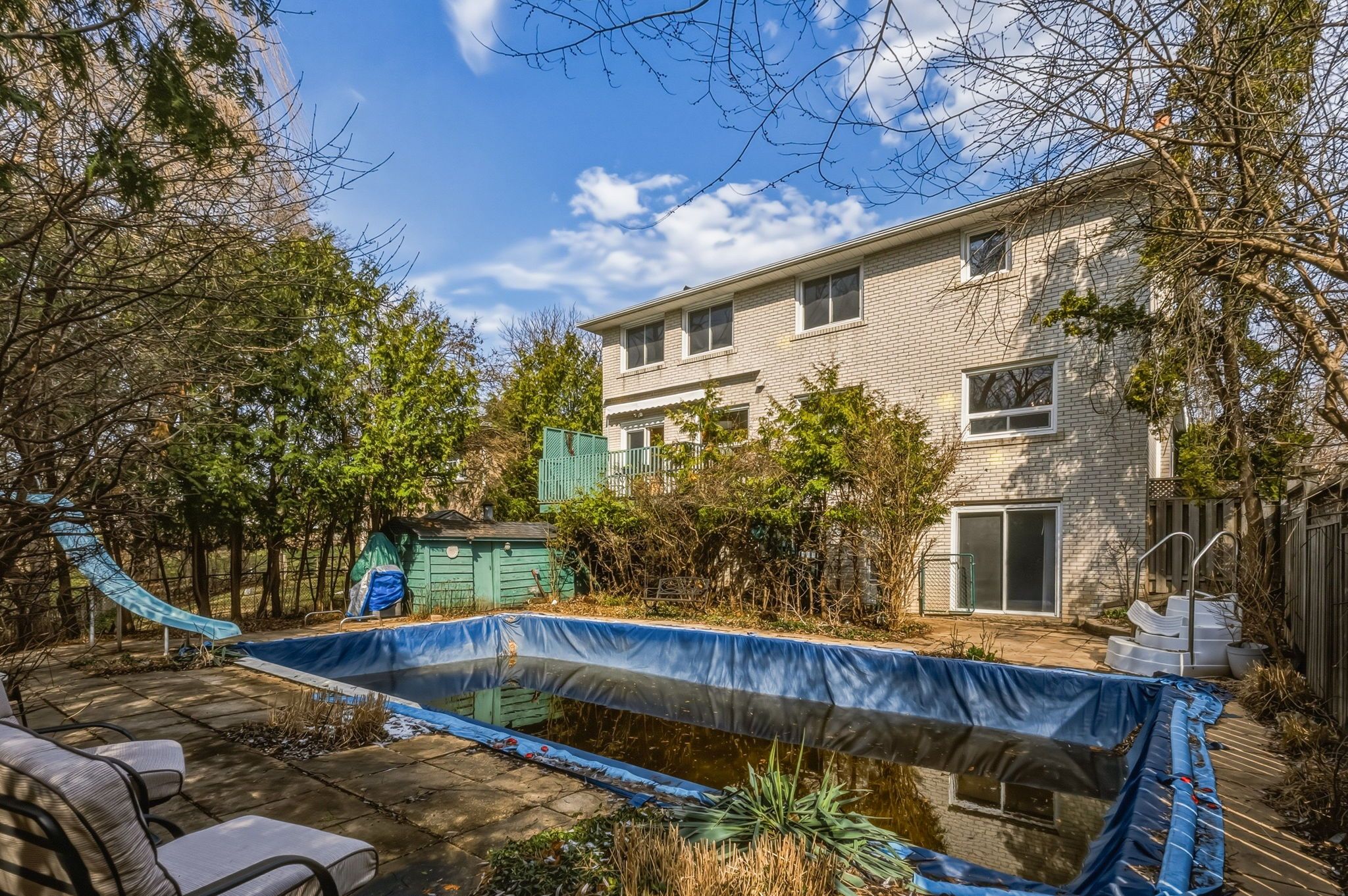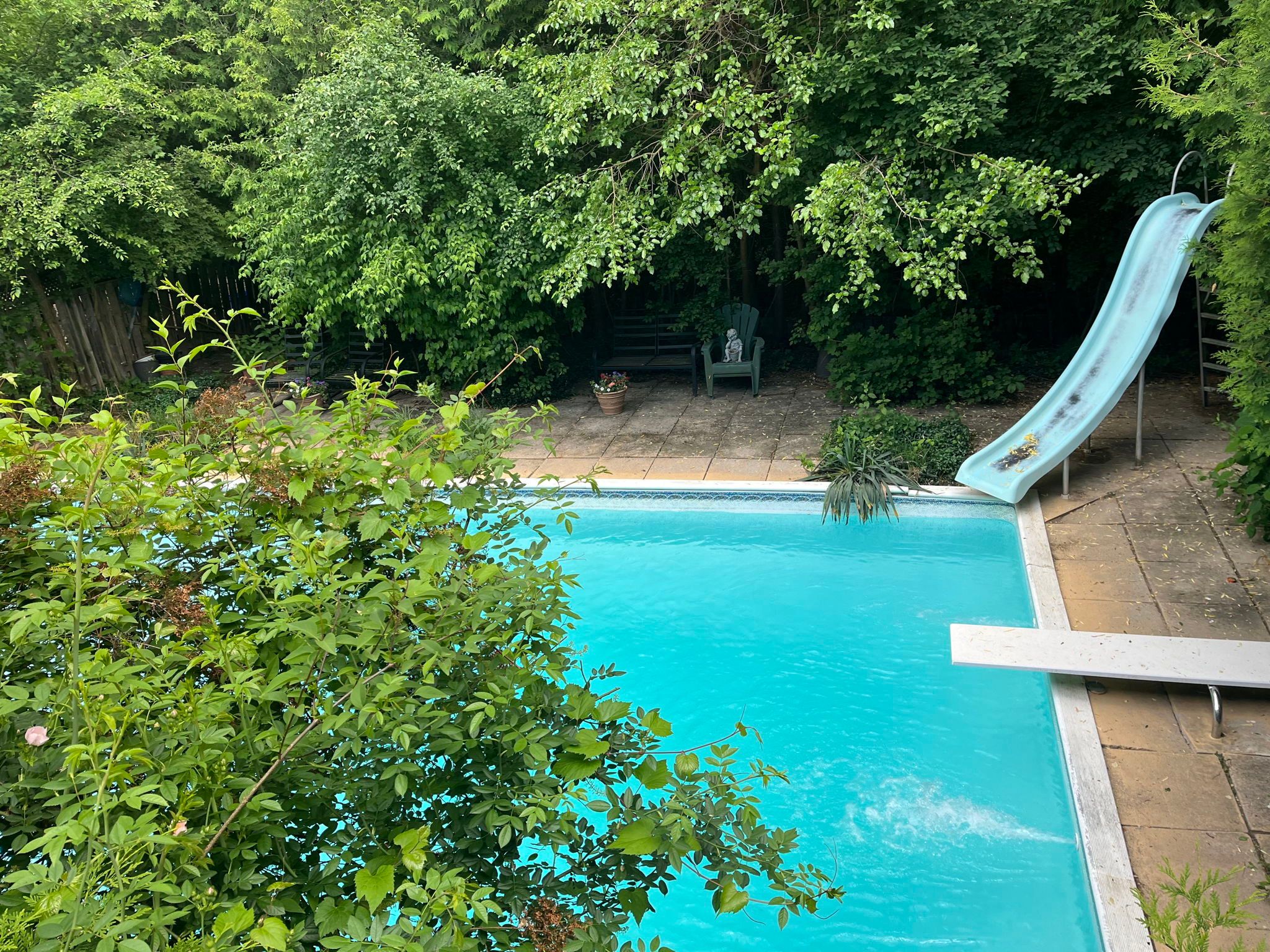 • In-ground swimming pool surrounded by greenery for summer relaxation.
