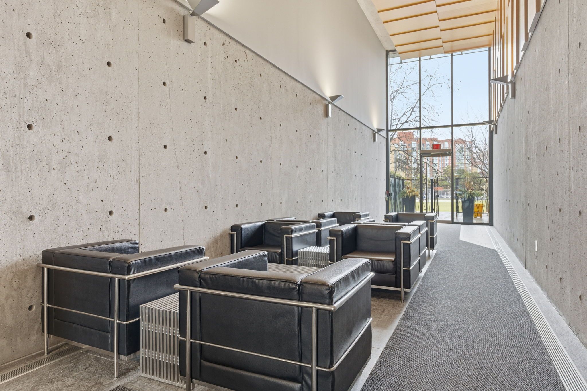 • Soaring concrete ceilings and floor-to-ceiling windows create an airy vibe.