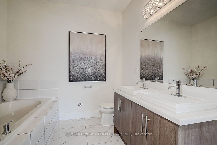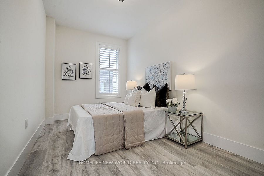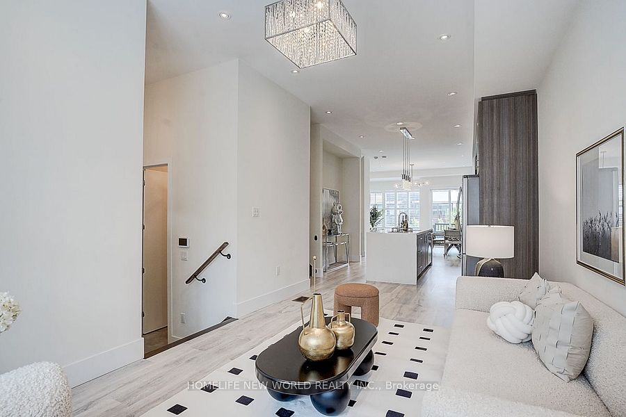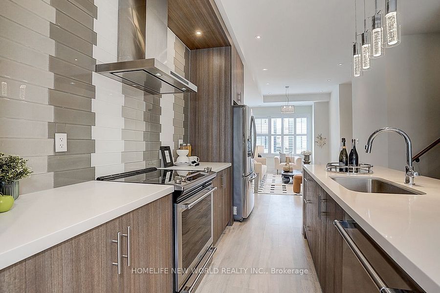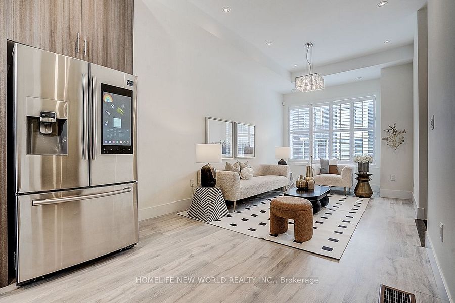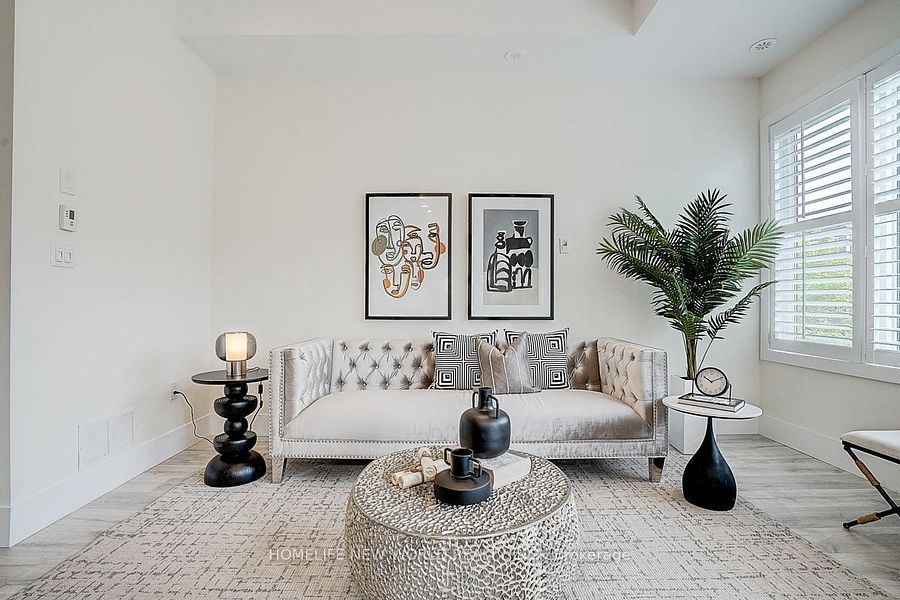 Welcome to spacious 3+1 freehold end-unit townhouse built by treasure hill. Airy sun-filled south view with upgraded high end details throughout. 2262 sf of total living space. Stunning open concept with 10' smooth ceiling on main floor and 9' on 2nd level. Freshly painted. Modern light fixtures & pot lights throughout. California shutters and roller shades for all windows. European-inspired kitchen with large waterfall counter top and custom backsplash. Smart touch screen fridge brings cooking experience. Abundant natural sun filled living area for family enjoyment. W/o dining rm to deck. Master bedroom with 5pc ensuite & oversized walk-in closet with window. Finished ground floor offers large space for entertainment with separate entrance and heated floor, also can be used as a separate bedroom as well. Directly access to large size garage. Minutes from hwy 400, shops, public transit, schools, wonderland, vaughan mills, & much more! Photos were taken from previous listing.
