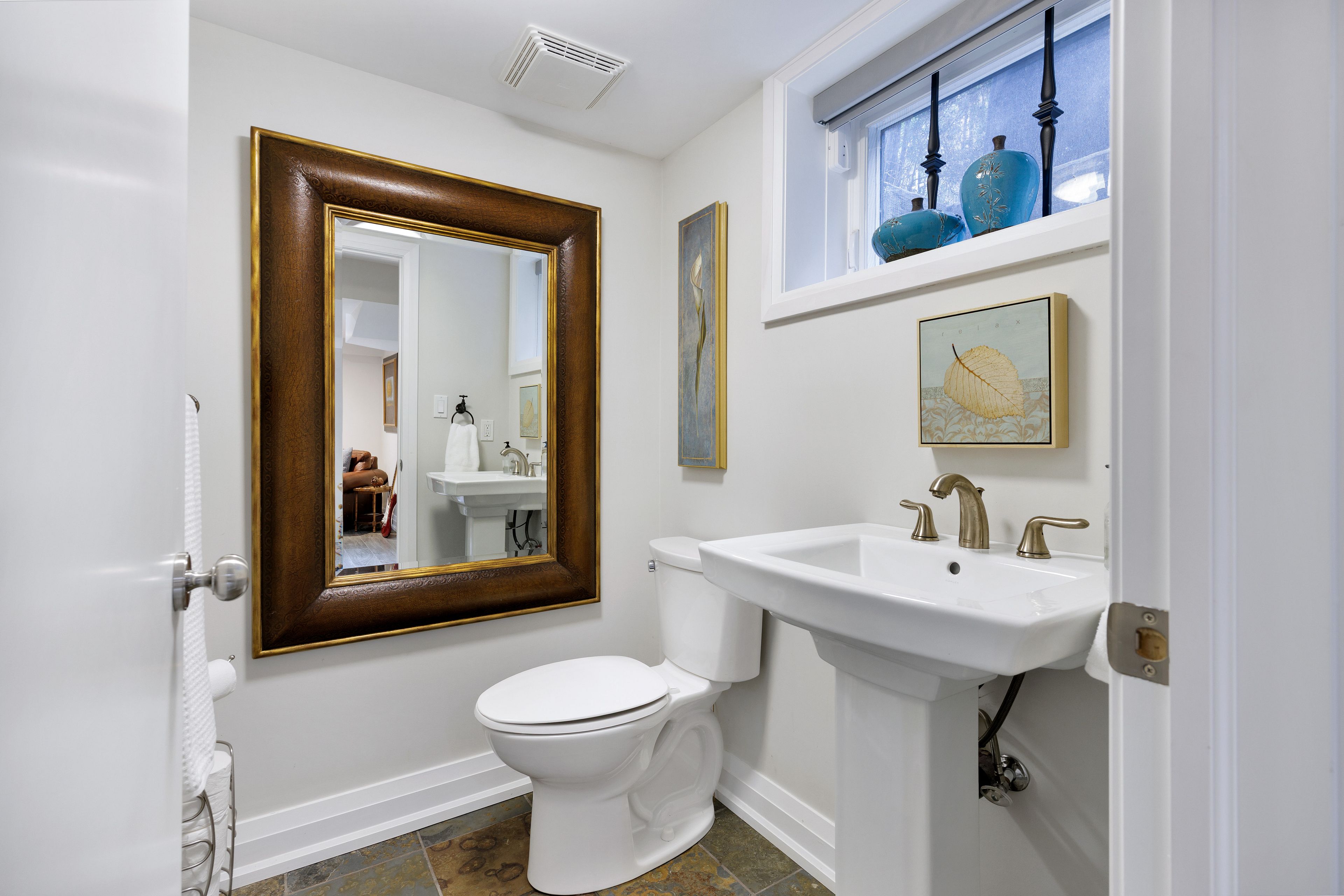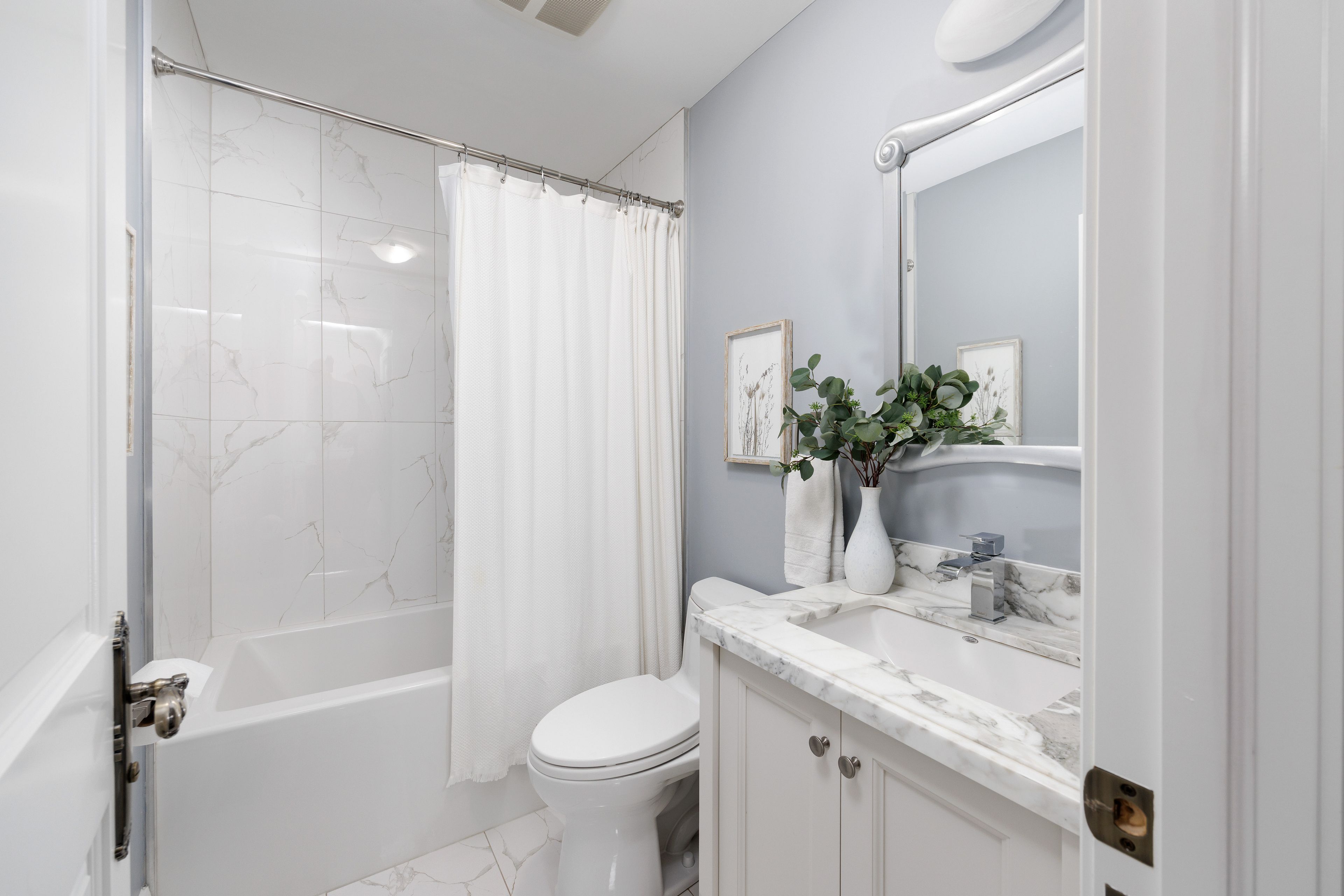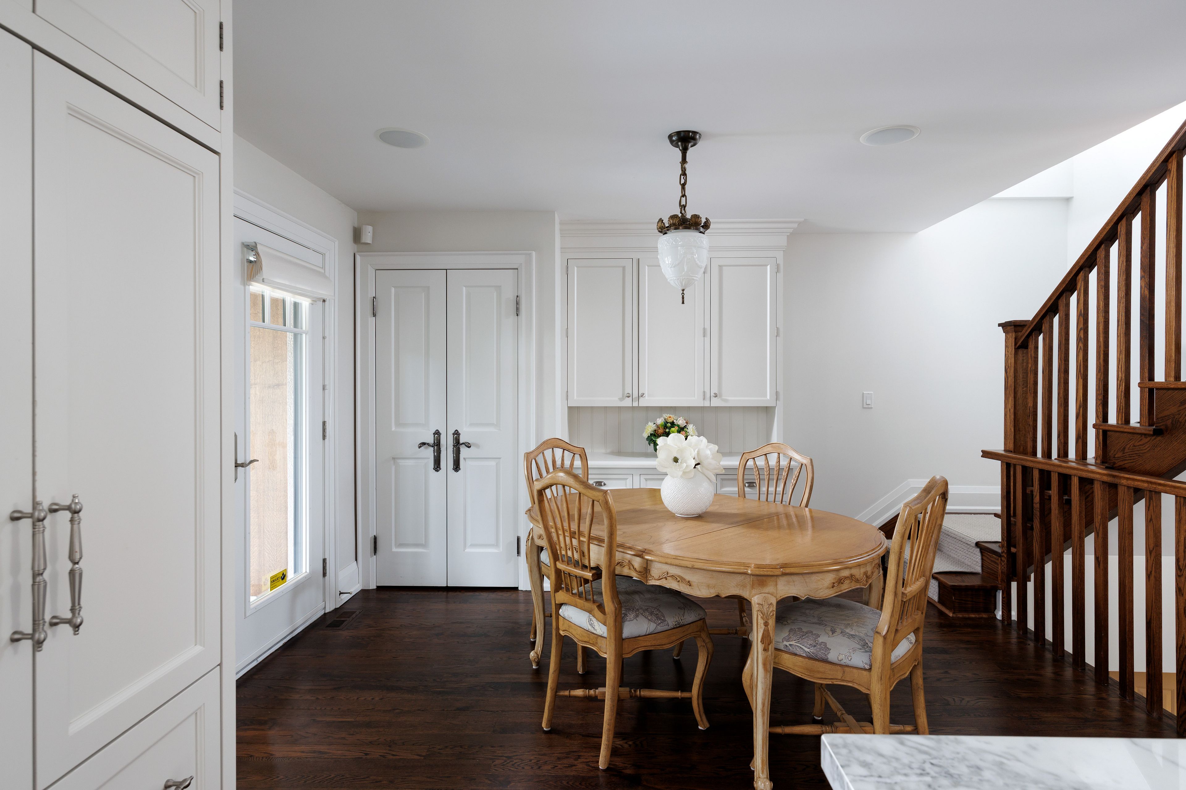 • Spacious chef's kitchen with marble counters and backyard access.