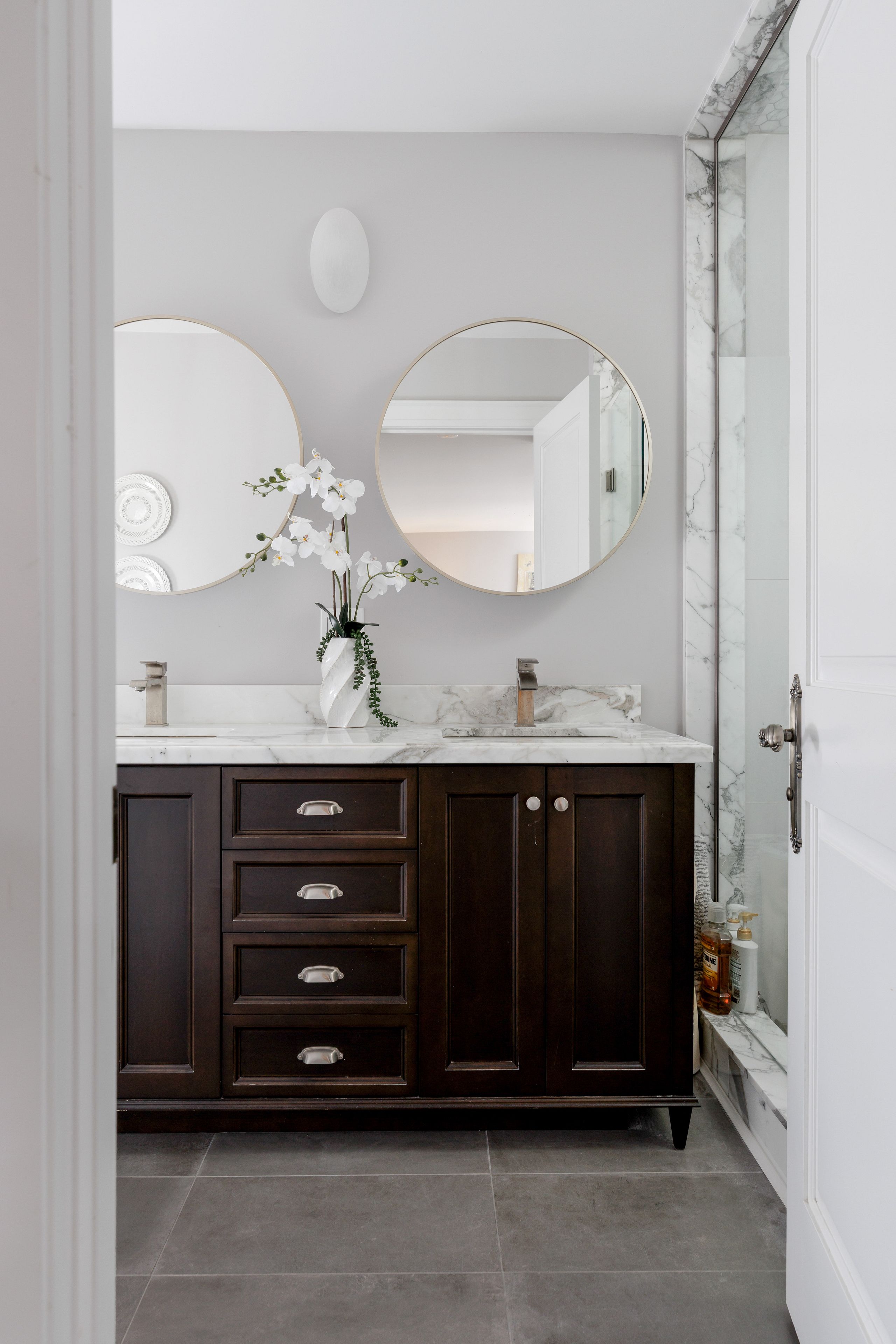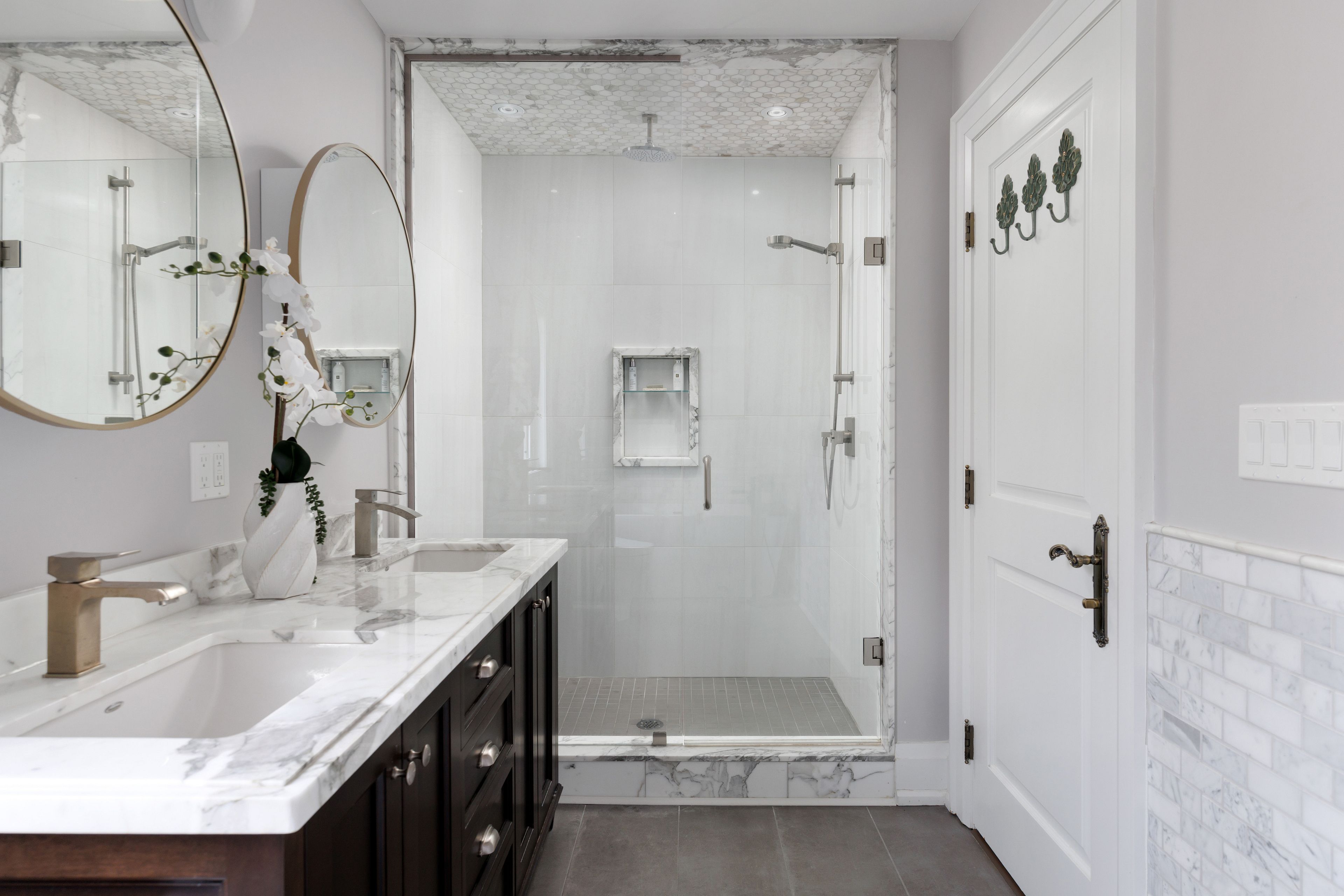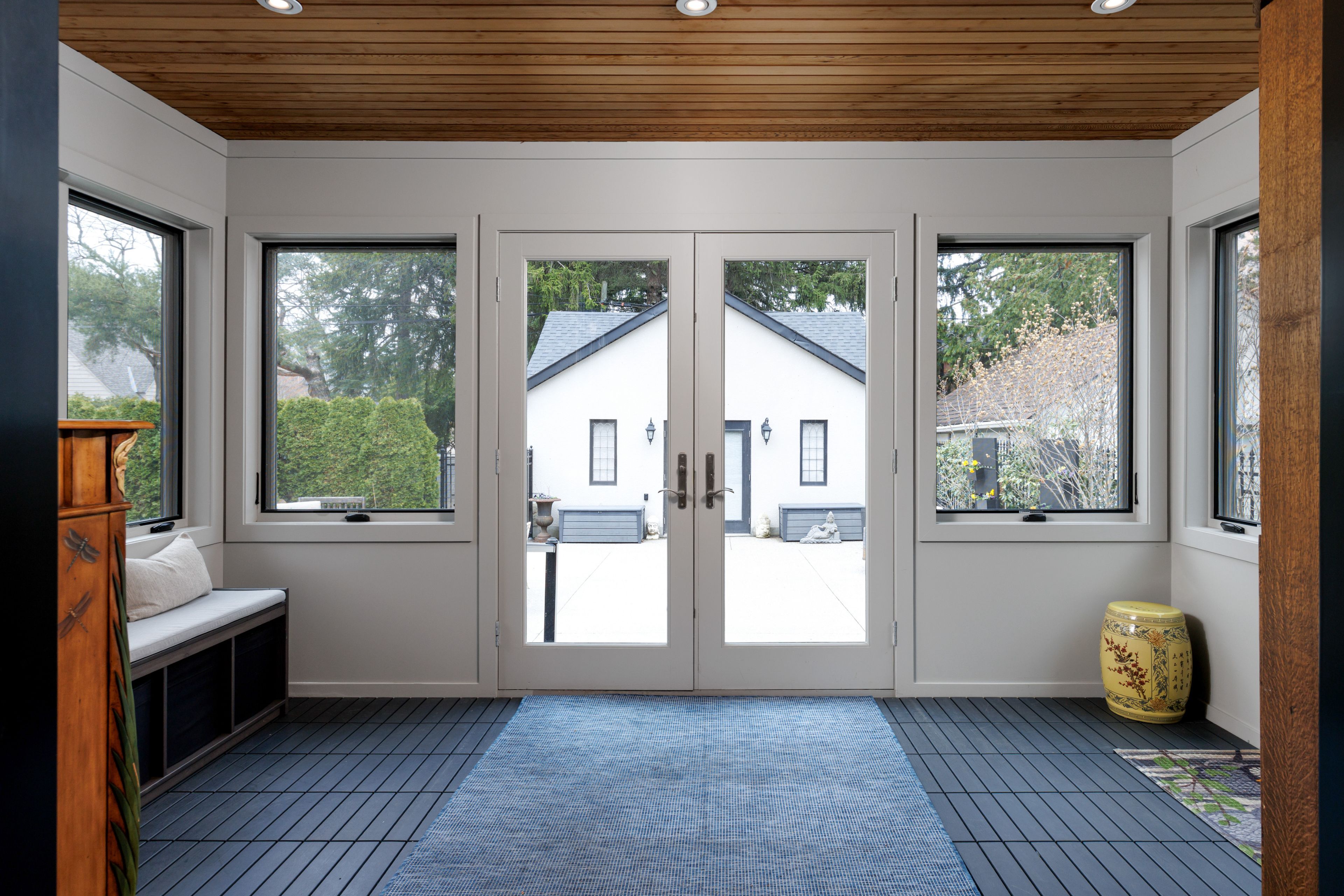 • Spacious chef's kitchen with marble counters and backyard access.