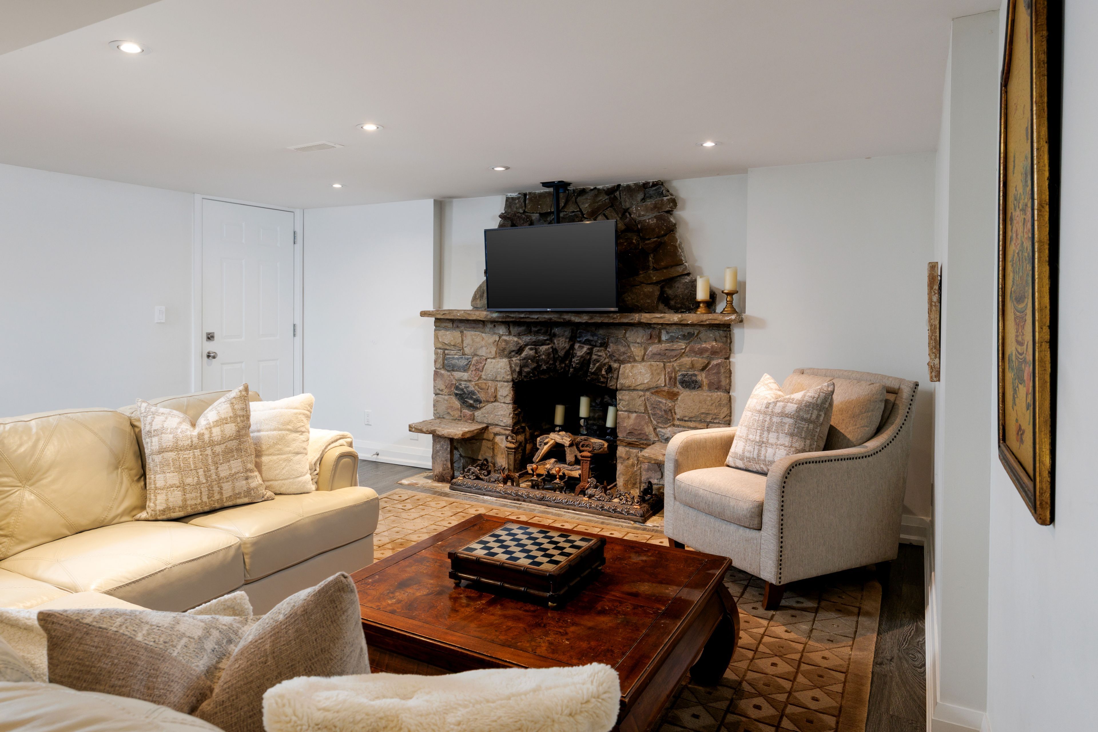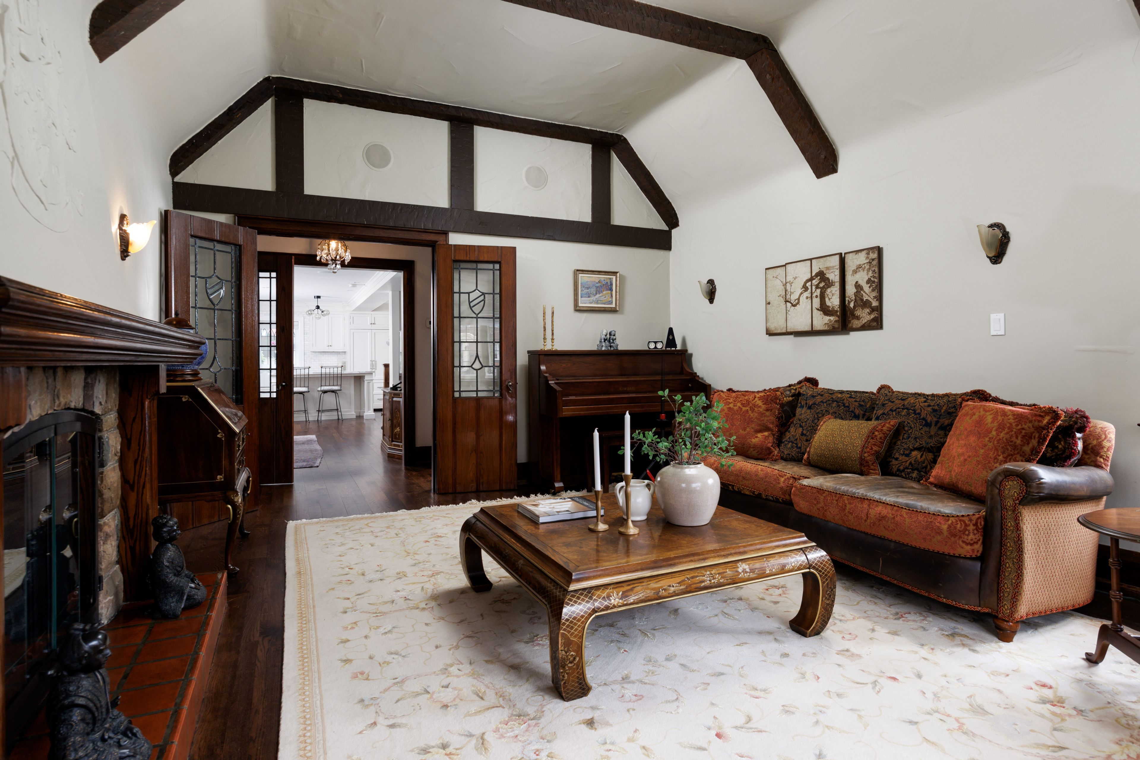• Vaulted great room featuring beamed ceiling and electric fireplace.