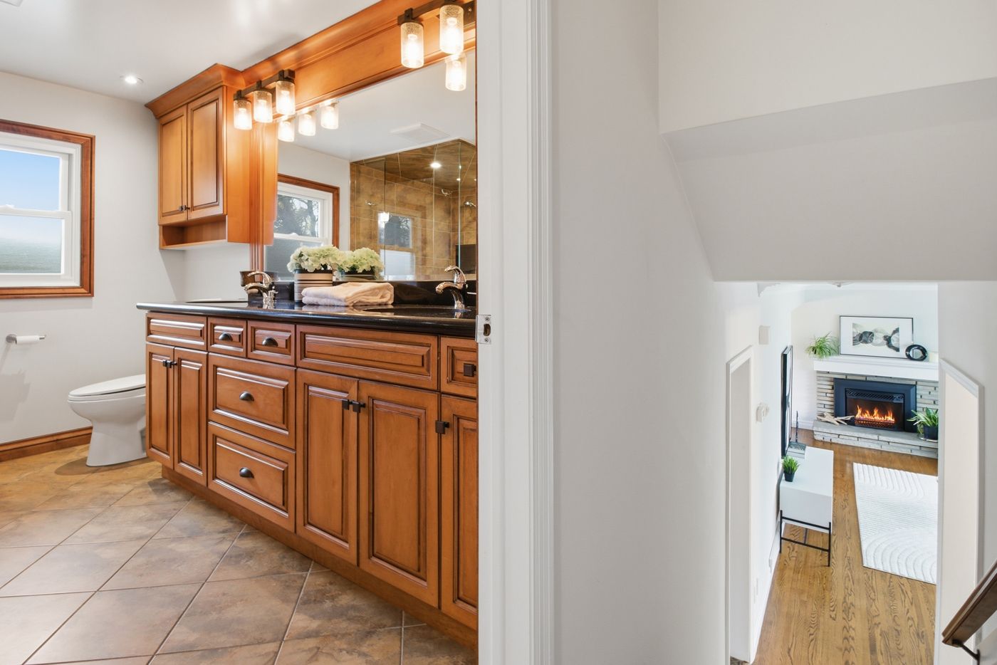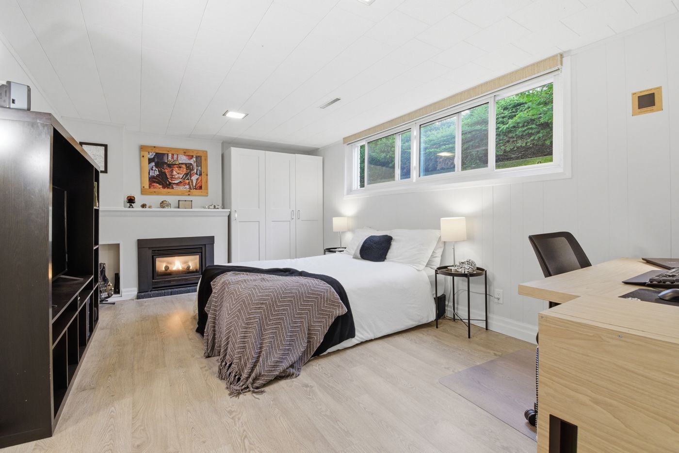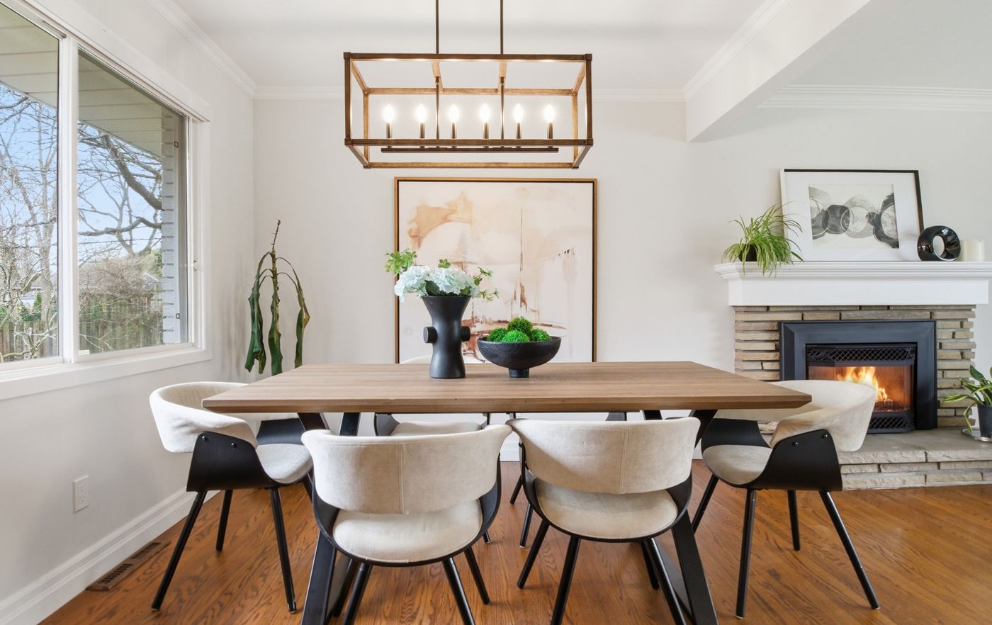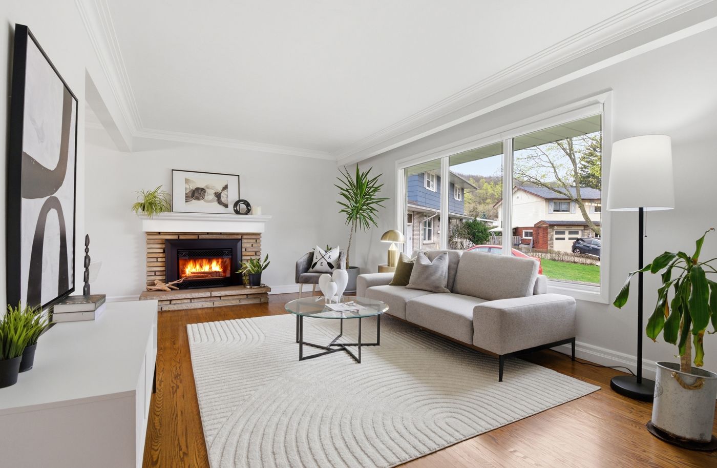 • Bright main floor with large windows and a cozy fireplace.