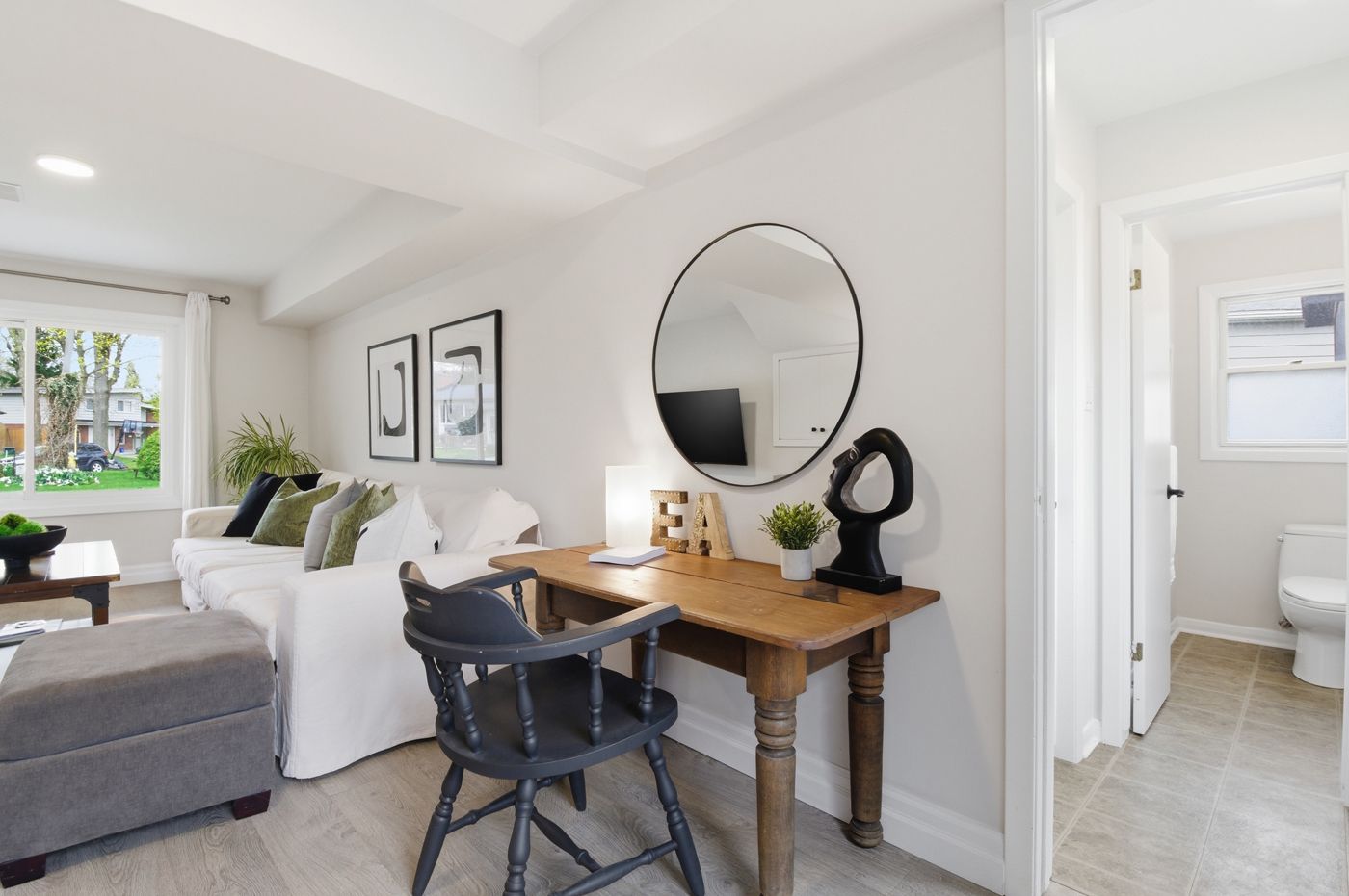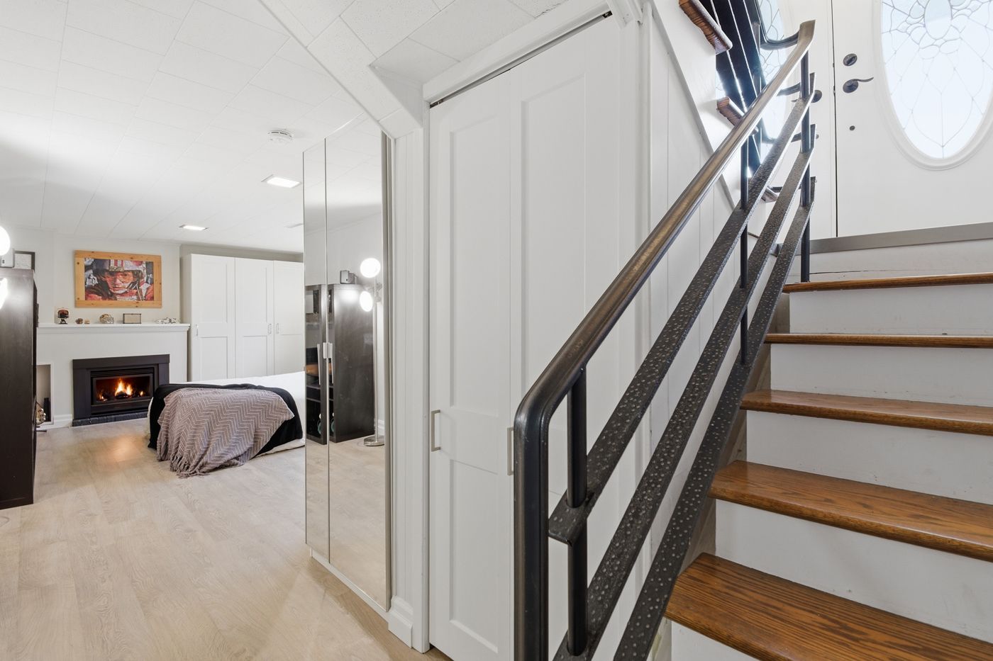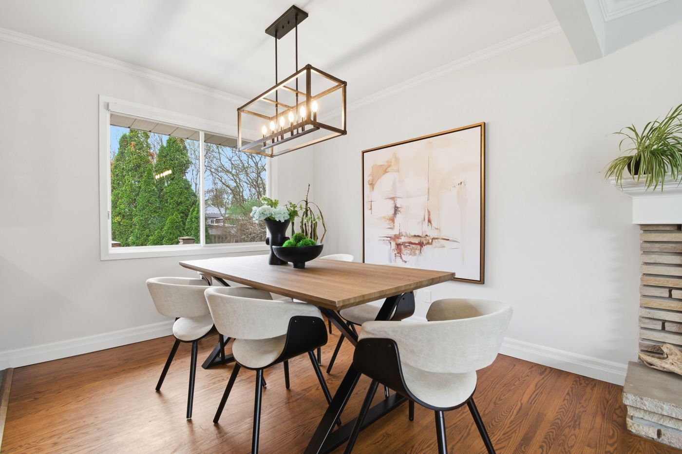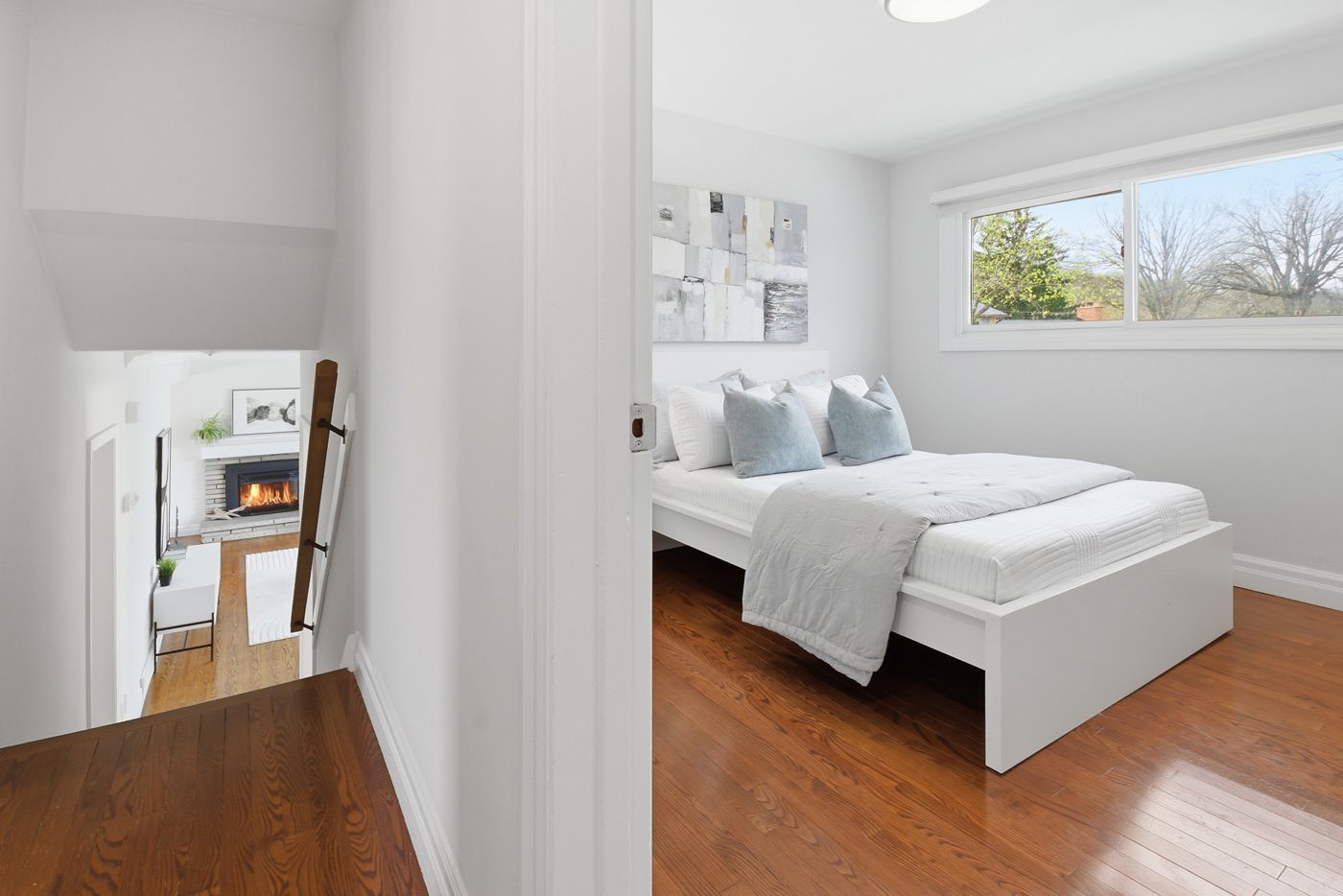• Bright main floor with large windows and a cozy fireplace.