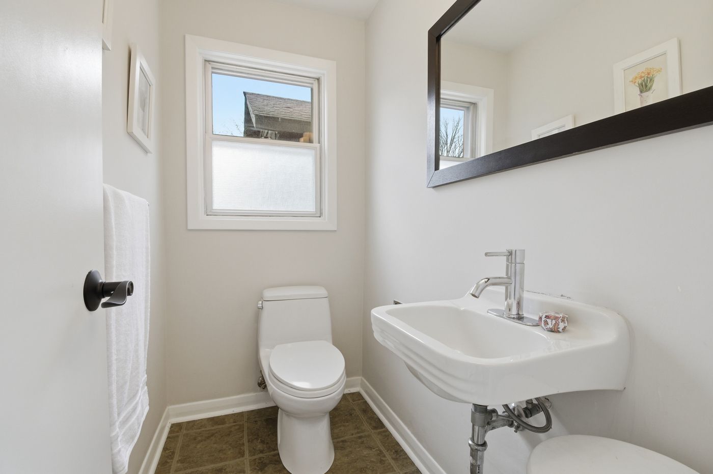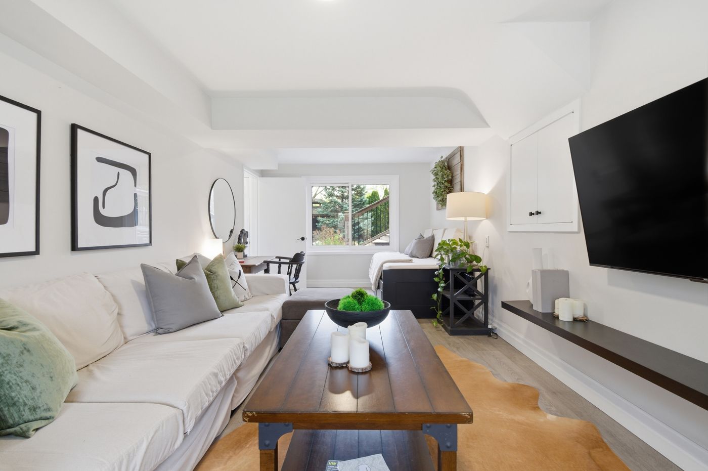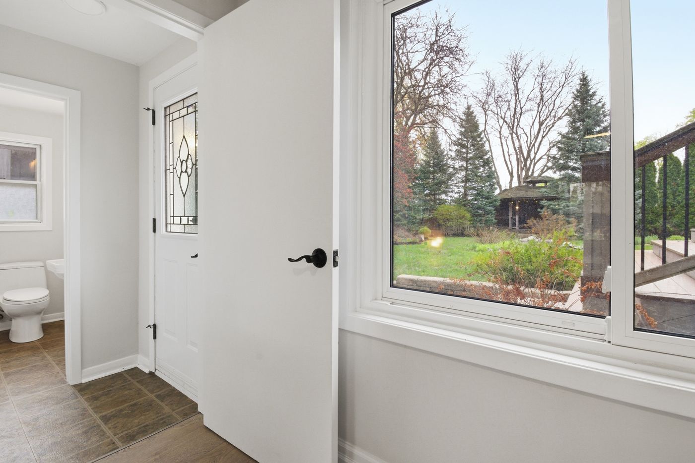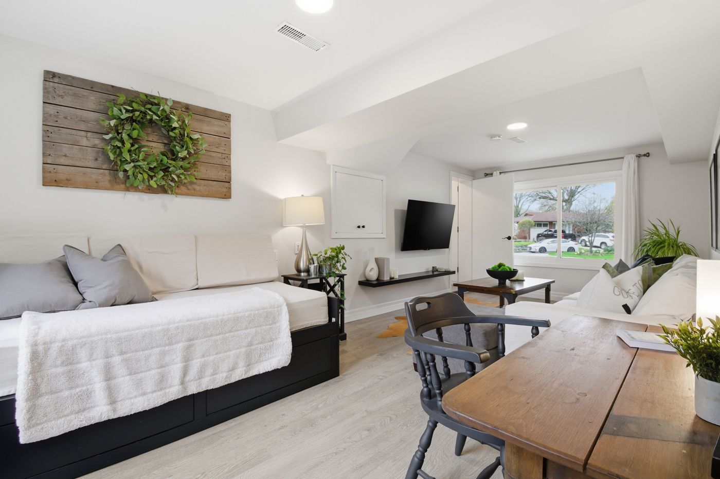 • Bright main floor with large windows and a cozy fireplace.
