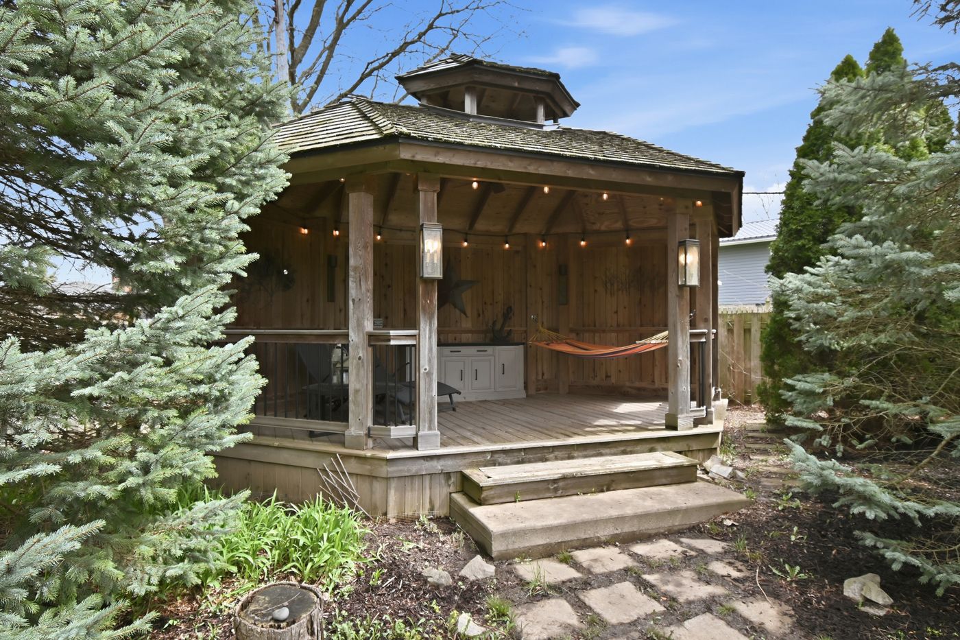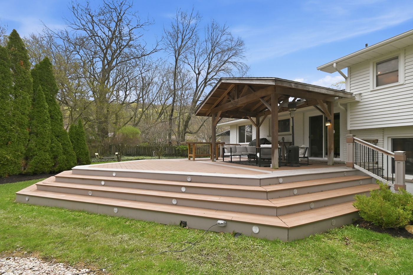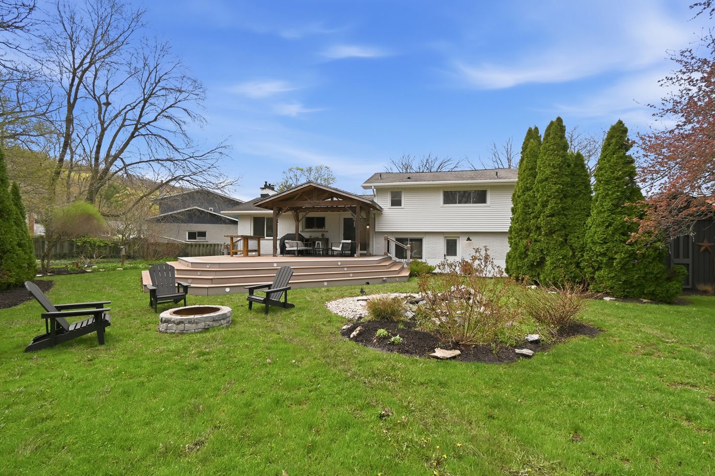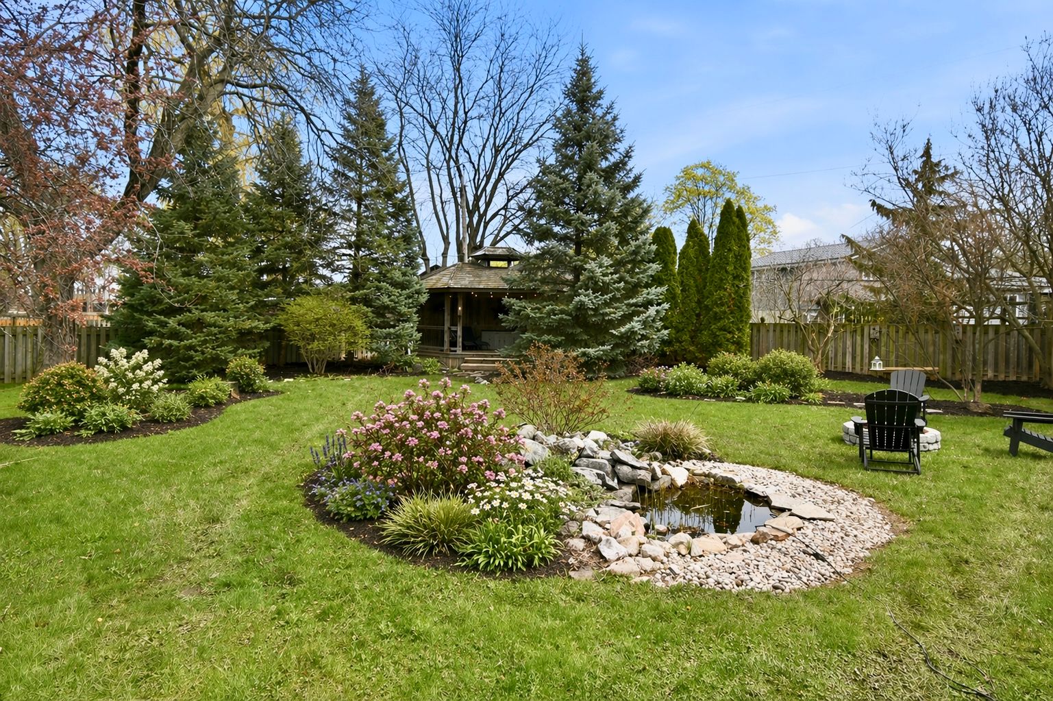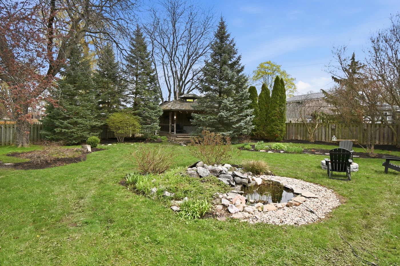 • Private backyard retreat with deck, gazebo, fire-pit, and pond views.