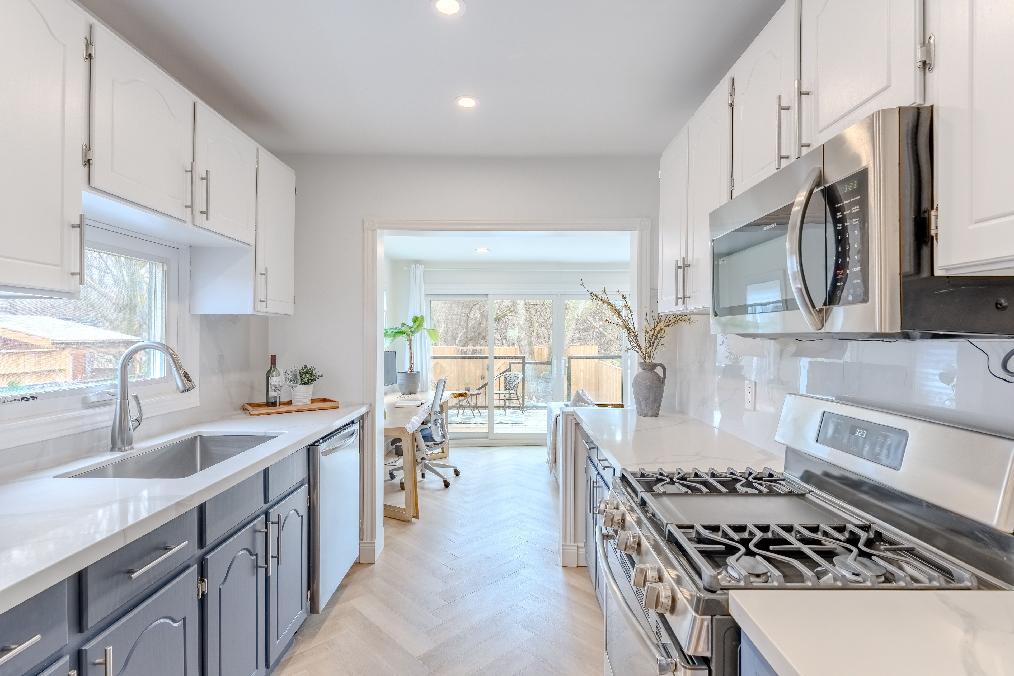 • Sun-filled rooms with updated herringbone flooring for a warm feel.