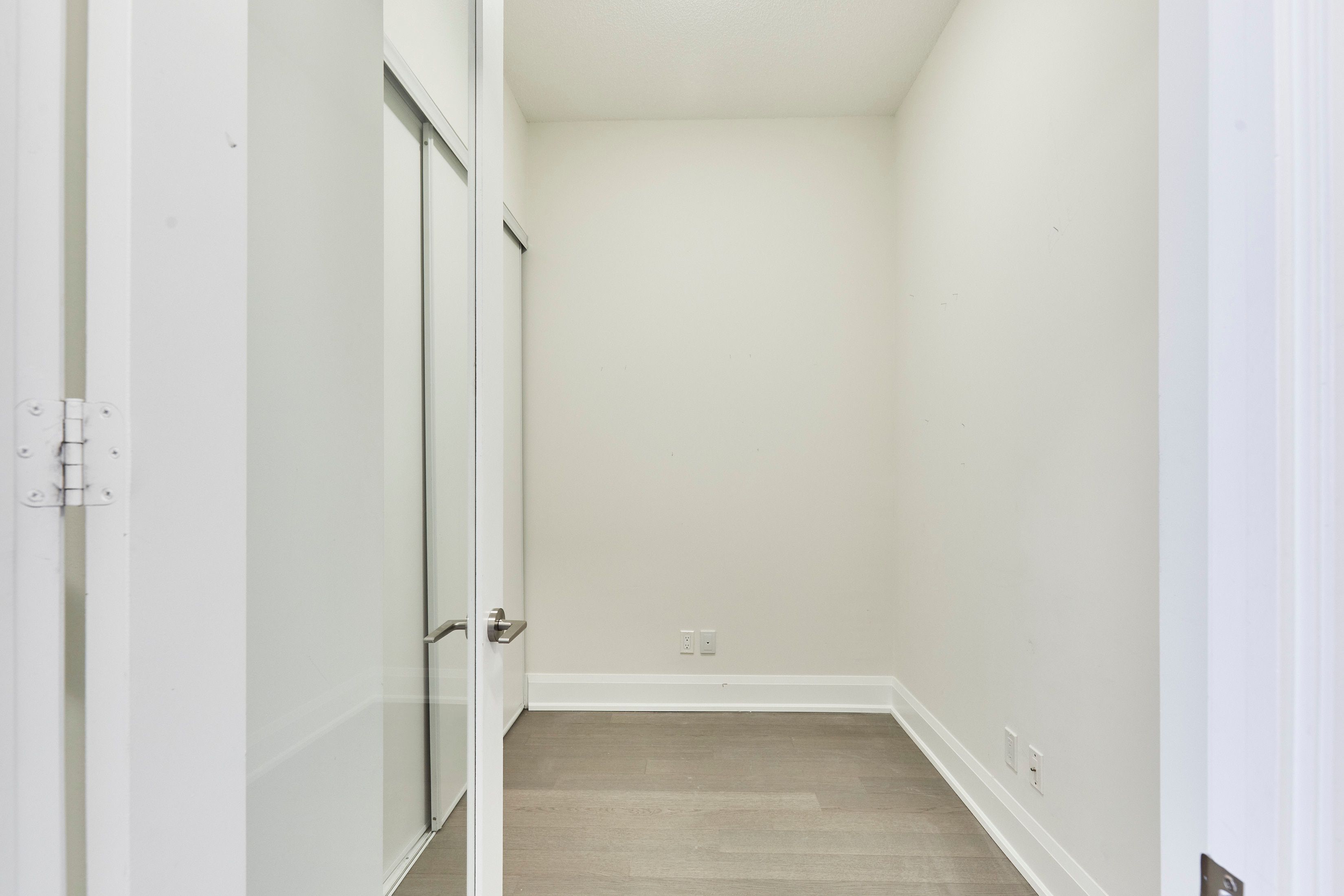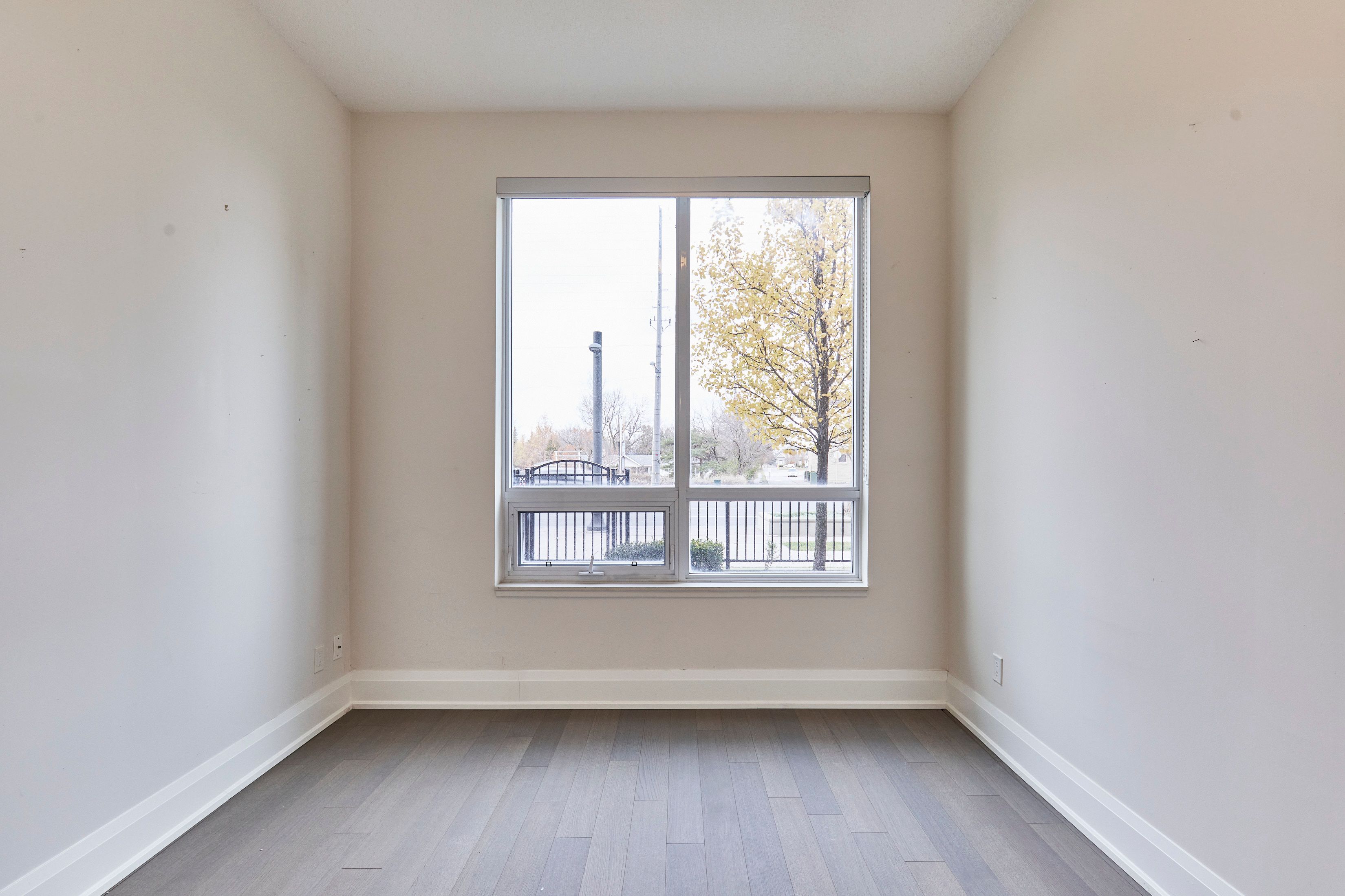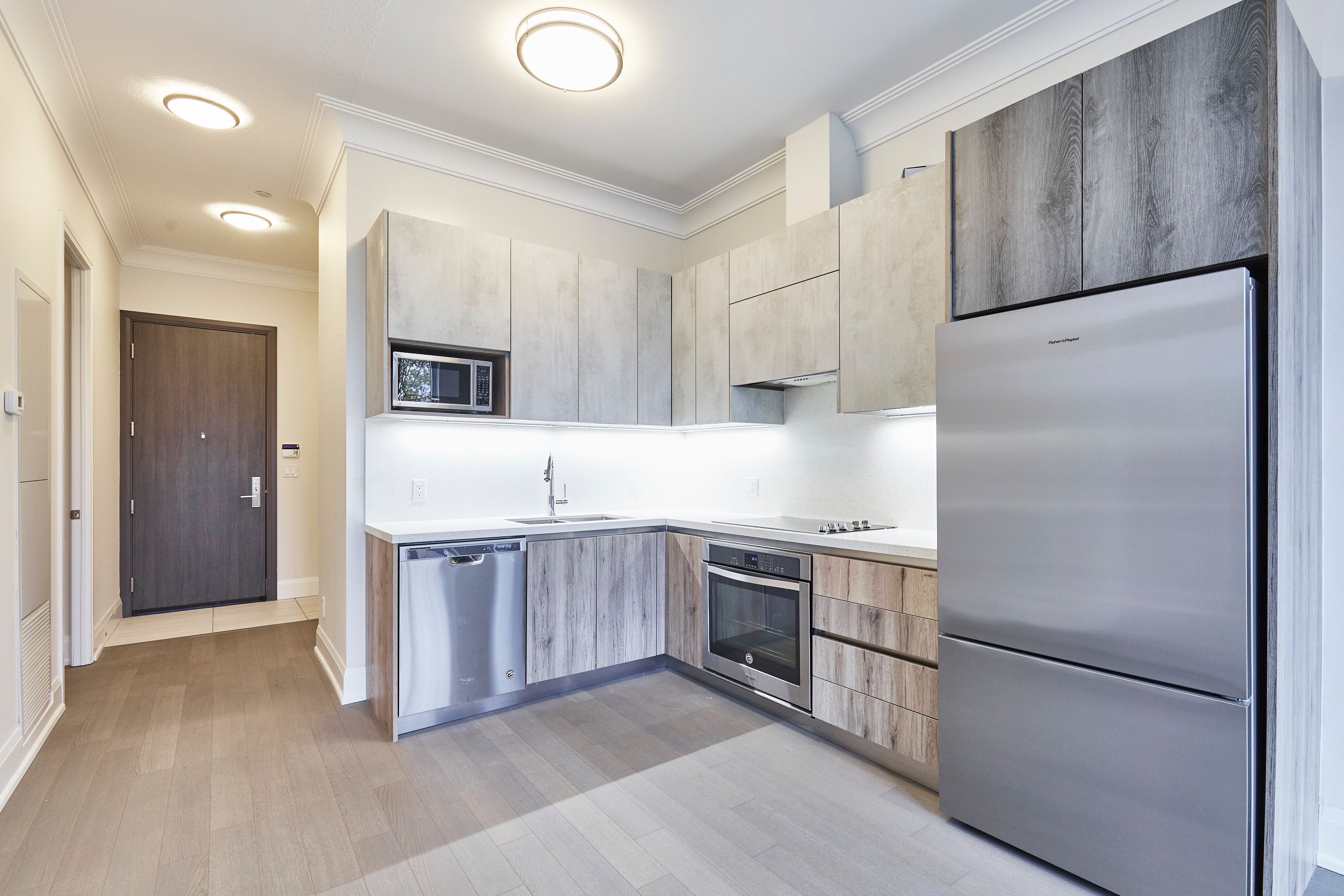 • High ceilings and laminate flooring create a spacious feel.