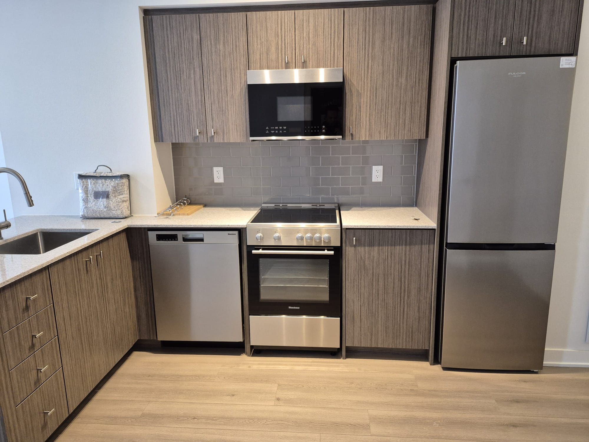 Brand new, never lived-in 1-bedroom condo in one of kitchener's most luxurious buildings - duo condos at the highly sought-after station park community by vanmar developments. This spacious unit features an open-concept layout with a modern kitchen and bright living area, along with a walkout to a private balcony offering unobstructed views. Convenient in-suite laundry for everyday use. Residents enjoy access to exceptional amenities, including a fully equipped fitness centre, peloton/yoga studio, bowling lounge, swim spa with hot tub, sauna, and a skydeck outdoor gym, among many others. Ideally located in the heart of downtown kitchener, just steps to shopping, restaurants, public transit, google, and the innovation district. A perfect blend of modern comfort and urban convenience. Includes 1 parking space. Heat and internet are included in the rent.
