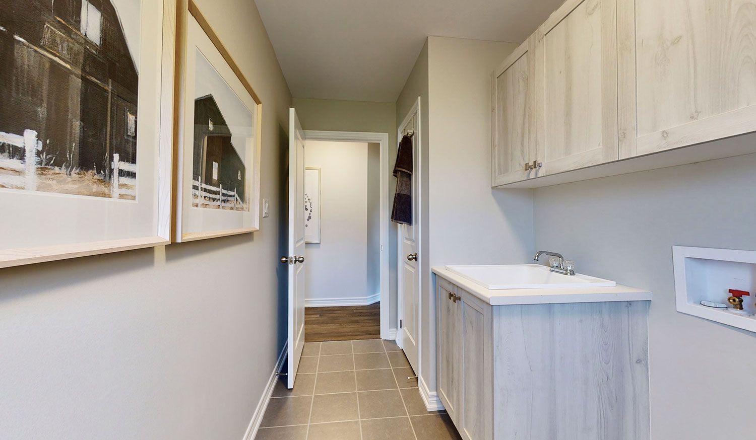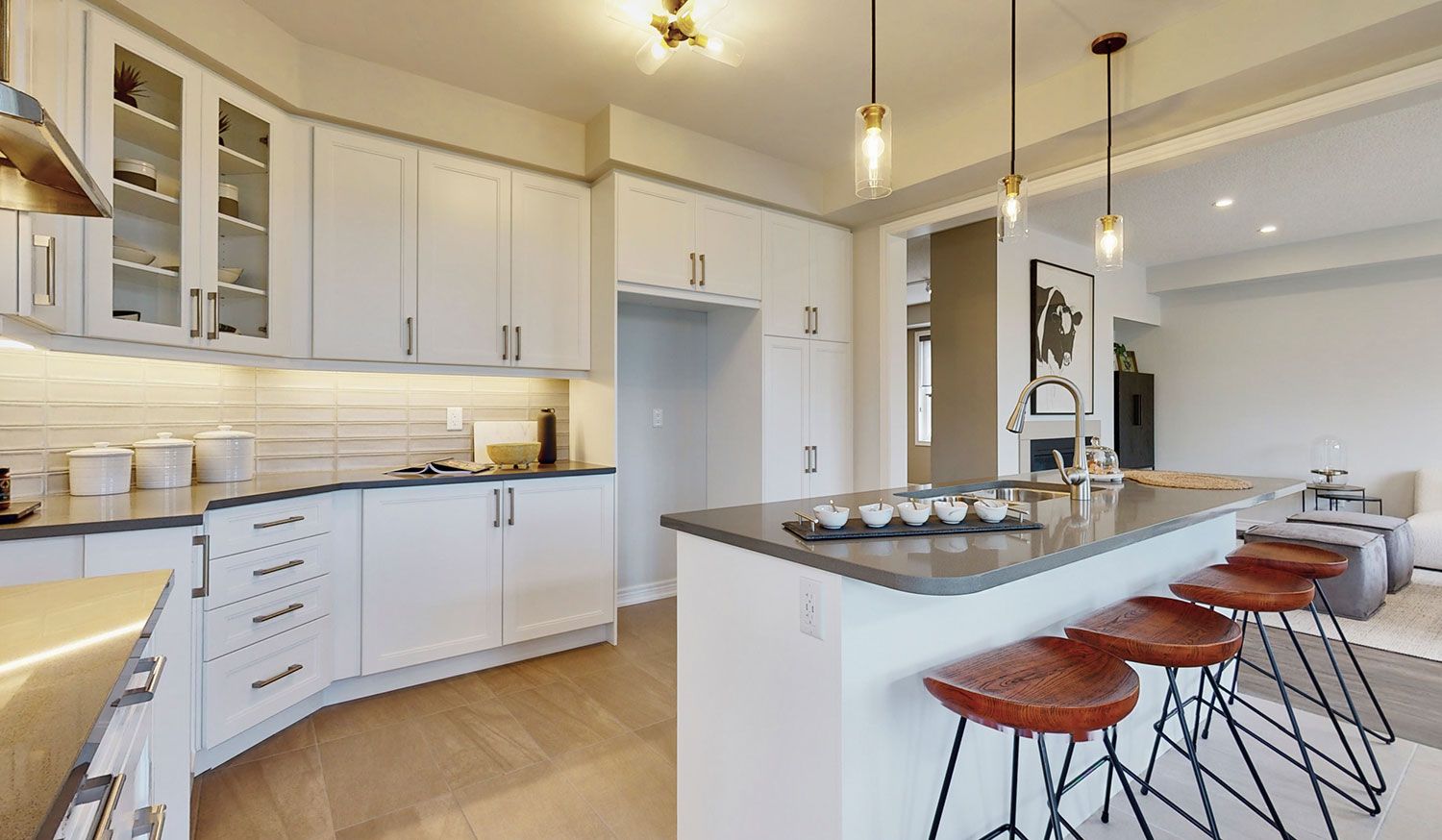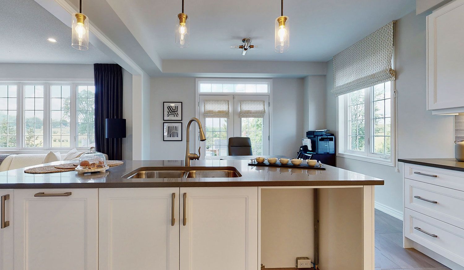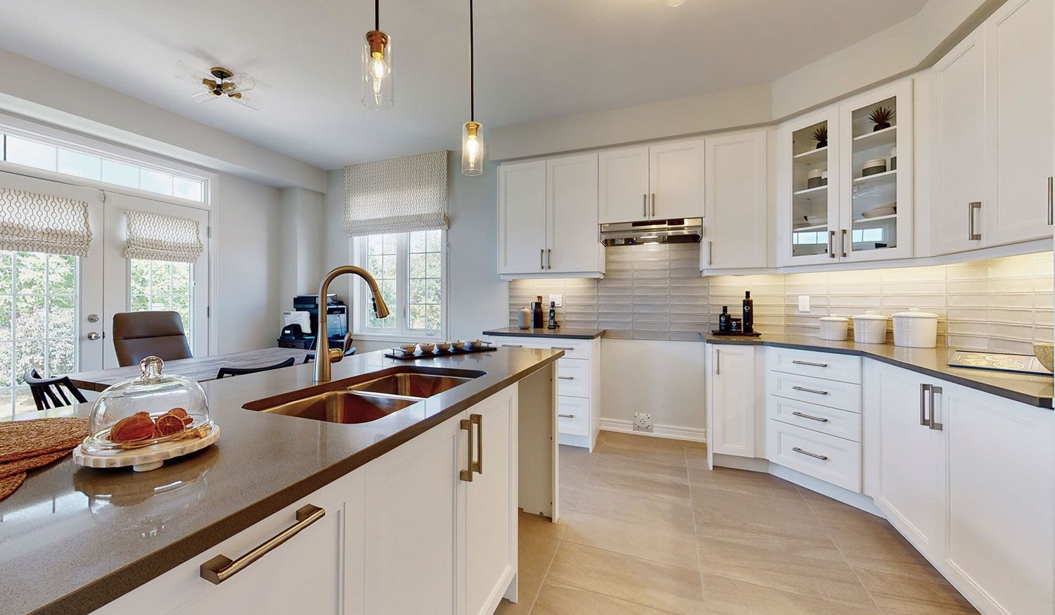 • Bright country kitchen with quartz countertops and plenty of storage.