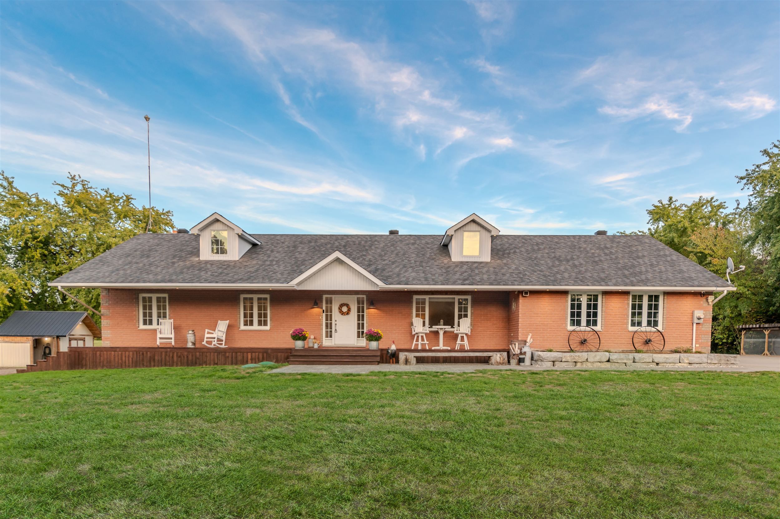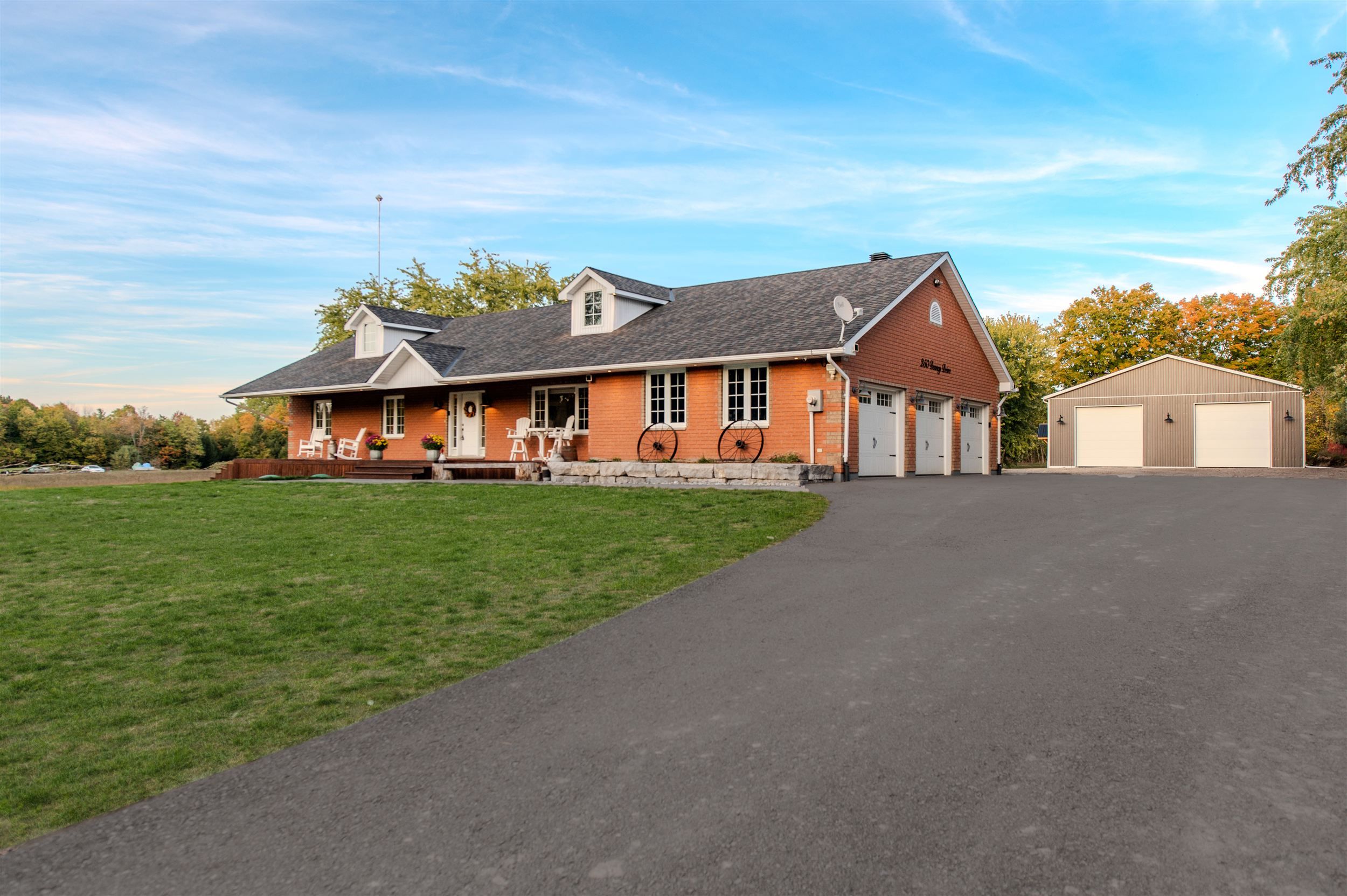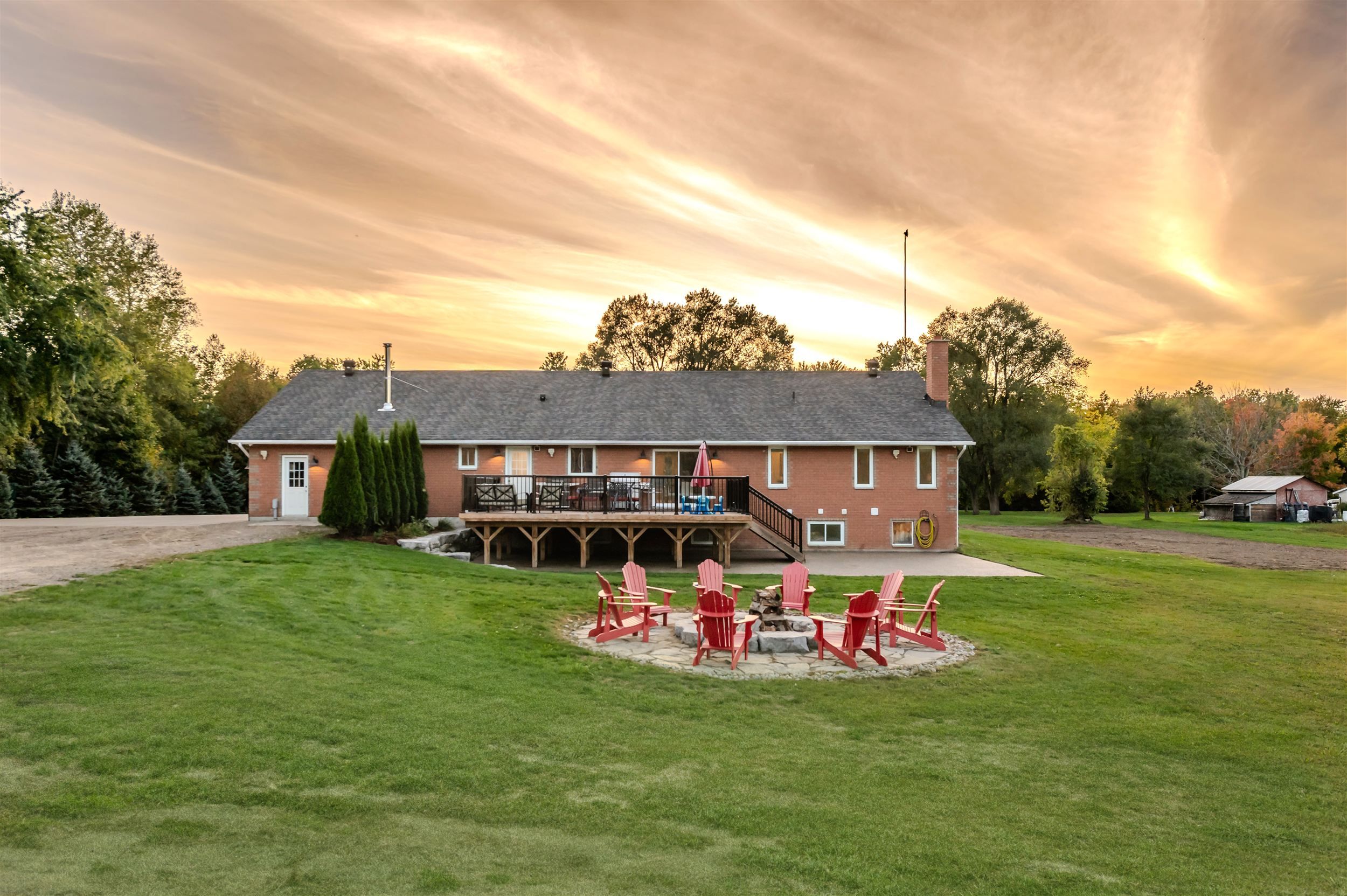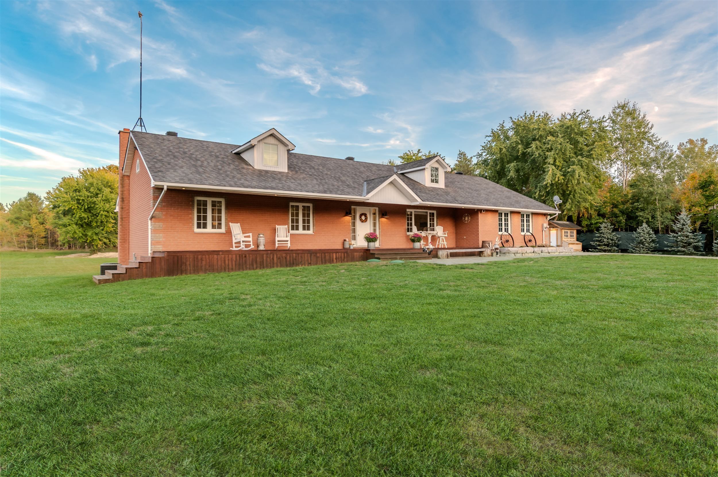 10 acres with incredible workshop & charming brick bungalow! Large 5000 sq. Ft. Detached workshop is ideal for car enthusiasts, truckers, contractors or anyone craving additional space and privacy. This property is a rare opportunity offering both a comfortable home and a massive workshop -aprofessionally engineered structure with 16 ft ceilings, equipped with a 200 amp service andfeatures 3 oversized 14' by 14' garage doors, 1 additional 10' 12' door, and 2 metal mandoors. Endless potential for storage or hobby use. The interior of the home features 3spacious bedrooms floor plus 3 fully renovated bathrooms on the main level. Open-conceptfamily room with electric fireplace, pot lighting and hardwood floors. Generous kitchen withcenter island, breakfast bar, and large eating area with walk-out to deck. Partially finishedlower level with additional bedrooms, 4-piece bathroom and flexible space to create a largerecreational room, games area, or home gym with separate entrance via garage. Professionallylandscaped with garden beds, composite deck and flagstone firepit area. Huge approx. 1200sq. Ft. Aggregate concrete patio-perfect for entertaining. Interlock front walkway with 80mmpavers. Chicken coop with run & power plus goat pen with coop- ideal for a mini hobby farm. Attached double car garage and expansive asphalt driveway with ample parking for multiplevehicles. Great location, approximately 15 minute drive to highway 400! Whether you arelooking for peaceful rural living or need a property with a serious workshop space, this oneof-a-kind bungalow checks all the boxes. Don't miss your chance to make this exceptionalproperty yours! Workshop can be used to generate income, can be usedto store boats, rig's or cars! A rare find!