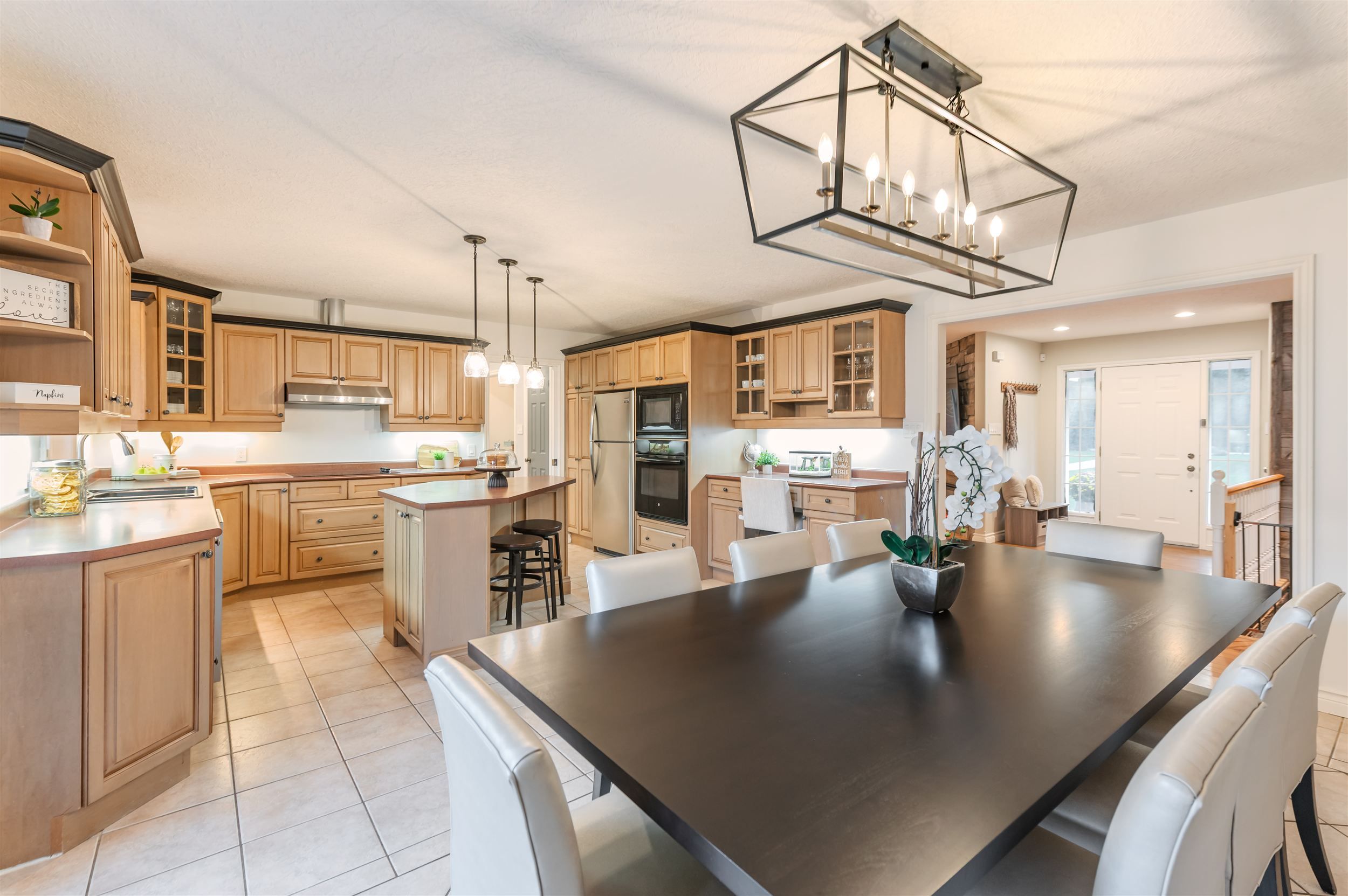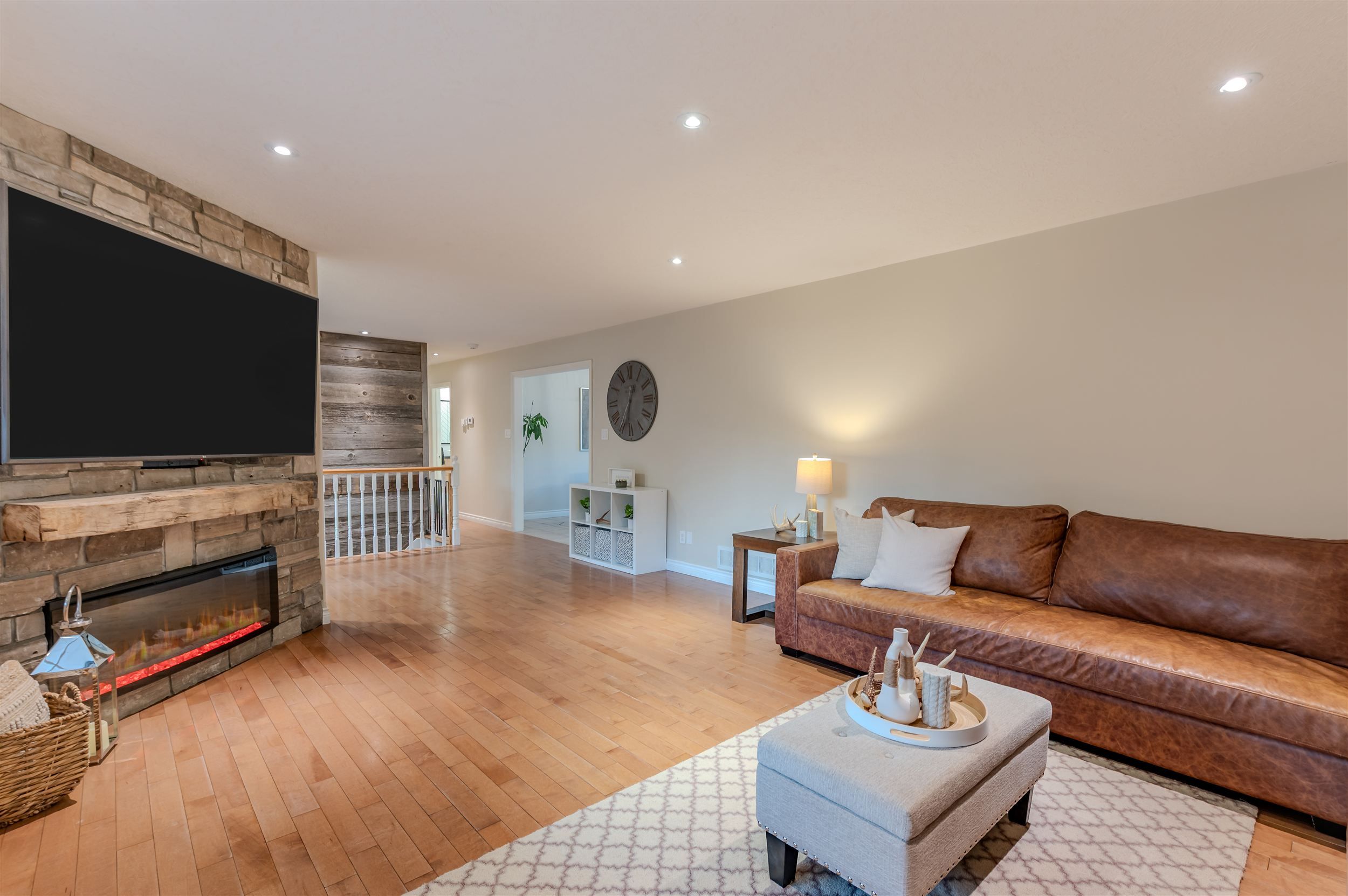 • Open-concept living area with electric fireplace and hardwood floors.