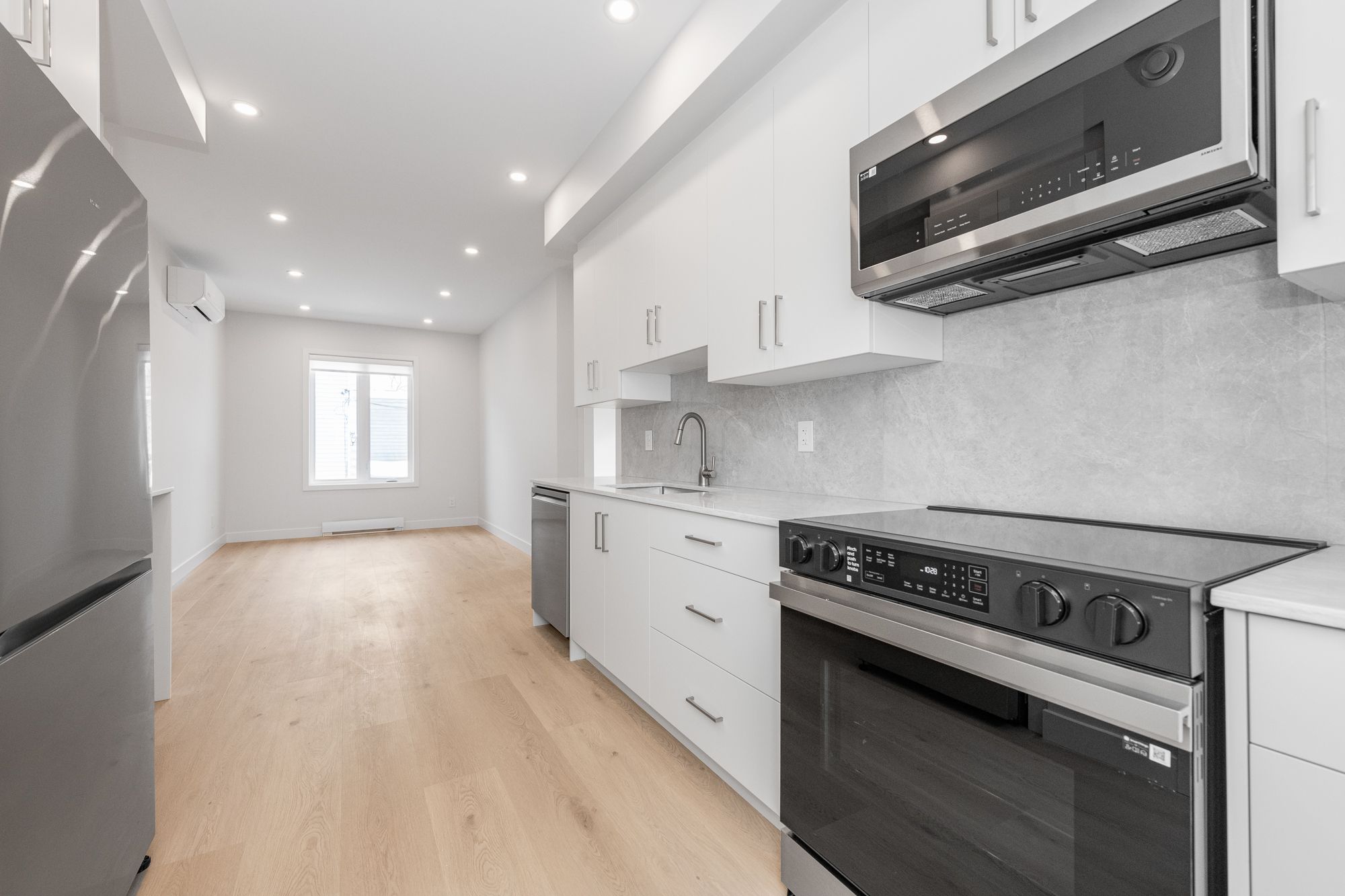 • Modern kitchen with quartz counters and stainless steel appliances.