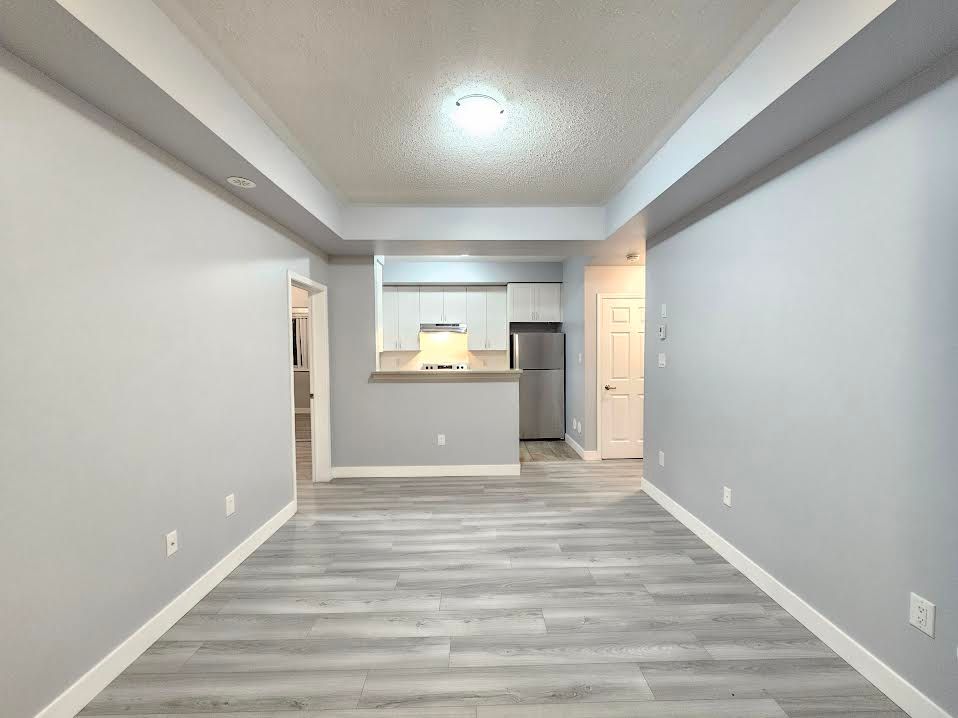 Excellent location !! Corner end unit !! 2 bedroom condo stacked town house, open concept & bright with a patio, perfect for small family. Spacious kitchen with a breakfast bar. Freshly painted & laminate floor throughout. 1 parking space included. Features w/ visitor's parkings, nostairs, ensuite laundry, front yard for bbq, few mints to all schools, library, hospital, banks, plaza, chalo-freshco, public transit& highway 410.