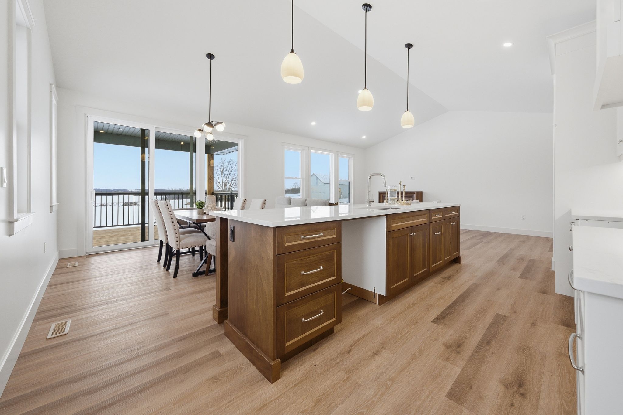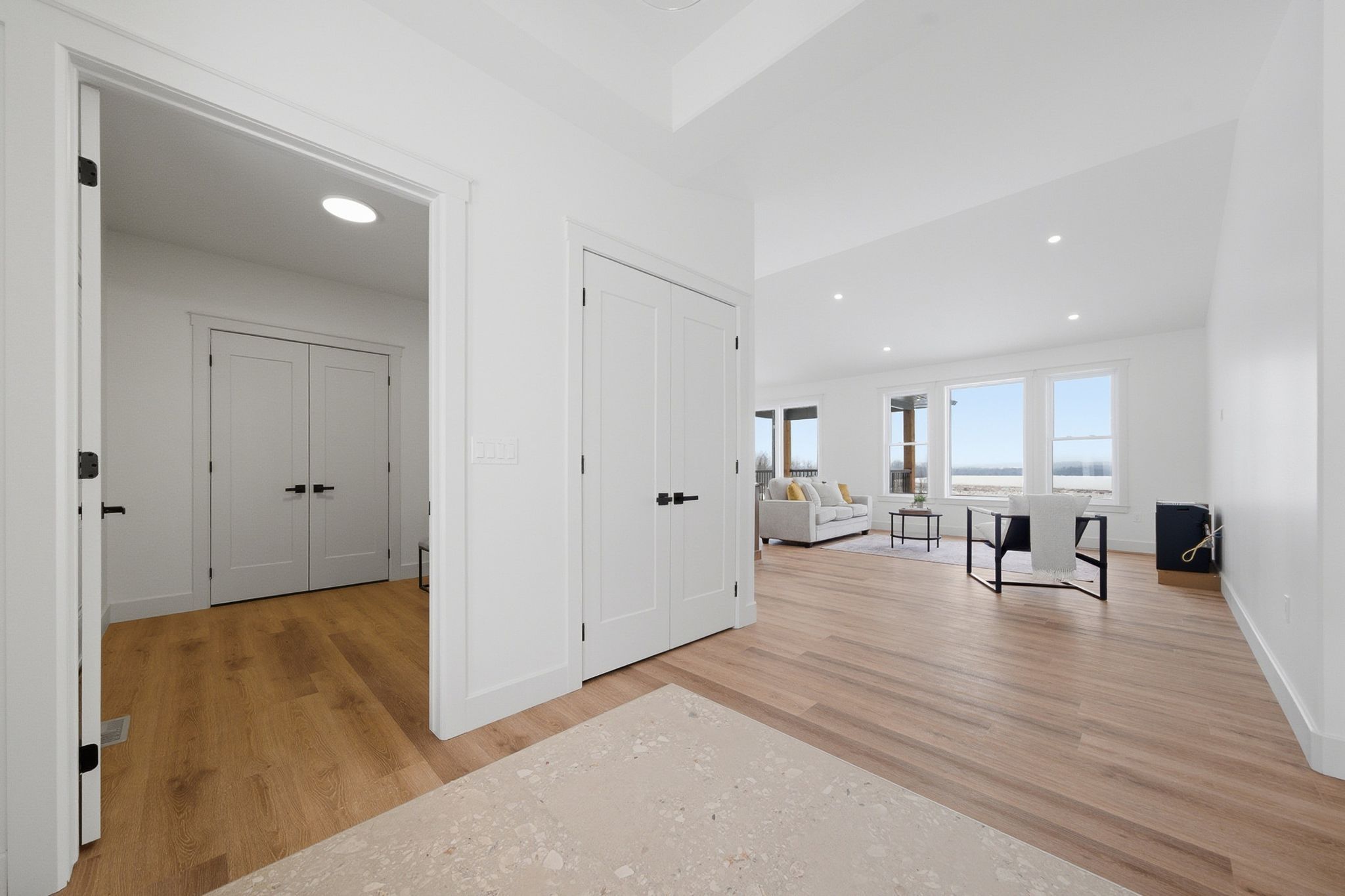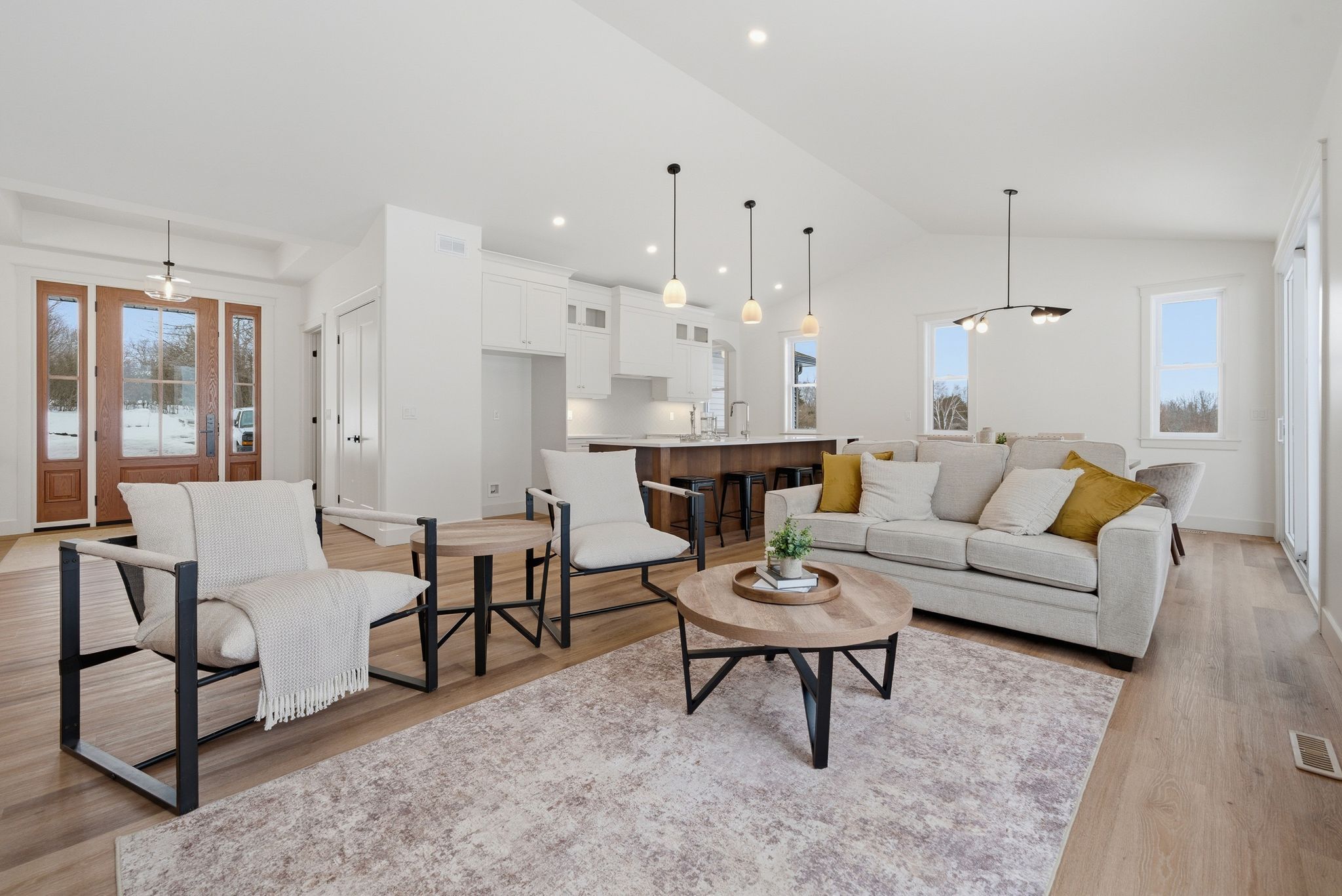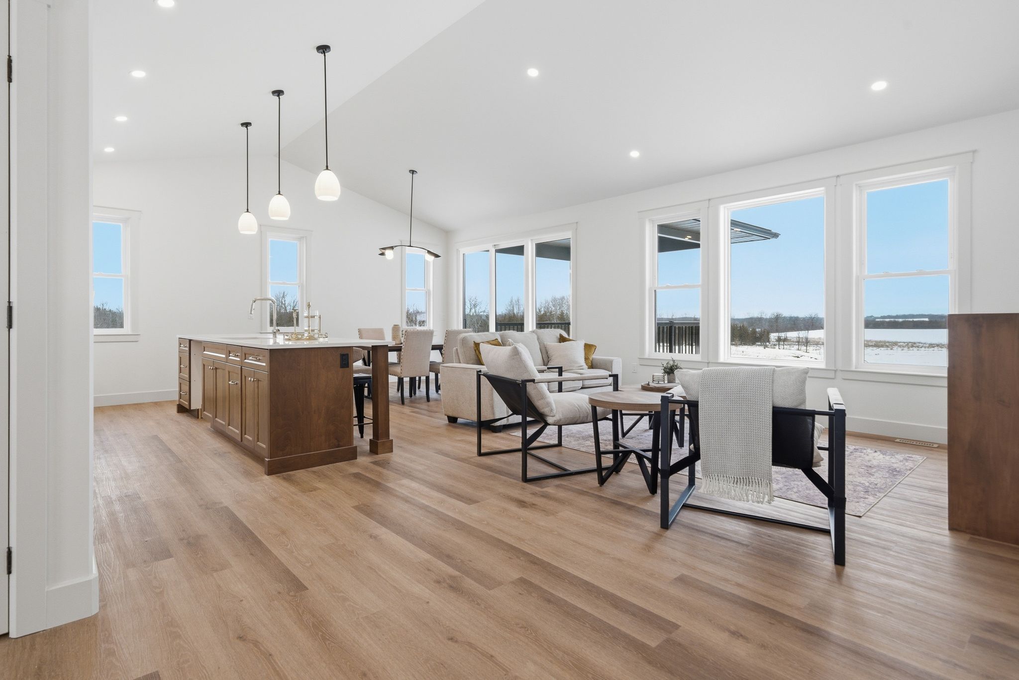 • Bright open-concept living space with large windows and vaulted ceilings.