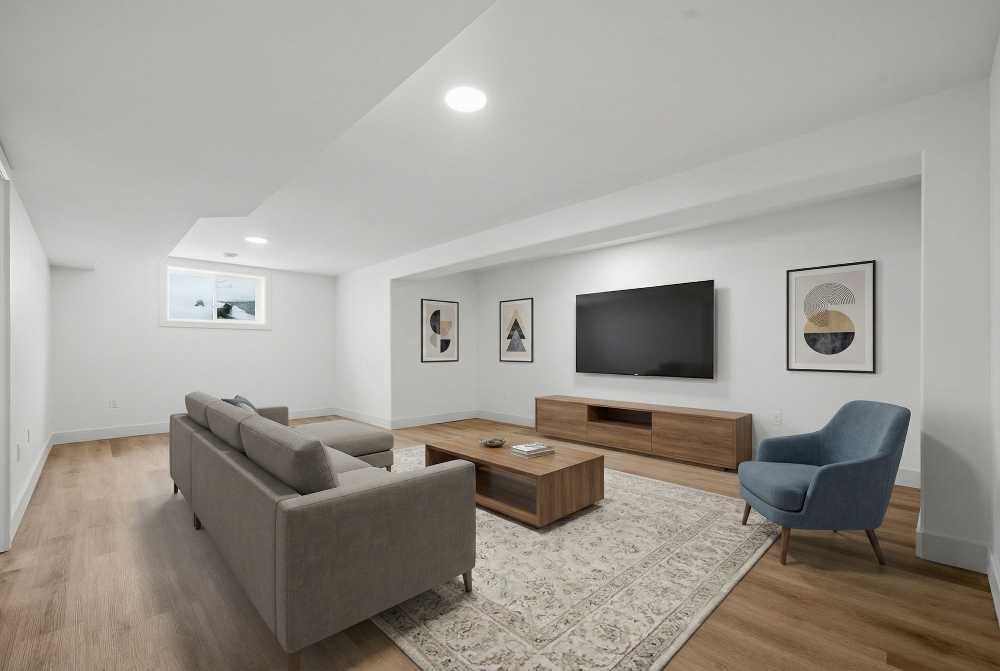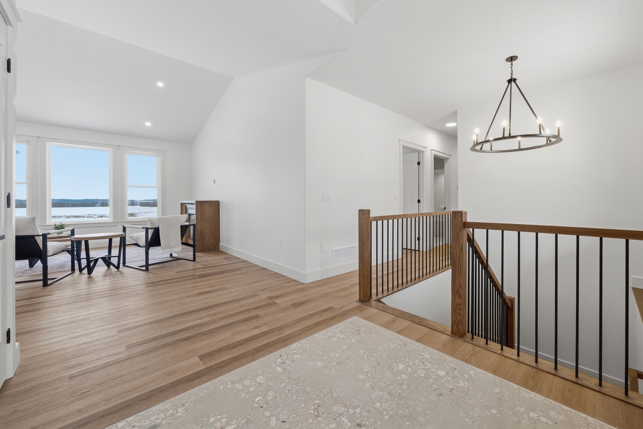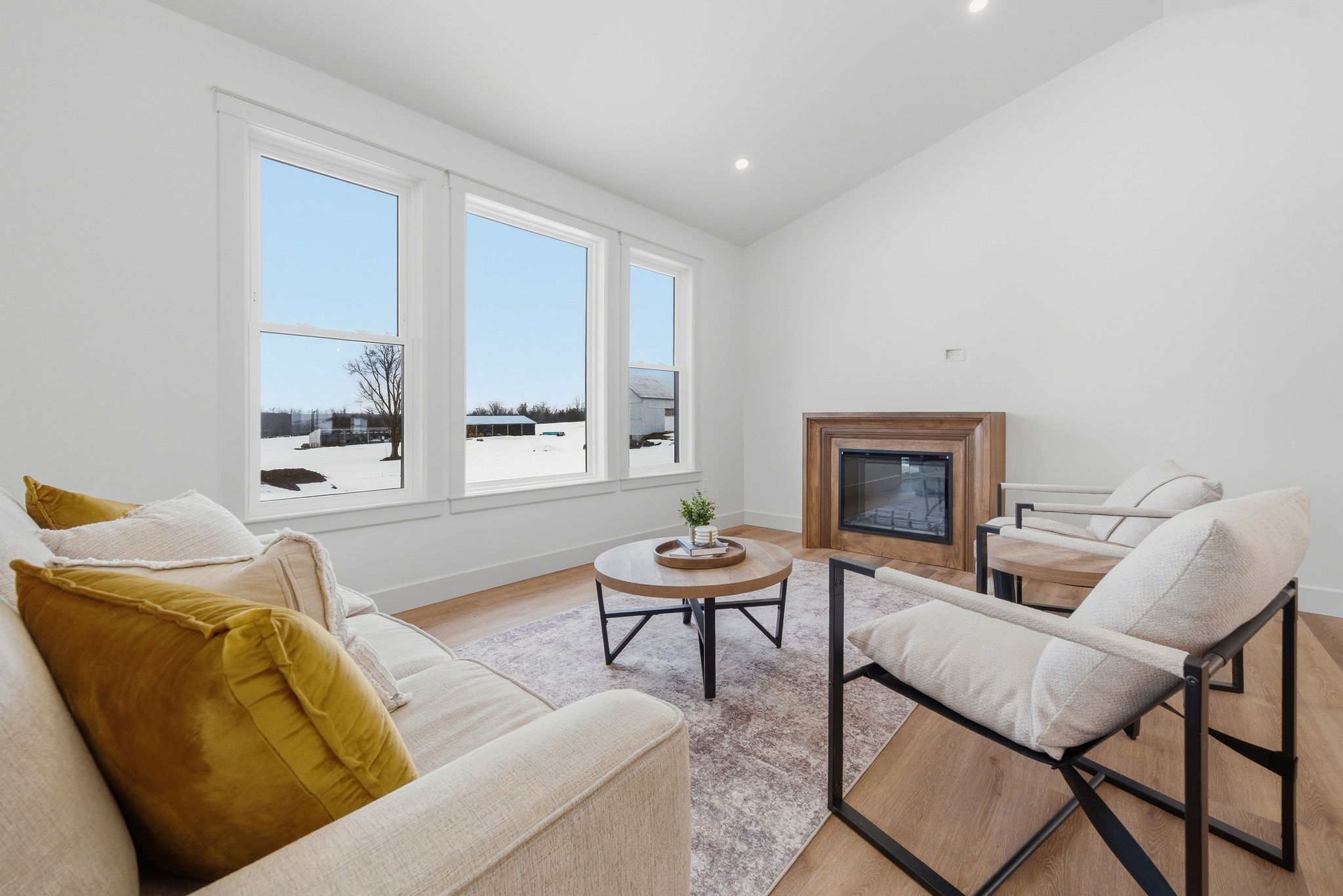 • Bright open-concept living space with large windows and vaulted ceilings.