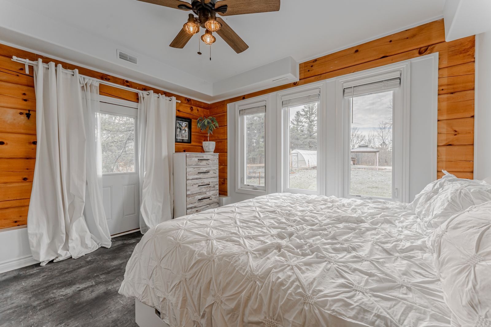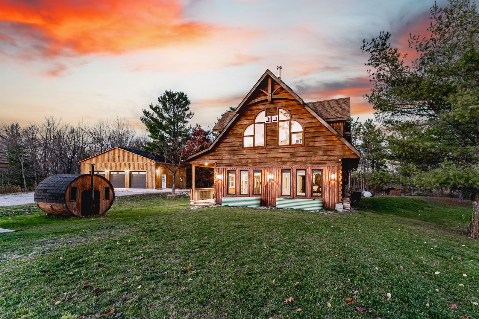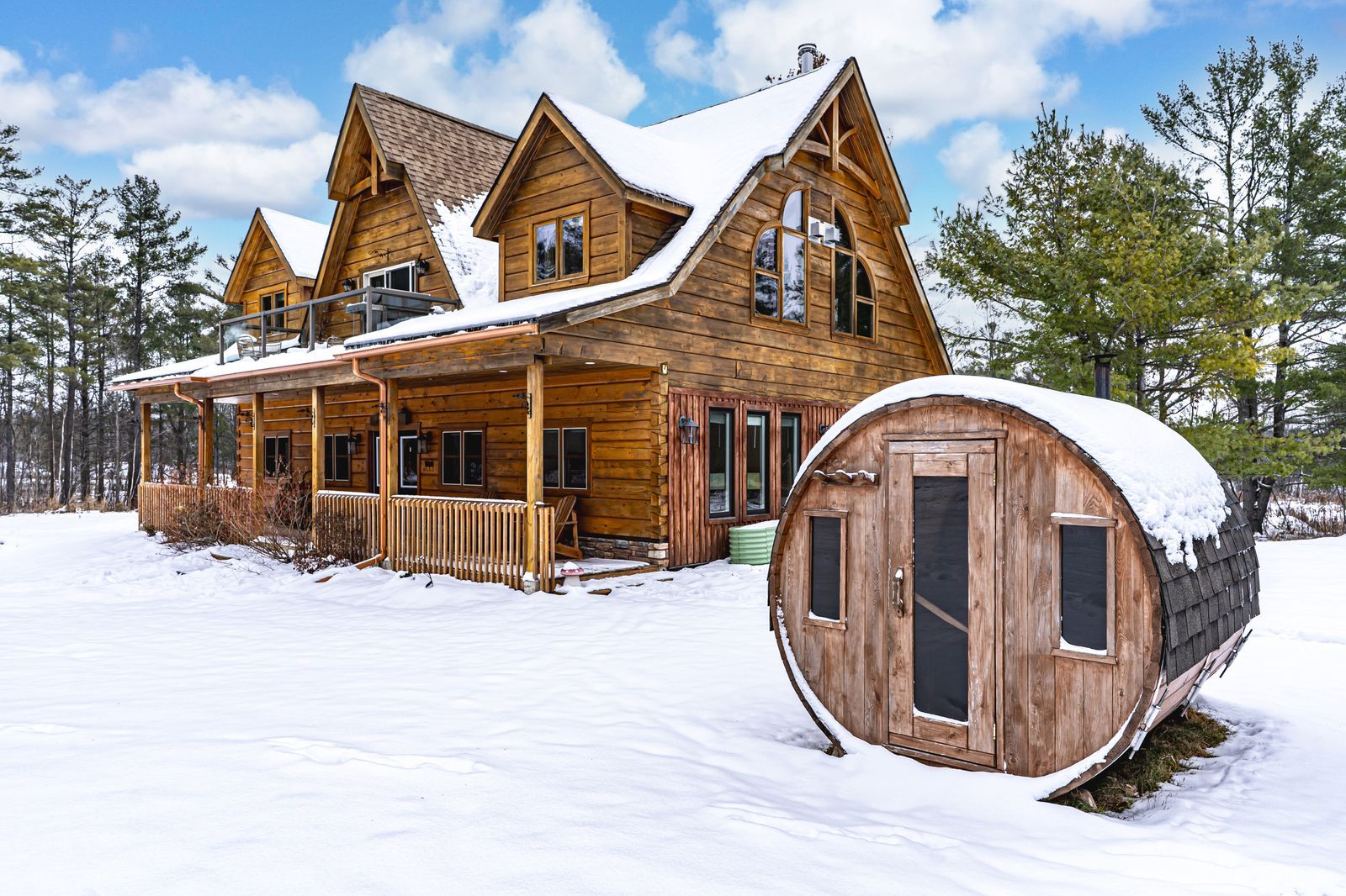 100 acres of natural beauty & a luxuriously updated log home with owned solar panels & versatile outbuildings including an oversized heated triple car garage, a sauna, shed, 26ft planta metal greenhouse, chicken coop, pump house, a hunt camp & bunkie with a kitchen, bathroom, heating & a/c! Experience true country living in this log home tucked away on 100 acres with ponds, trails, and forest views, offering the ultimate in peace, privacy, and natural beauty. Showcasing timeless rustic charm, this home features a freshly re-stained log exterior and a full-length front porch, perfect for taking in the serene surroundings. Possibilities are endless with the bunkie- ideal for business or rental use and potential for severance. Outdoor living shines with a sauna, hot tub, chicken coop, fruit trees, garden beds, and a summer gazebo for unwinding in the fresh air. The main level features a cozy family room with a propane fireplace, two bedrooms with walkouts, including a luxurious primary suite with a 5-piece ensuite, a 3-piece bathroom with heated floors, and a flexible office space. The upper level boasts vaulted ceilings, engineered hardwood, and an open-concept kitchen and dining area with quartz counters, tile backsplash, a large island, and stainless steel appliances. The great room features a wood fireplace, statement windows, and a balcony walkout with forest views, plus an additional bedroom and a renovated 5-piece bath. Recent upgrades include fresh interior paint, led lighting, refinished stairs, brand new flooring, newer door hardware, efficient windows, central vac, and a water filtration system. A solar panel system with battery backup and generator hookups ensures dependable off-grid capability, while newly added bell fibe internet keeps you seamlessly connected. Discover the ultimate retreat where luxury, modern comfort, and nature unite in perfect harmony, creating a truly exceptional #hometostay.