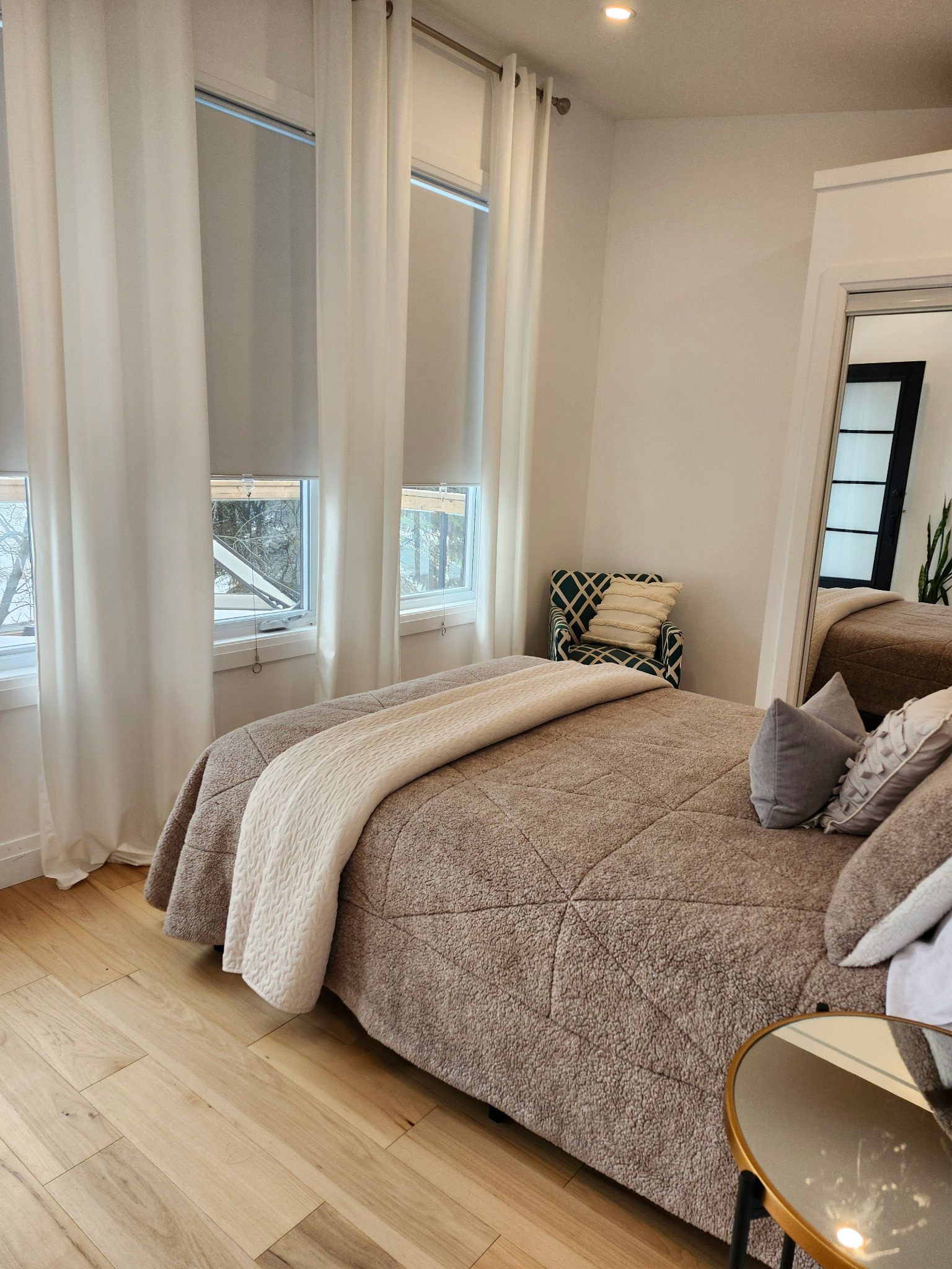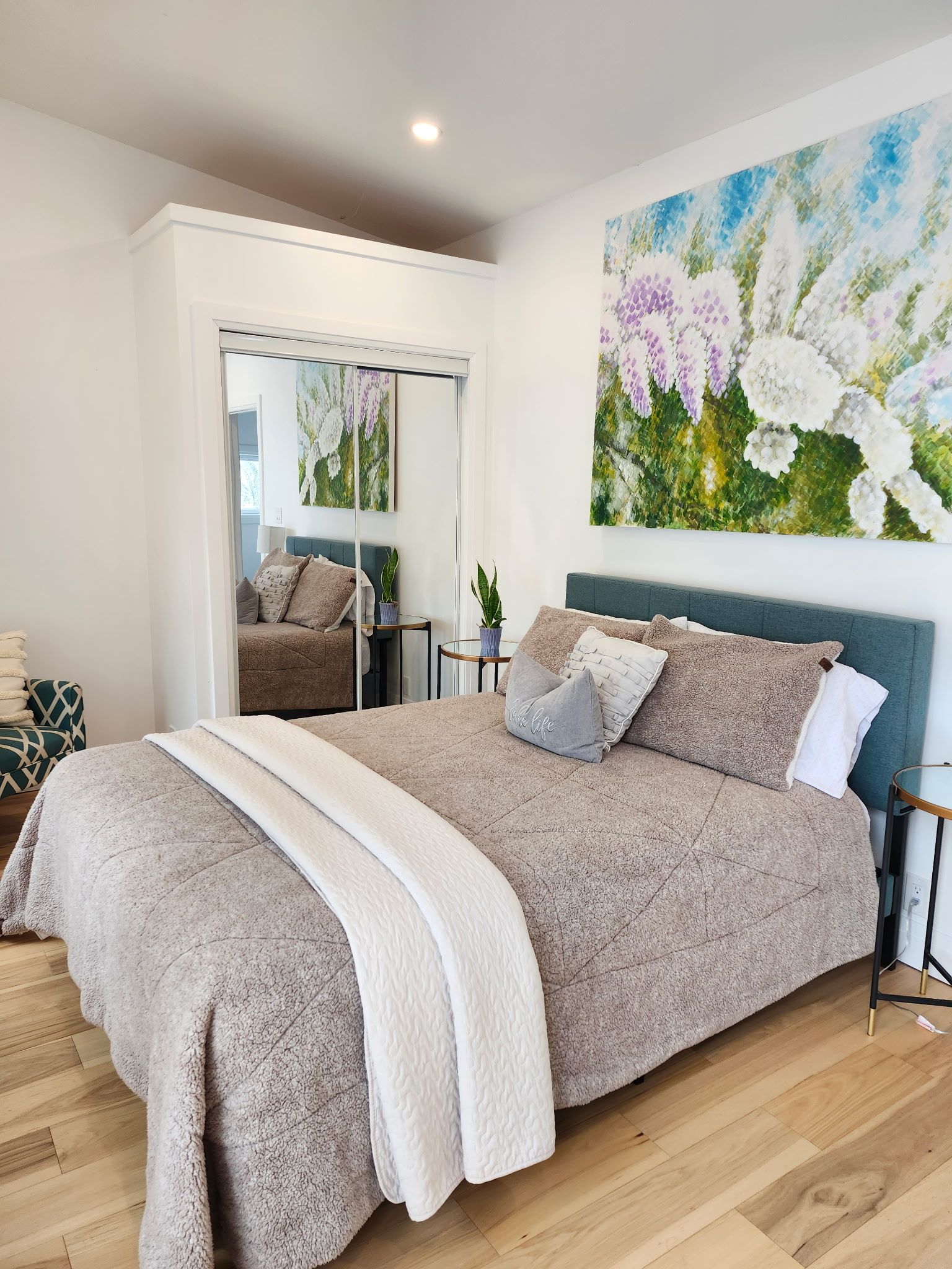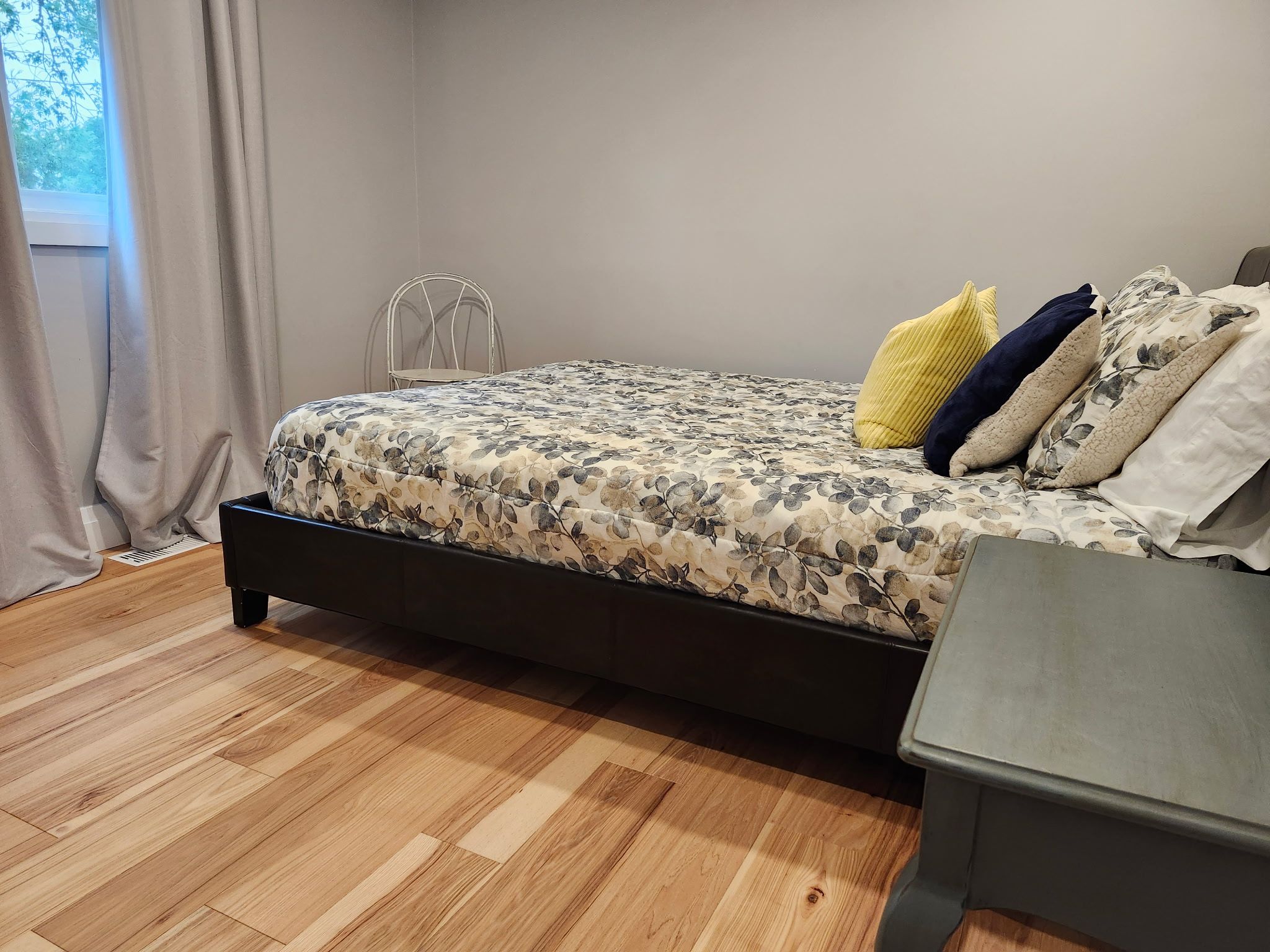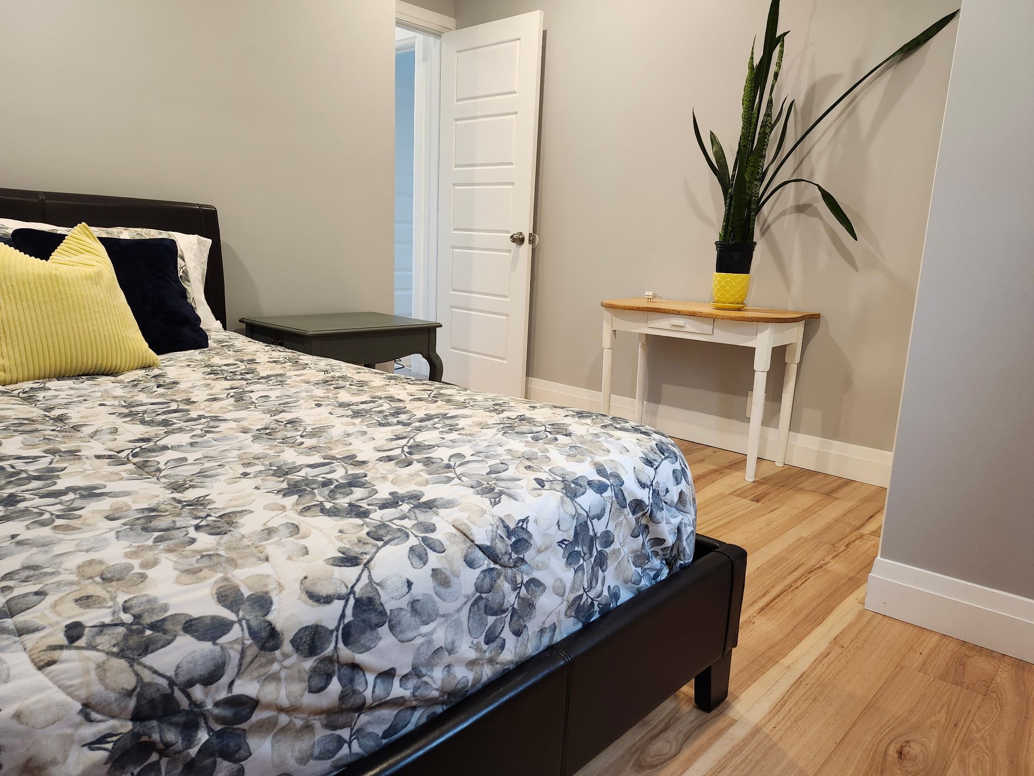 • Primary bedroom offers hardwood floors and a lake view.