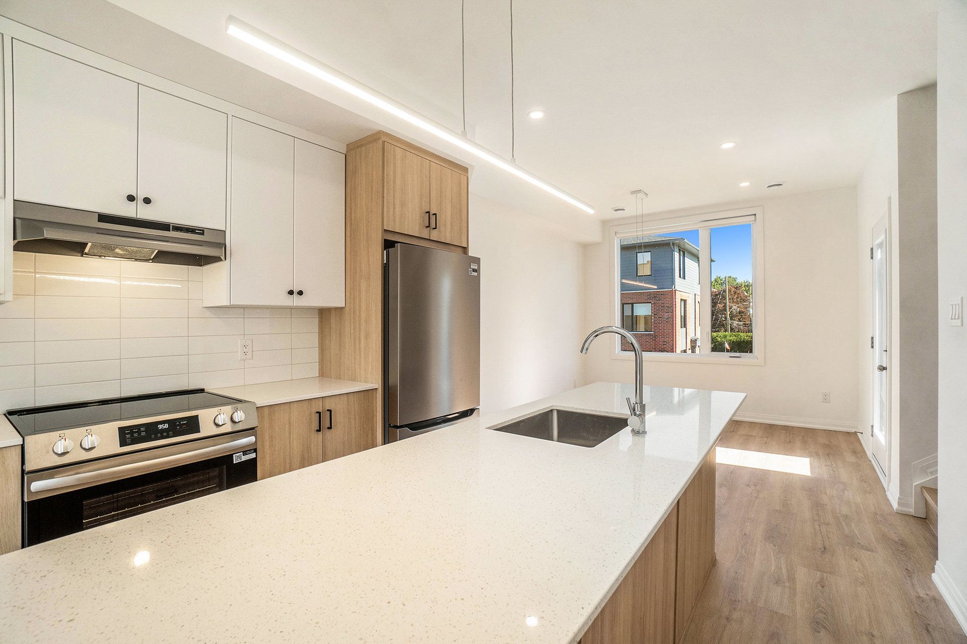 • Sleek kitchen featuring quartz countertops and stainless steel appliances.