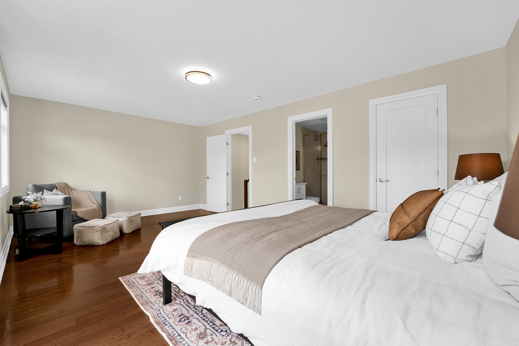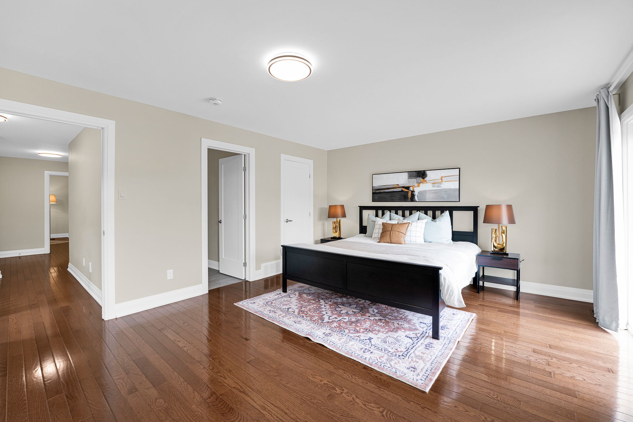 • Bright primary bedroom features a walk-in closet and private balcony.