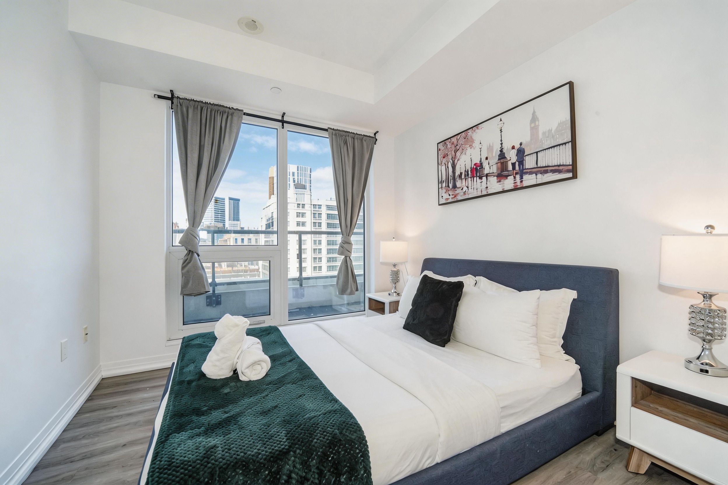 Prime and highly convenient location in the heart of downtown toronto, just steps (approx. 500m) to cf toronto eaton centre and with ttc access right at your doorstep. This bright and well-appointed 2 bedroom, 2-bathroom suite offers approximately 751 sq ft of interior living space, featuring an efficient layout with a primary bedroom complete with a private ensuite and walk-in closet. Both bedrooms are enhanced by large windows, allowing for abundant natural light throughout the day. Ideally positioned within the building, the unit enjoys exceptional exposure with east, south, and west views, creating a sun-filled and comfortable living environment. Step outside to a rare wraparound terrace (approx. 272 sq ft) showcasing stunning southwest city views-perfect for relaxing or entertaining. Currently leased to an airbnb management company at a net monthly rent of $3,180. Tenant is willing to stay or can provide 60 days' notice to vacate, offering flexibility for both investors and end-users. The unit includes one parking space and a conveniently located same-floor locker. Situated close to major amenities including toronto metropolitan university, george brown college, hospitals, banks, and the financial district. Residents enjoy premium building amenities, including a spectacular 16,000 sq ft rooftop terrace, 24-hour concierge/security, visitor parking, and bbq facilities. A fantastic opportunity to own a bright, spacious unit in one of downtown toronto's most desirable and connected locations.