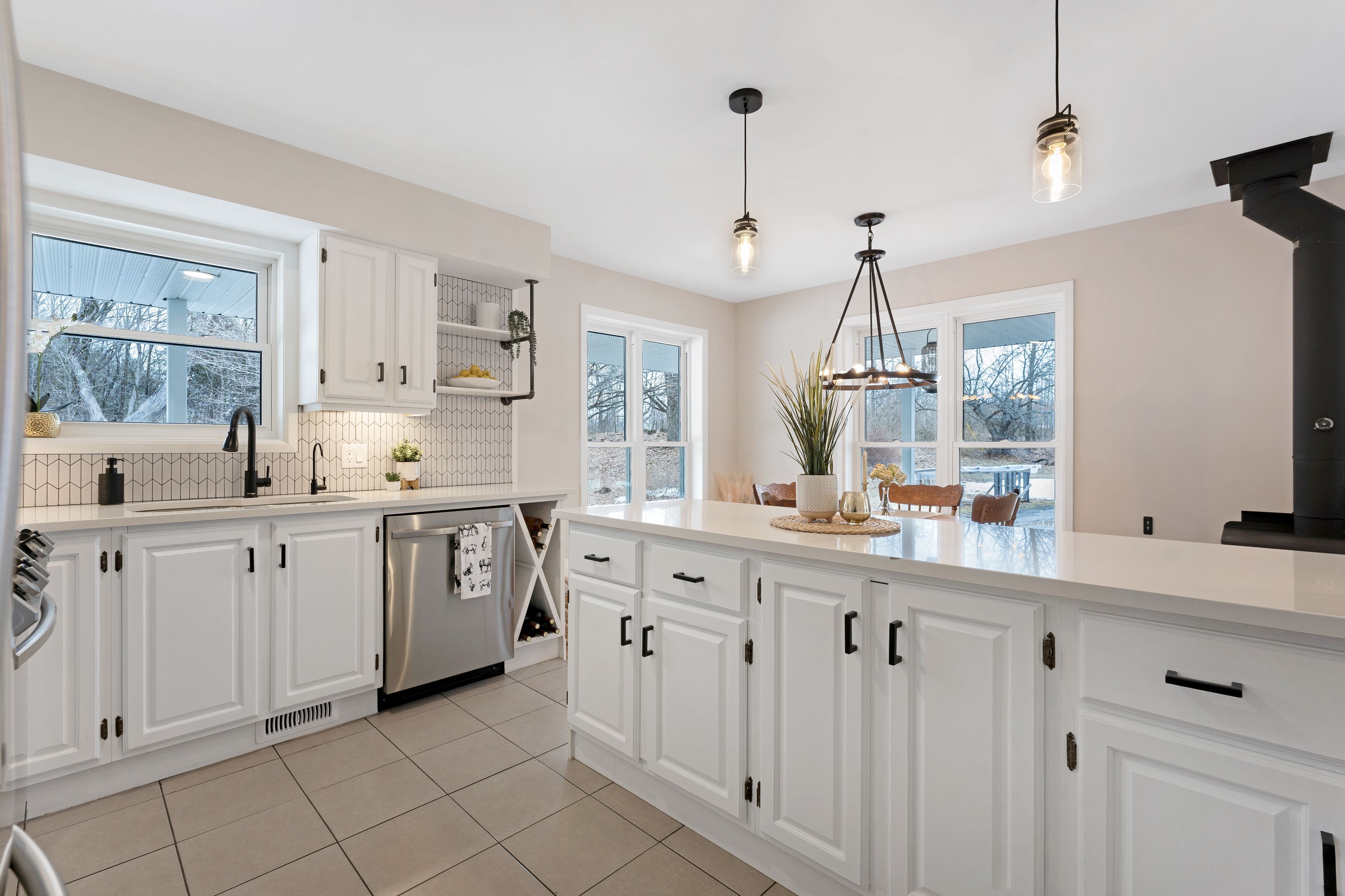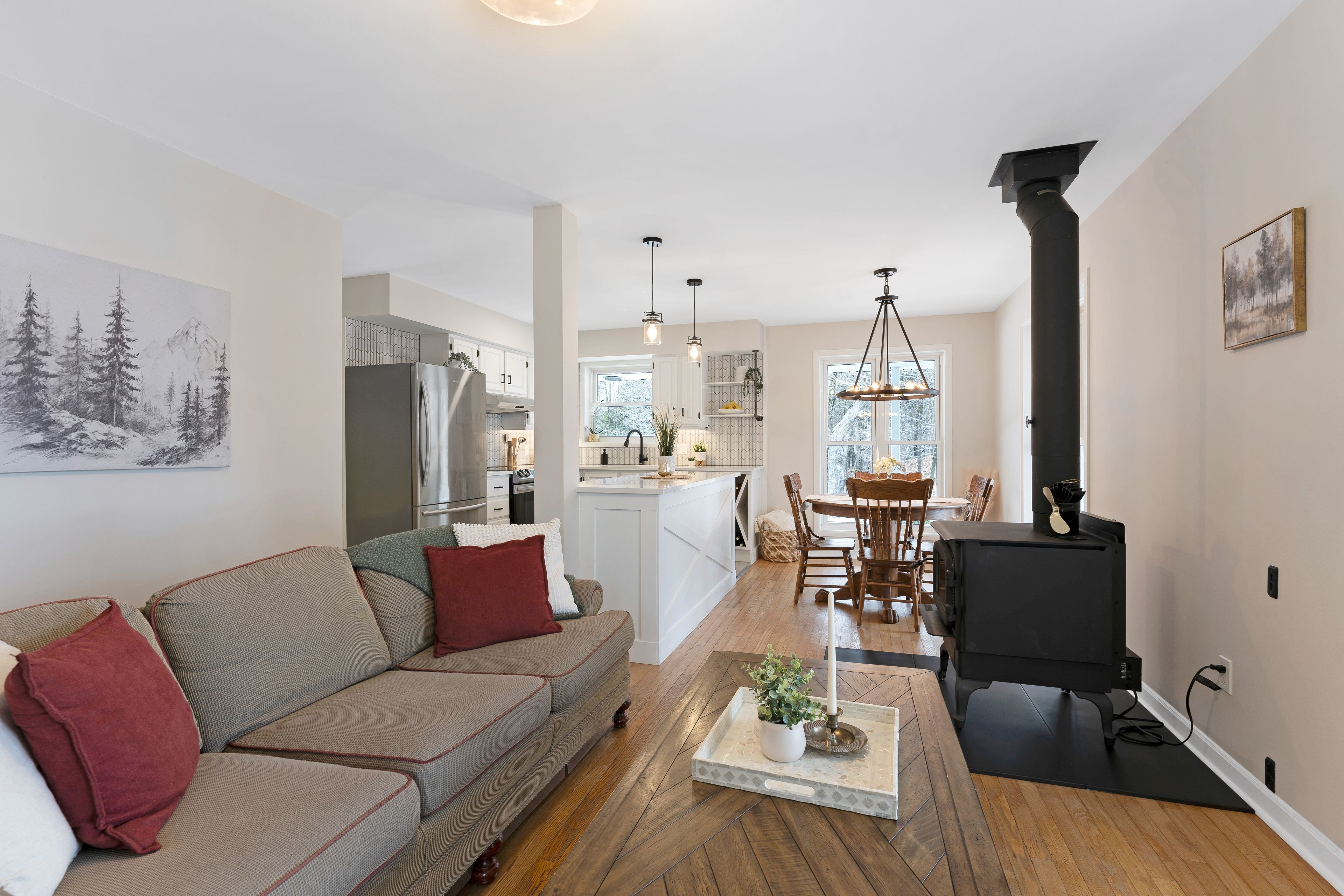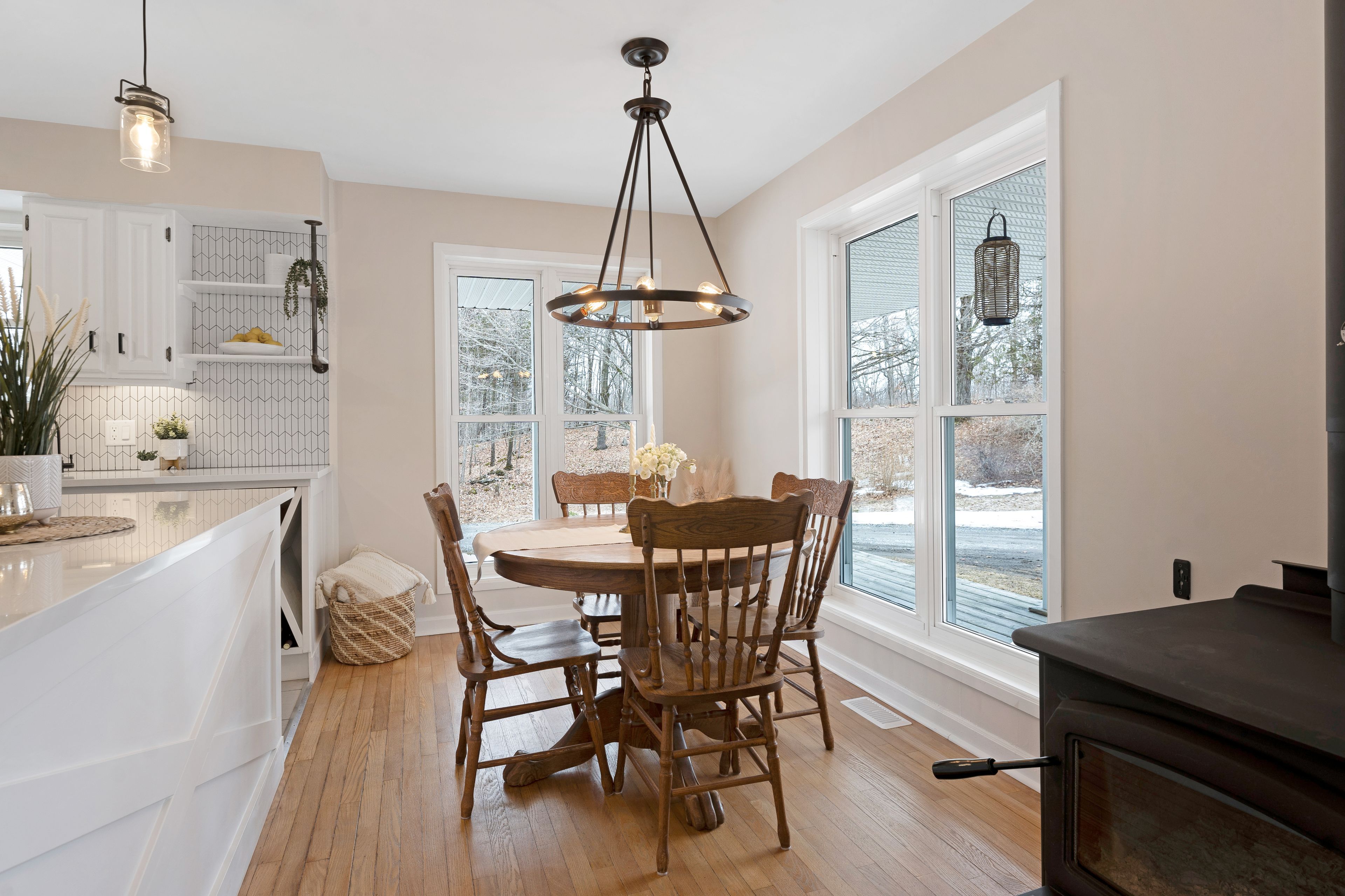 • Thoughtfully updated kitchen flows into a bright dining area with nature views.