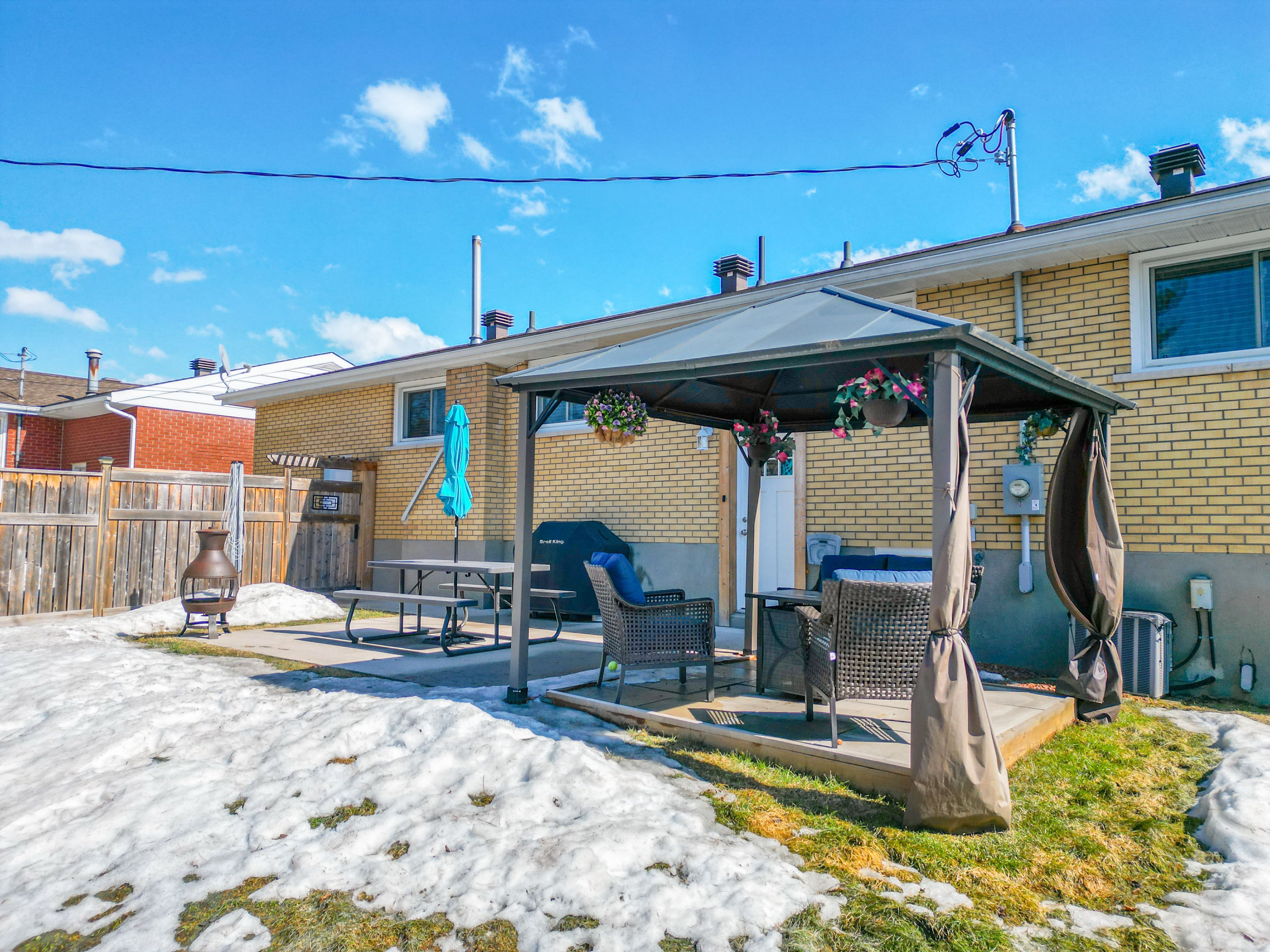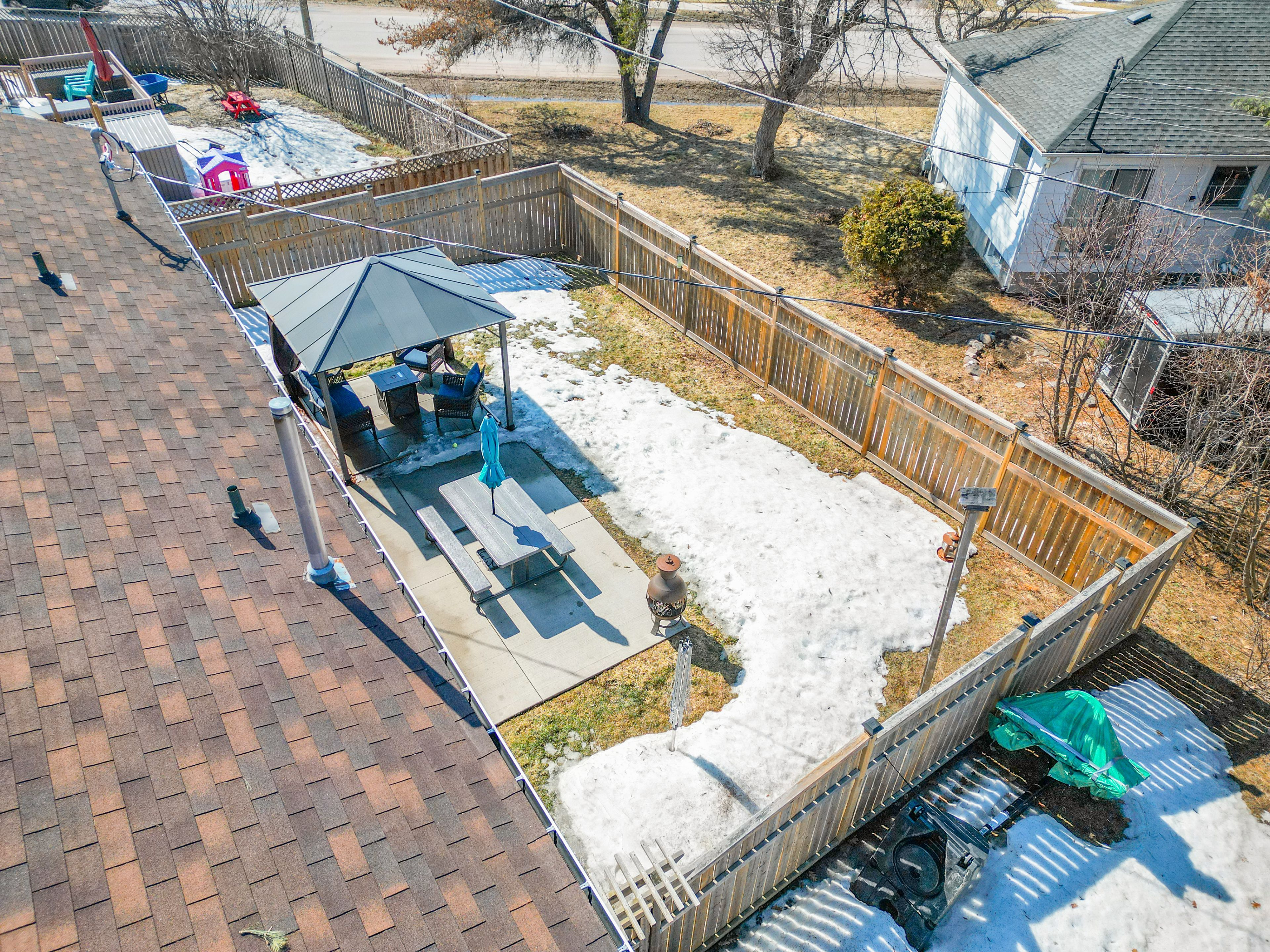 • Fenced backyard with patio and gazebo for outdoor enjoyment.