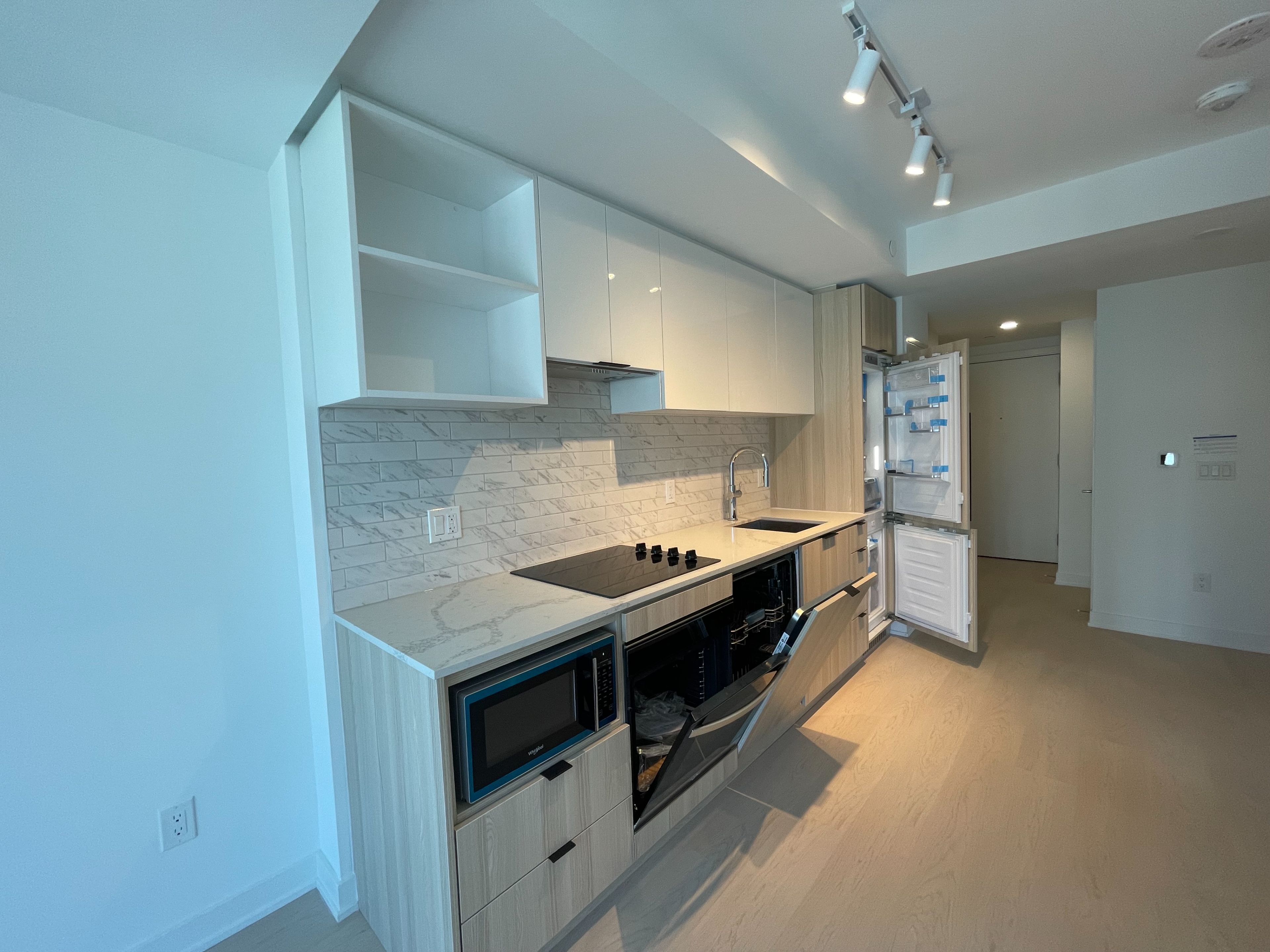 • Open-concept living area with modern finishes and kitchen.