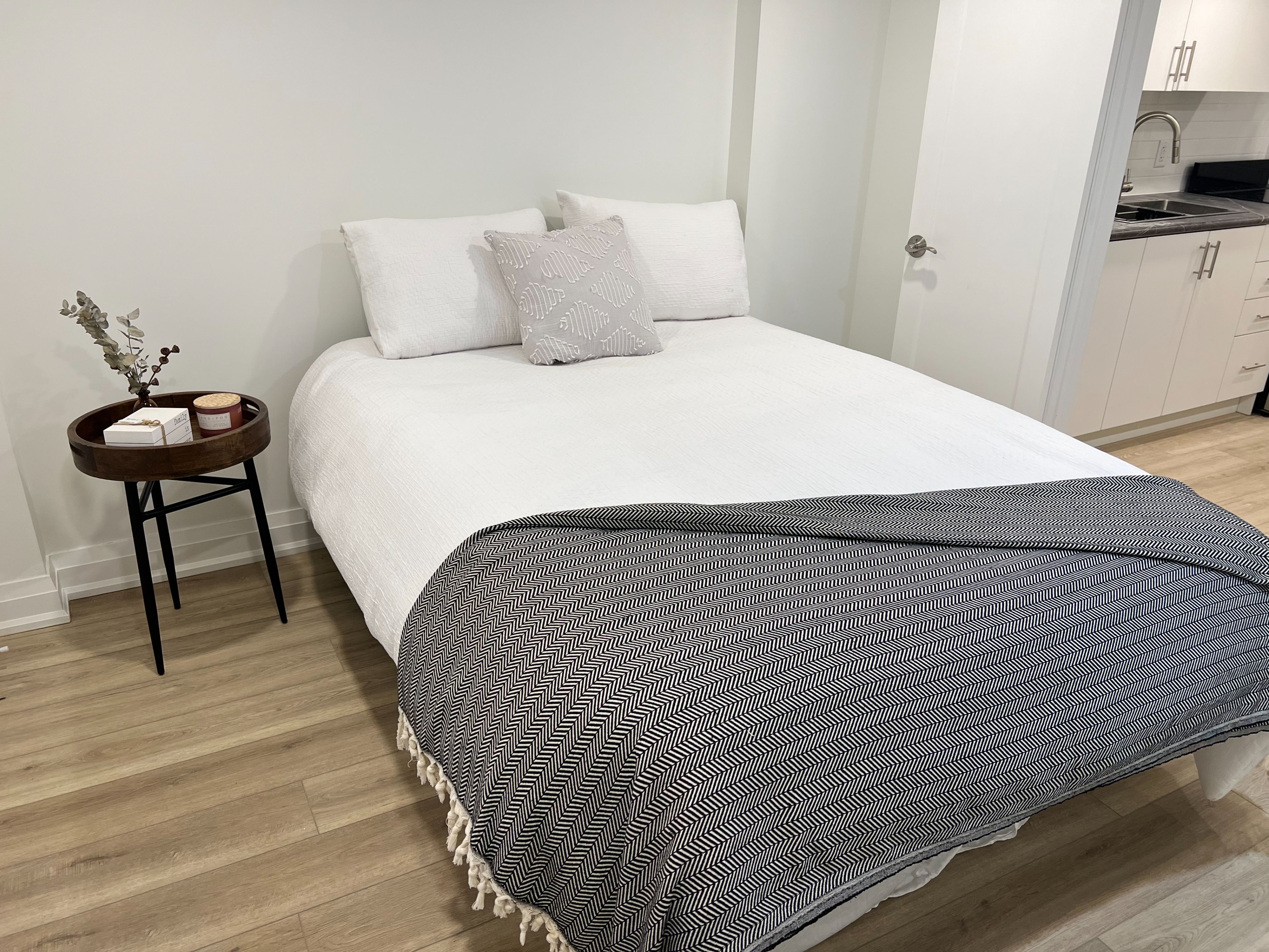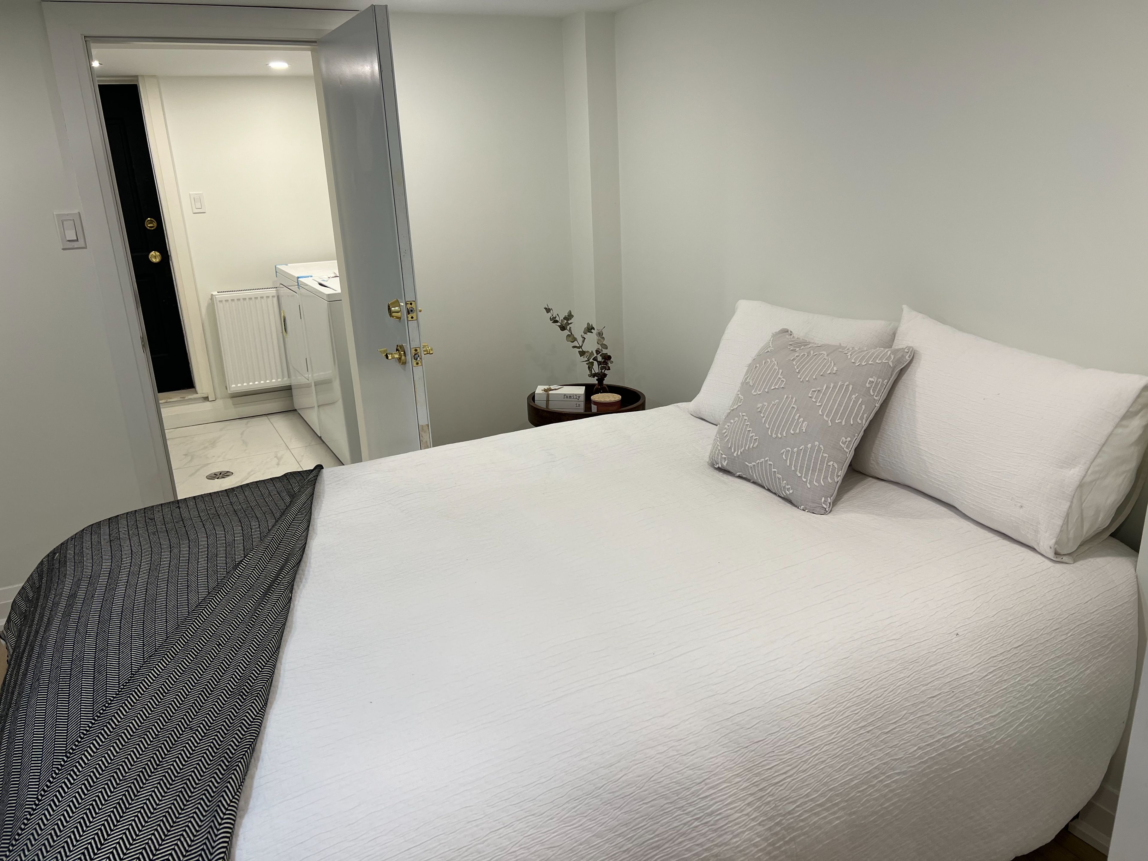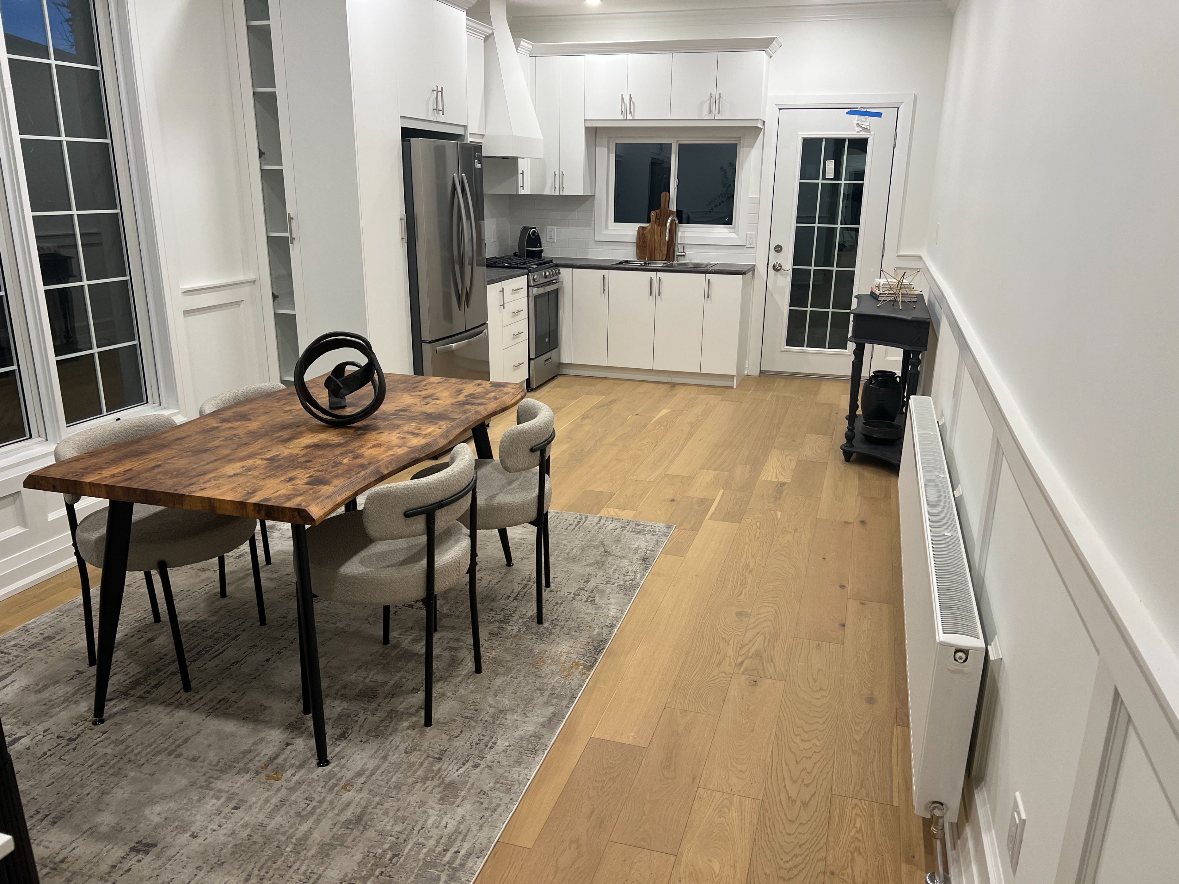 Very cozy bungalow totally redone from the bones and foundation by a professional contractor w/good quality materials and professional workmanship in a very desirable location close to public transportation*new electrical, new plumbing, new windows, new doors, new floors, new hardwood floors tru-out, new roof, new kitchen, new washrooms, new boiler, radiant heating and every room has a new heat/air conditioning wall unit*main floor open concept modern kitchen w/new cupboards, ceramic backsplash, stainless steel fridge and stove, modern & functional hood/fan and hardwood floor combined wdining room, walk-out to very sunny newly built wood deck, private fencing and direct access to double car garage*modern 3 pc washroom, primary bedroom w/closet and 2nd bedroom w/closet*2 separate entrances to fully finished basement by professional contractor w/kitchenette with fridge and stove, dining room/bedroom, modern 4 pc. Bathroom, big living room w/staircase to upstairs, big mud room from east basement entrance and great size laundry room