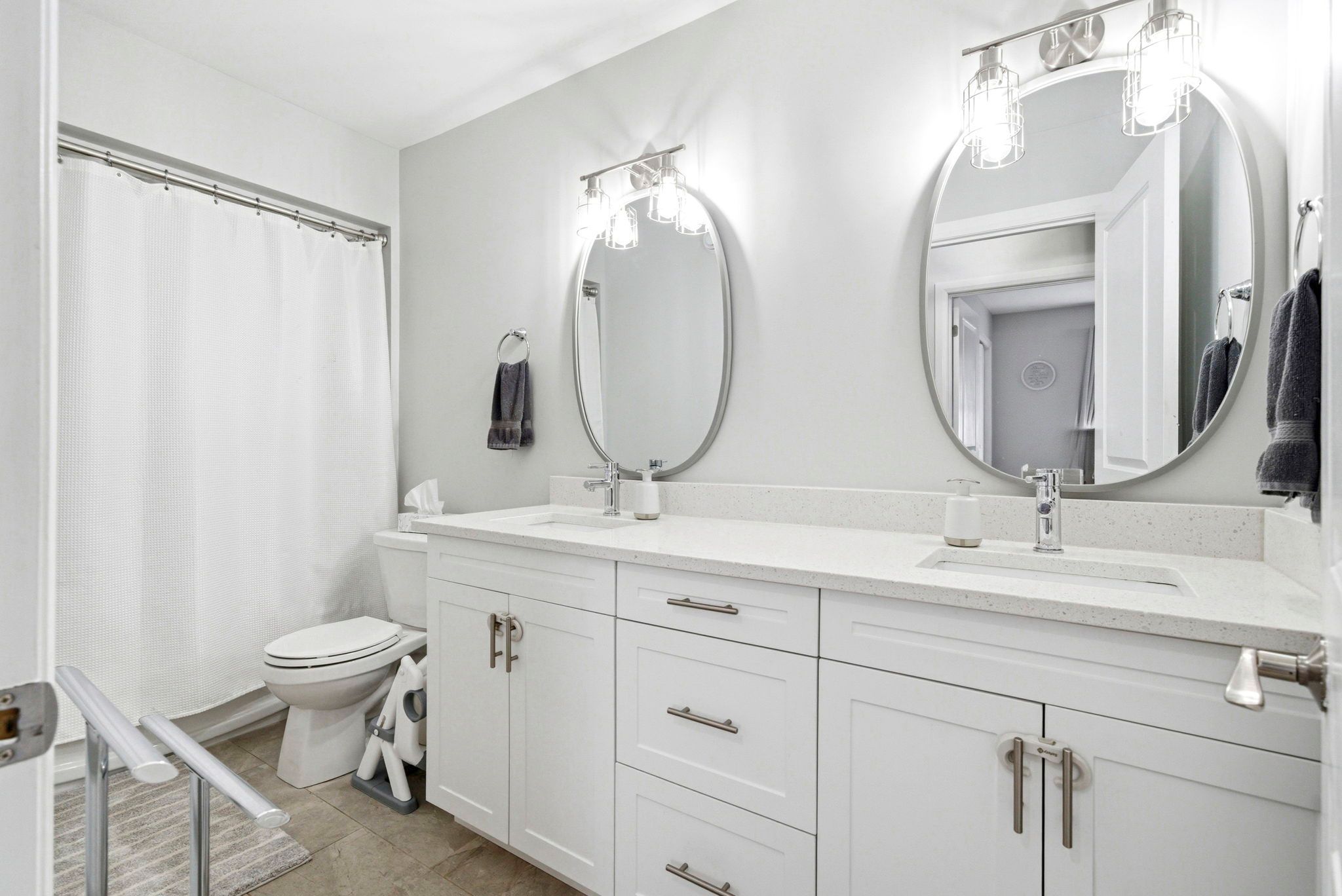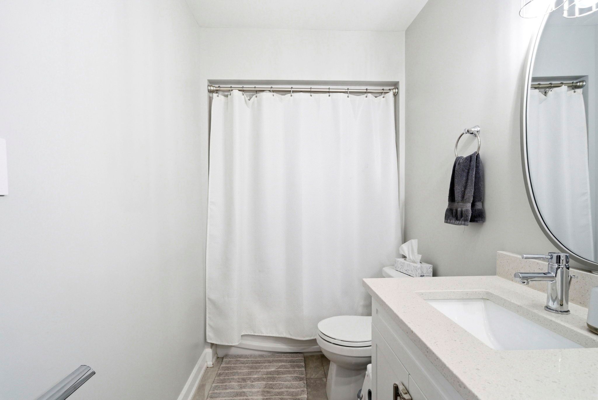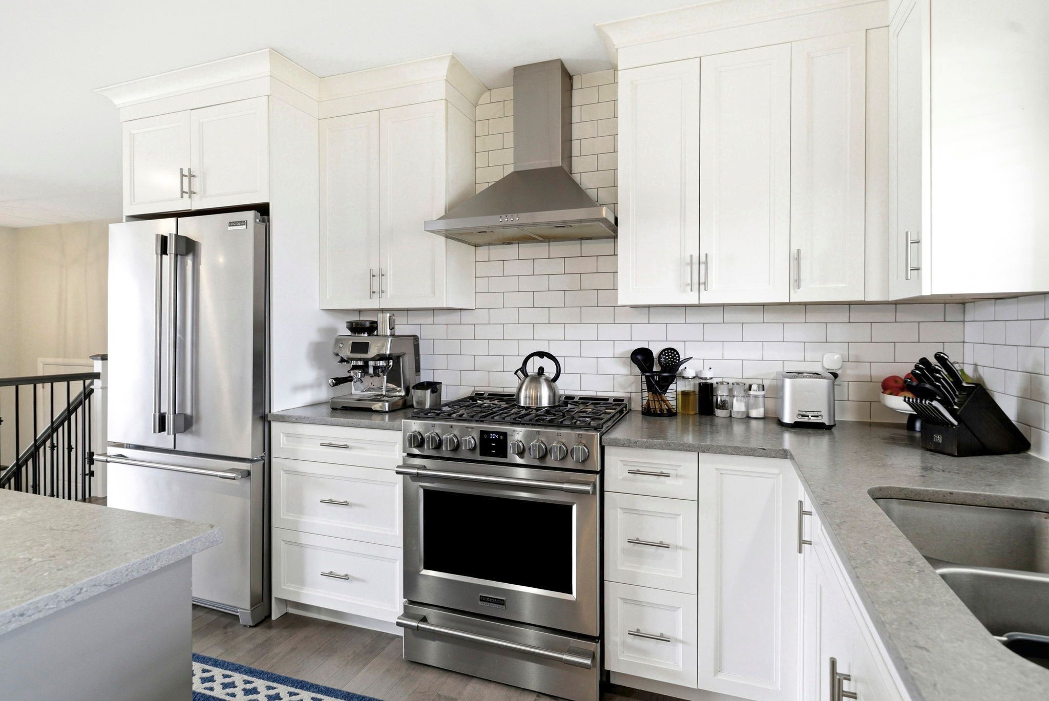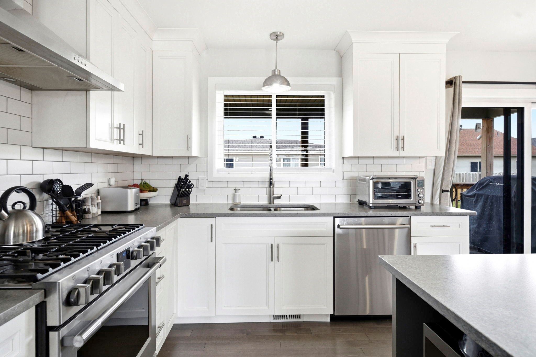 • Modern kitchen with quartz countertops and open concept design.
