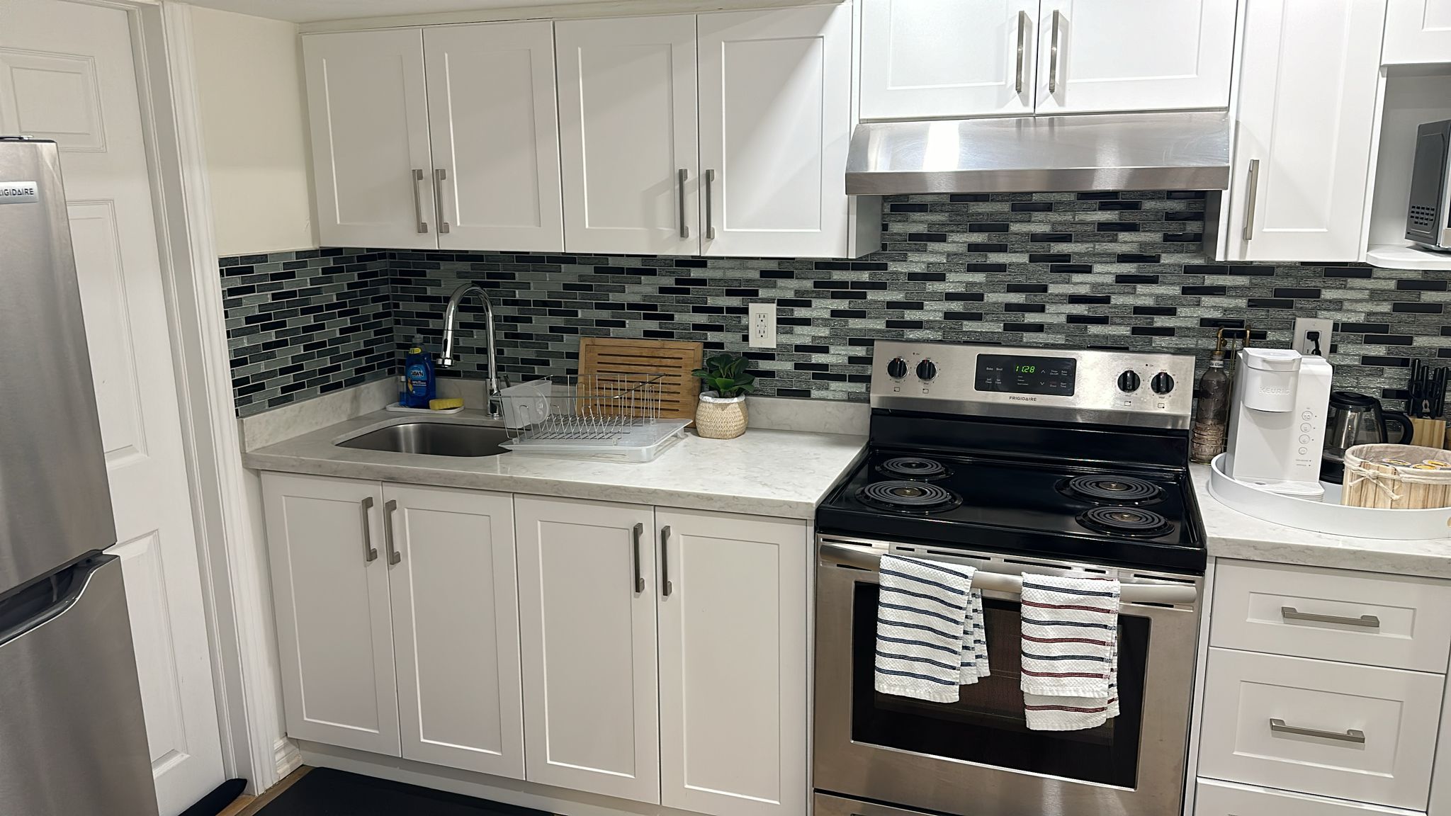 • Modern kitchen features stainless steel appliances and quartz countertops.