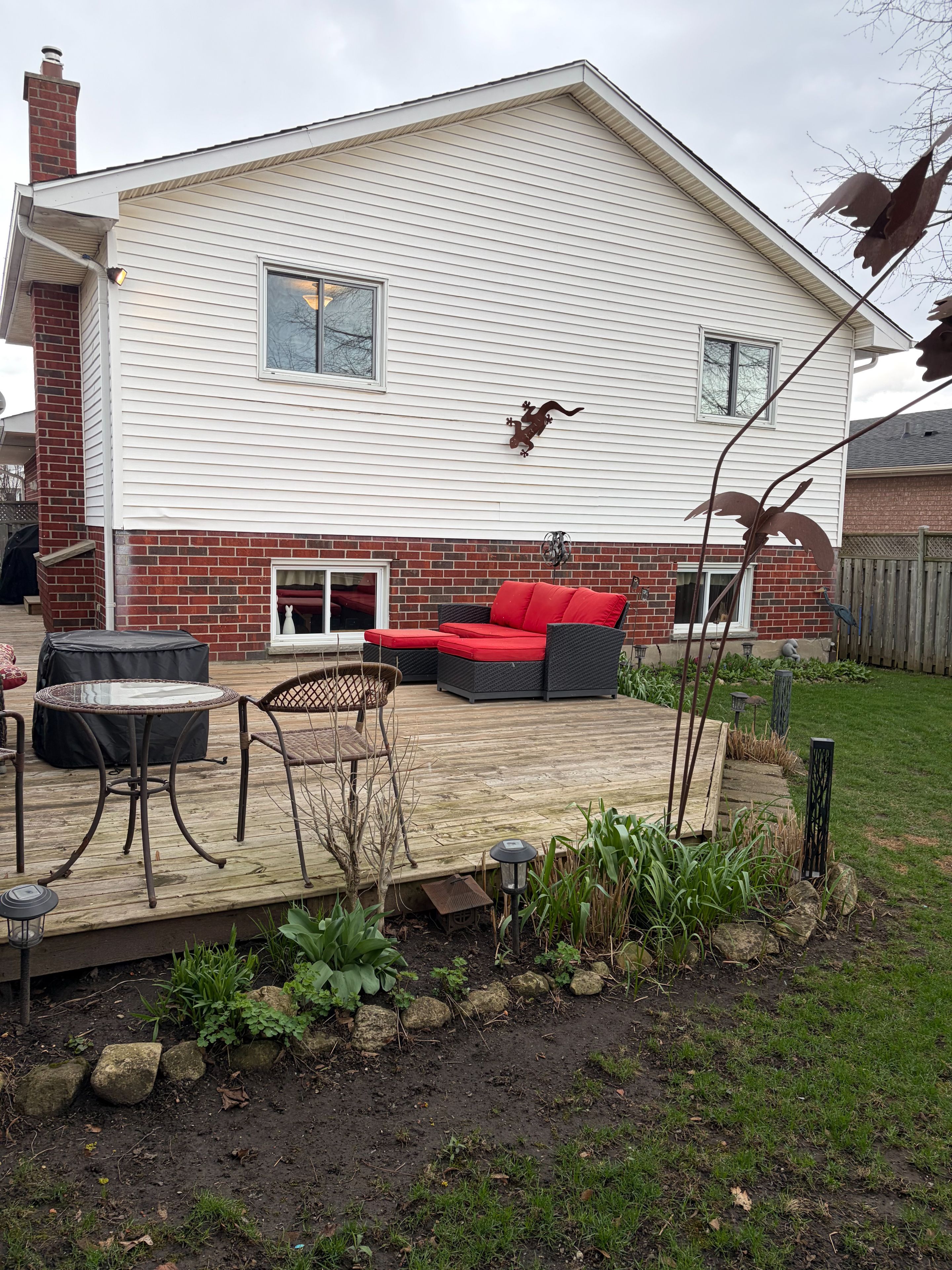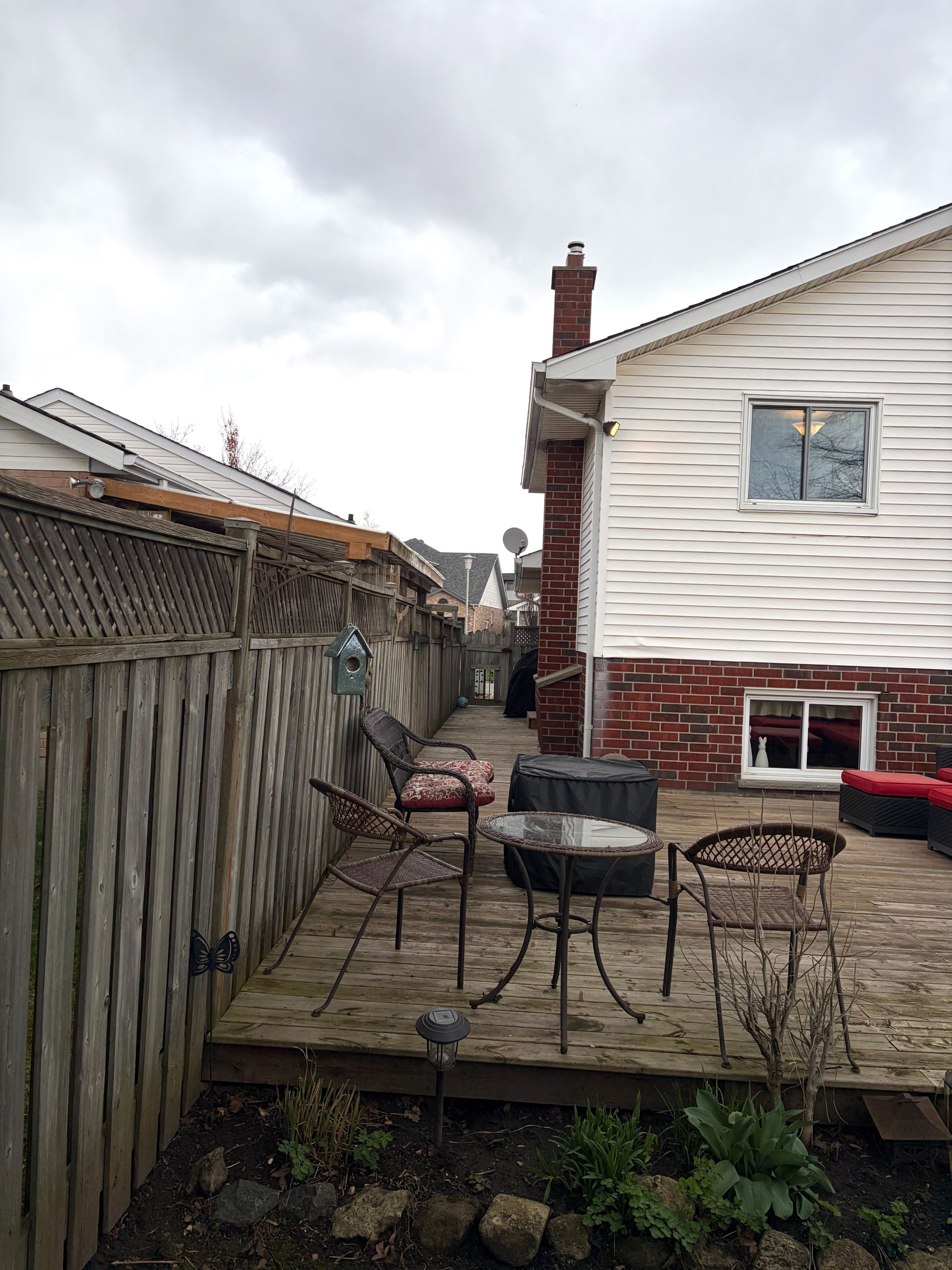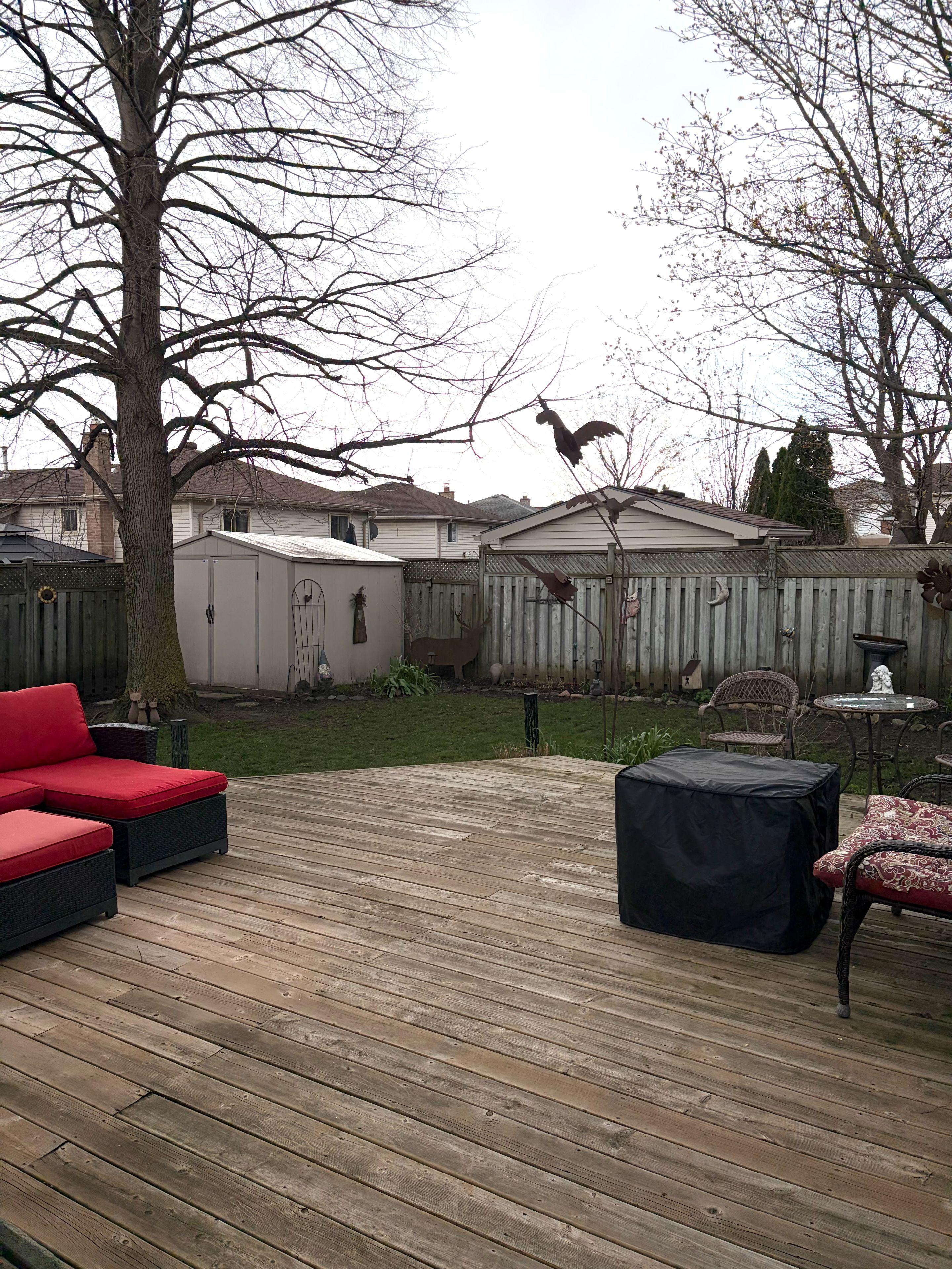 • Fully fenced backyard with deck for outdoor enjoyment and privacy.