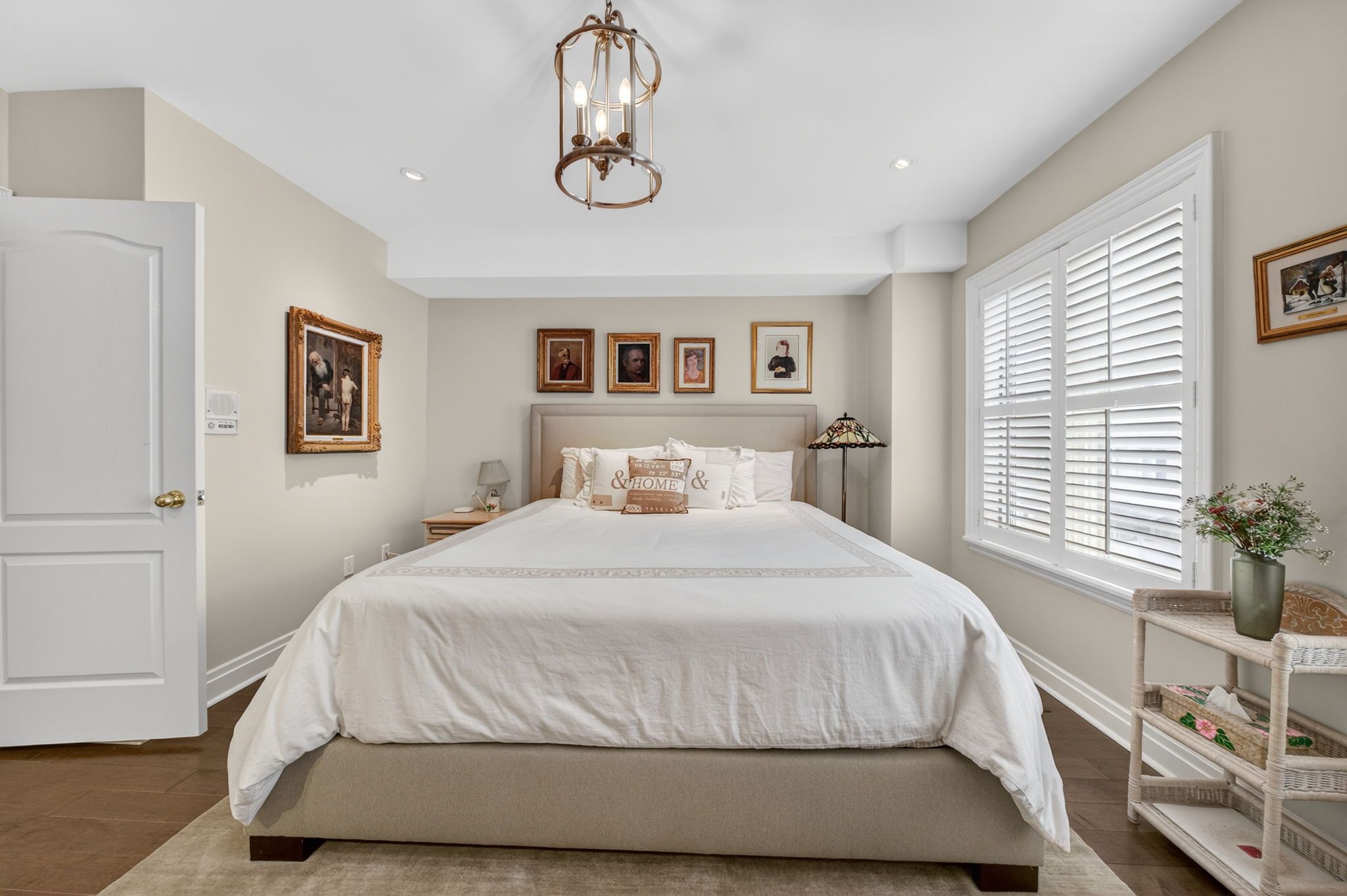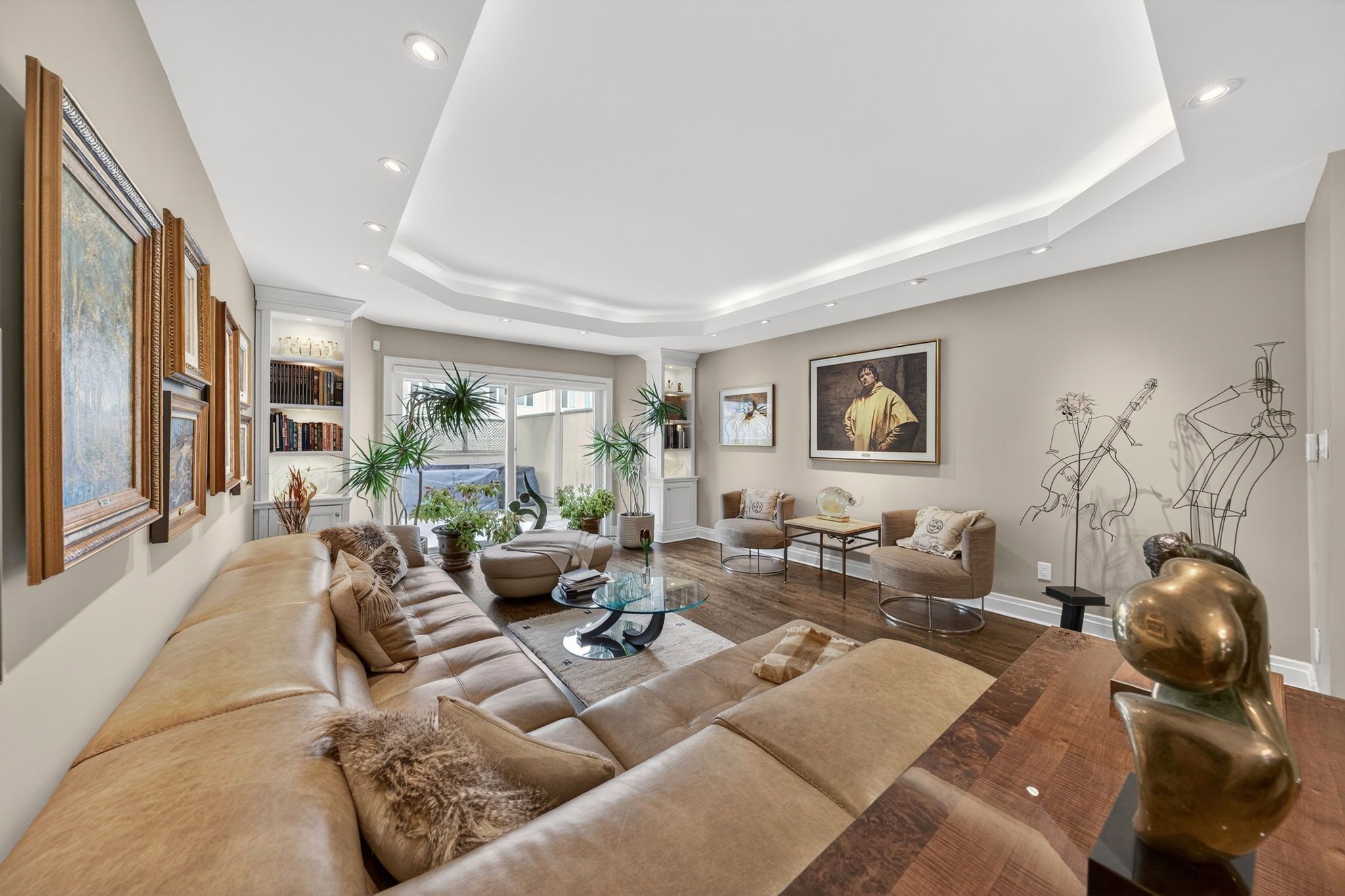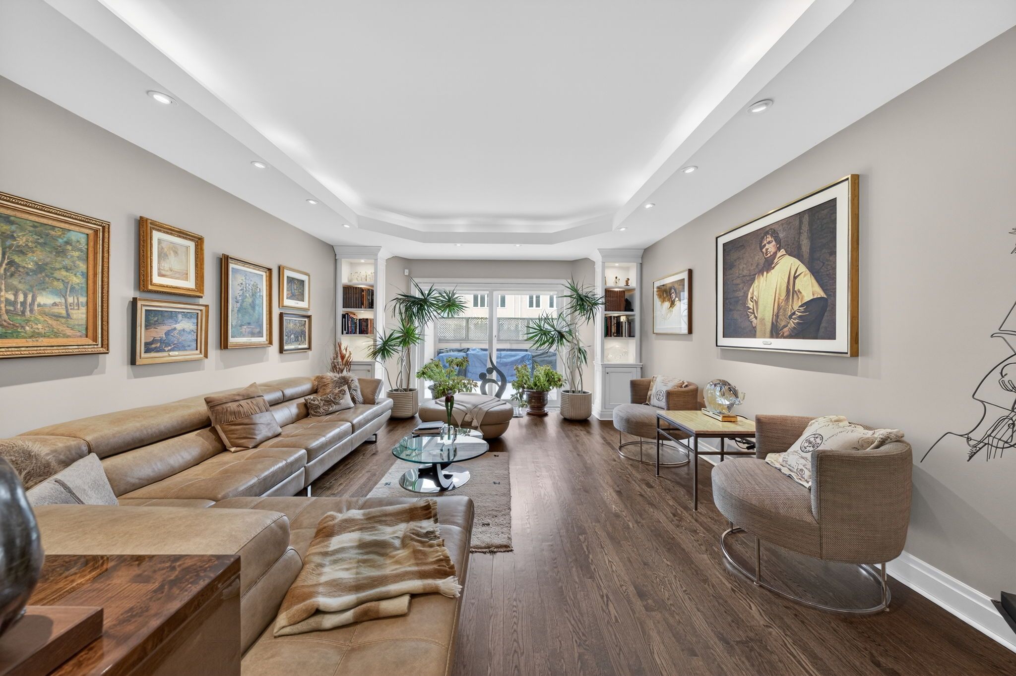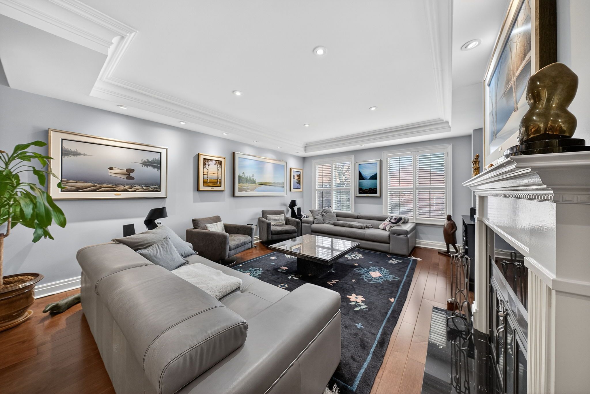 • Features stunning design elements like coffered ceilings and wide-plank oak floors.