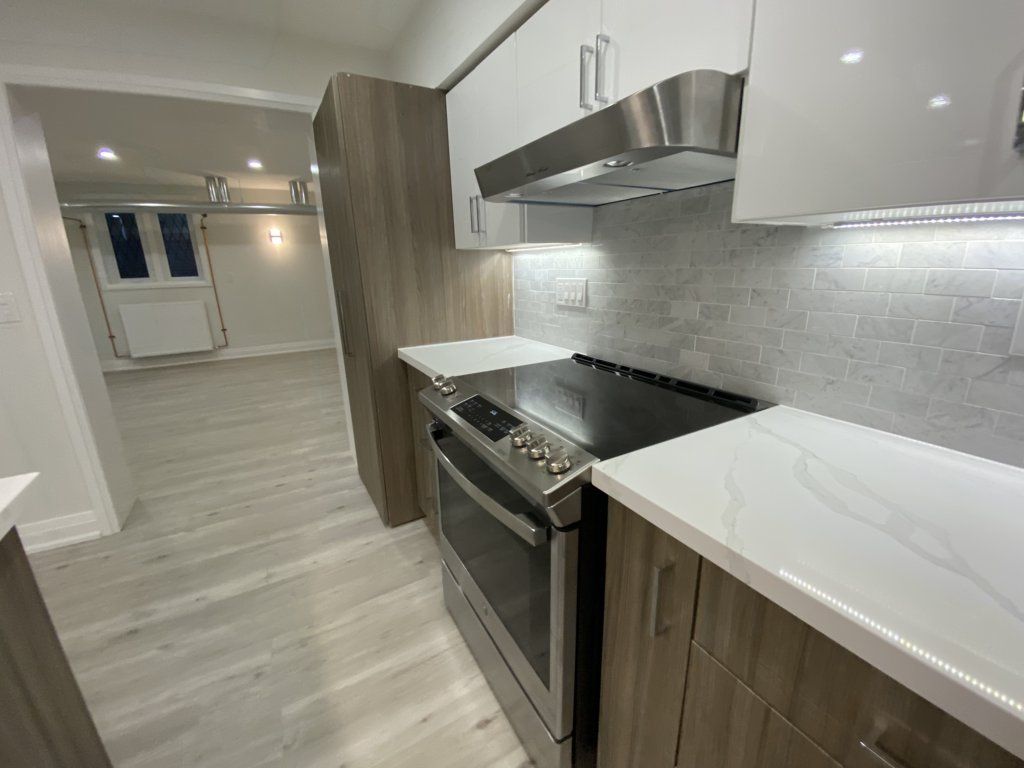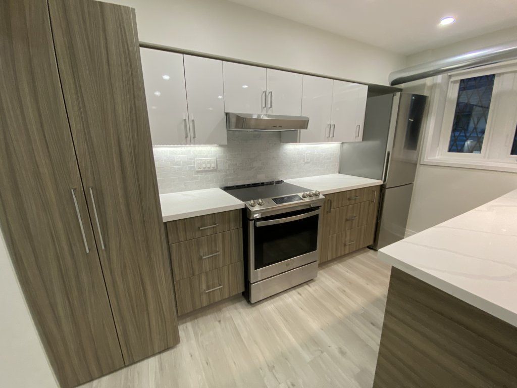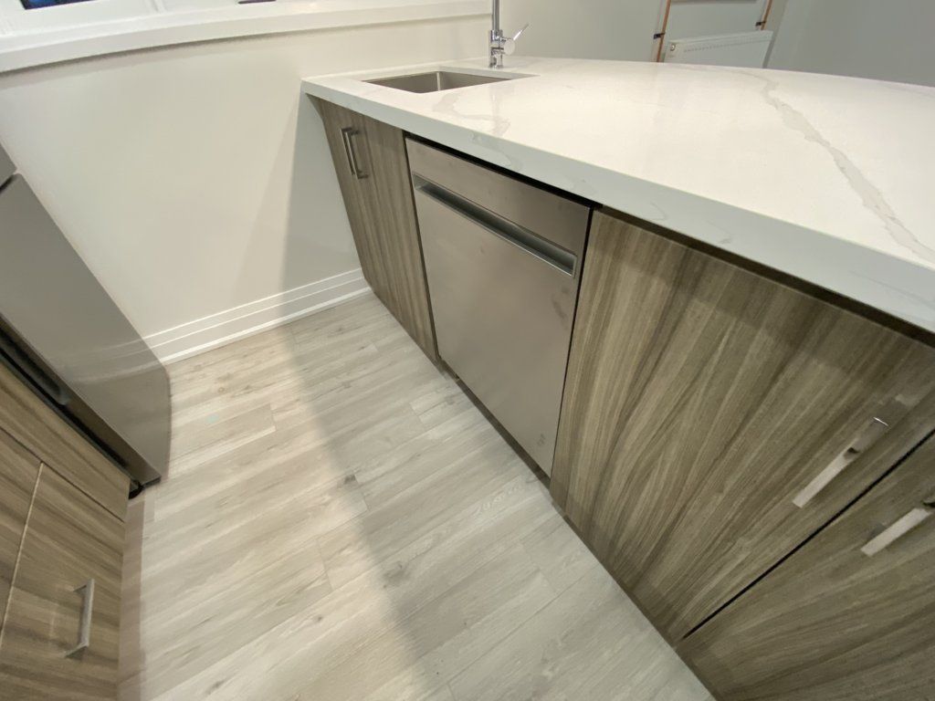 • Modern kitchen with quartz counters and stainless steel appliances.