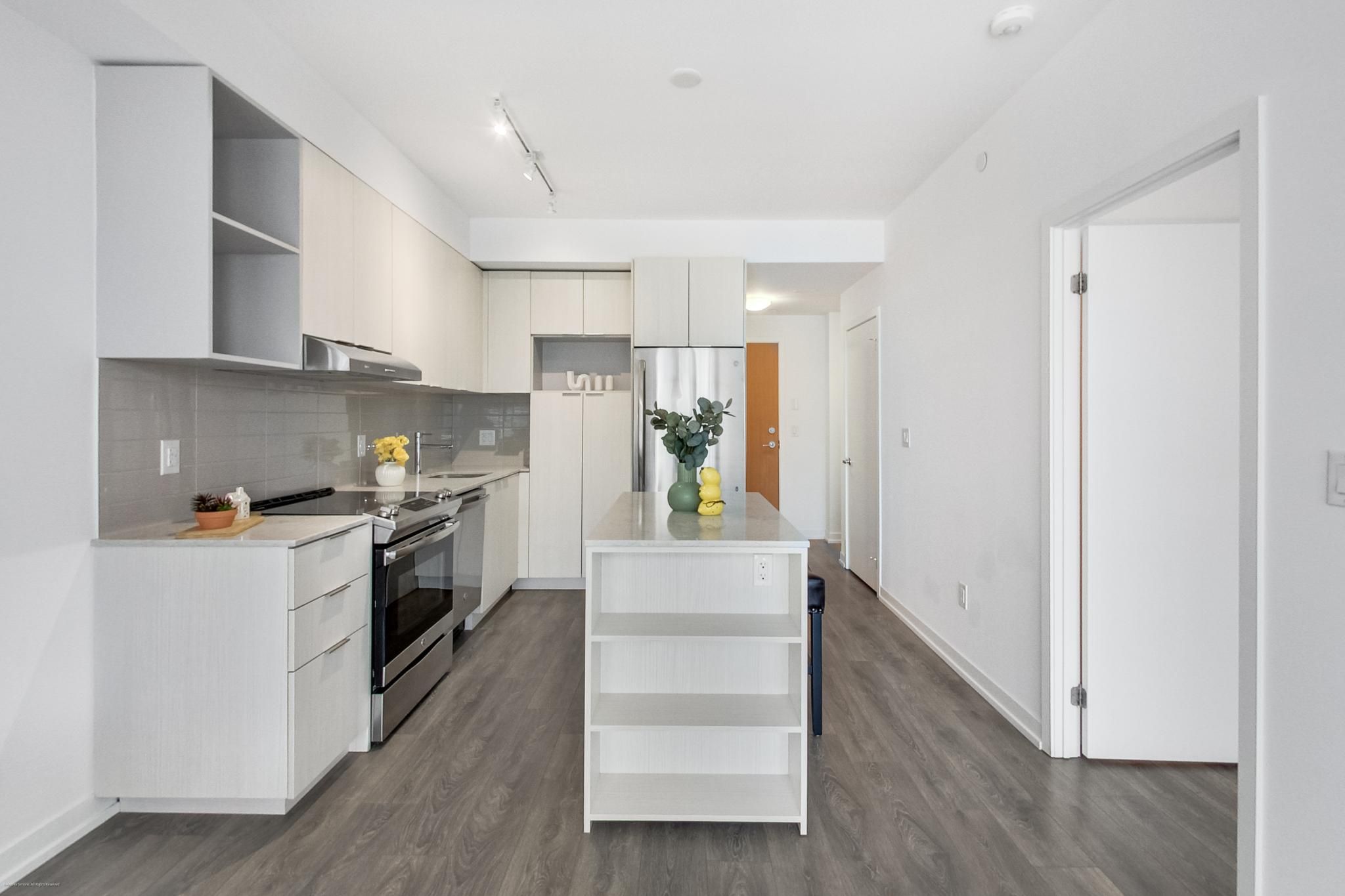 • Modern kitchen with stainless steel appliances and quartz countertops.