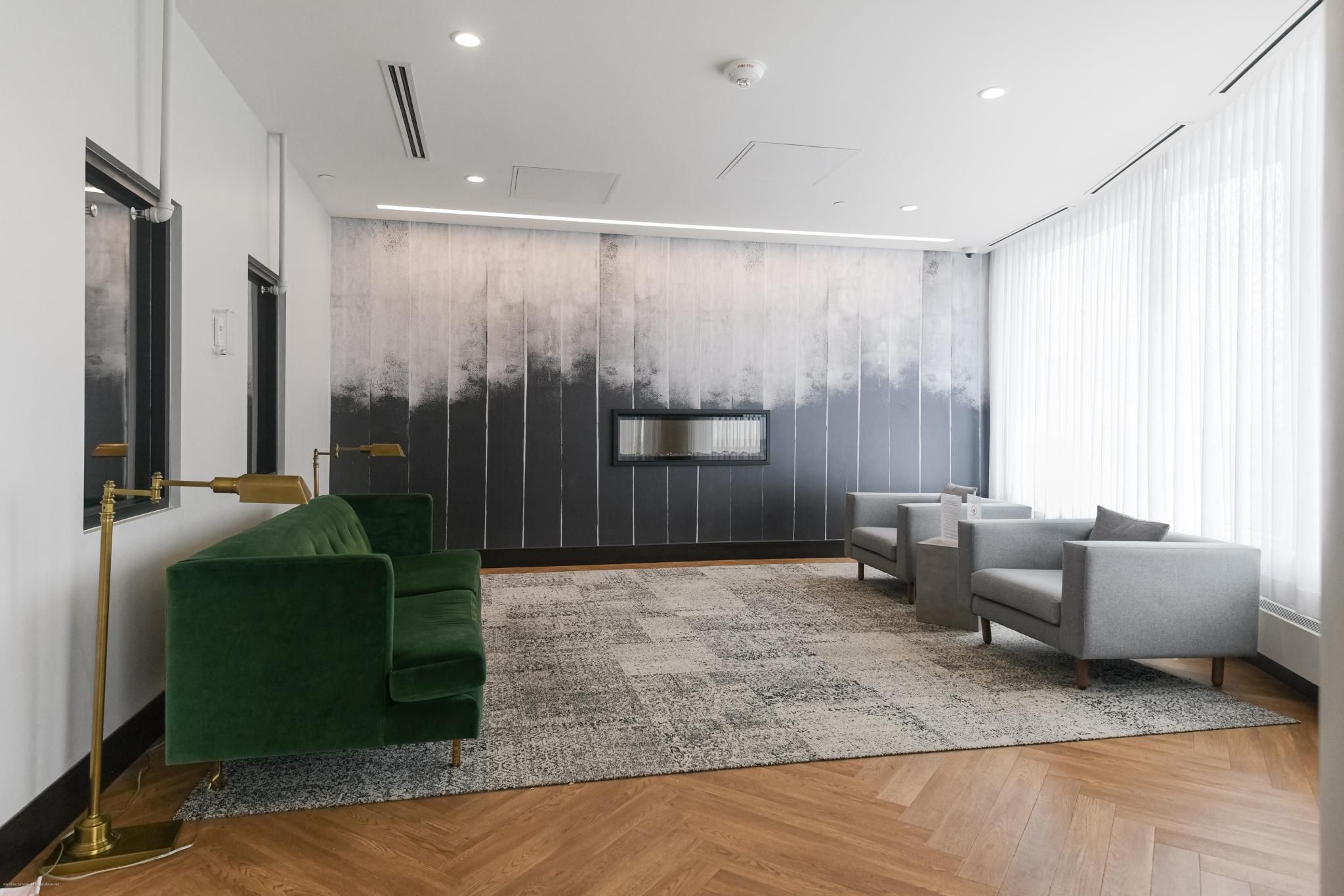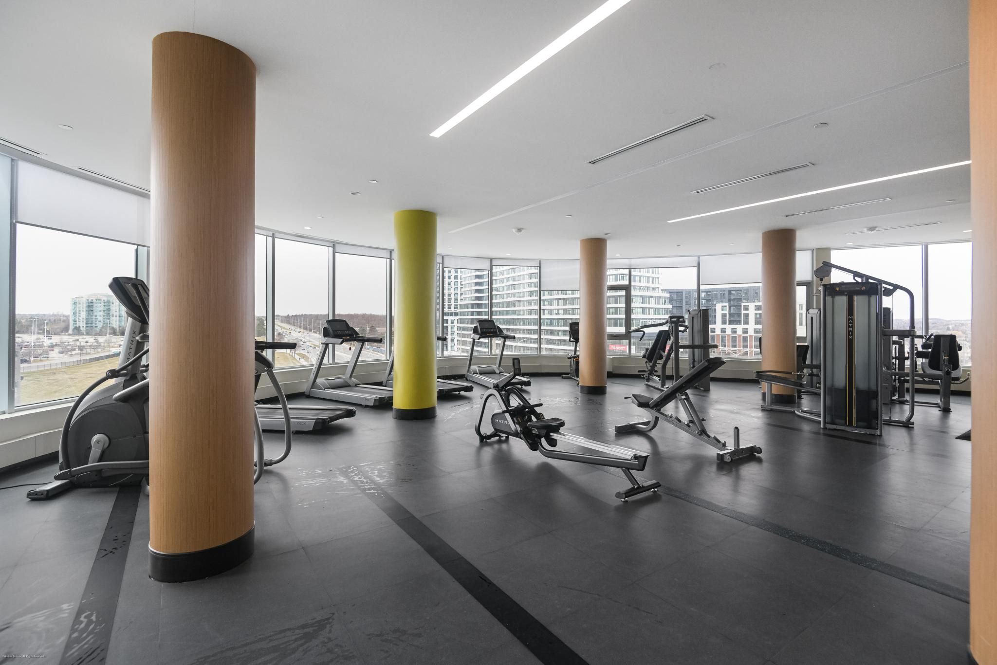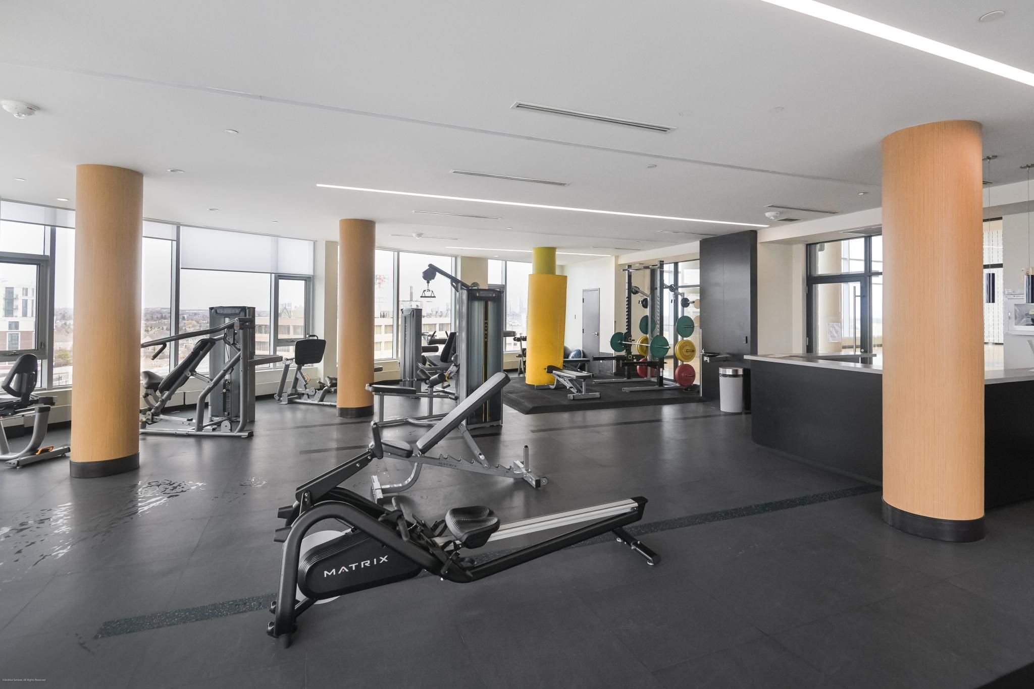 • Building amenities include security, fitness center, and indoor basketball court.