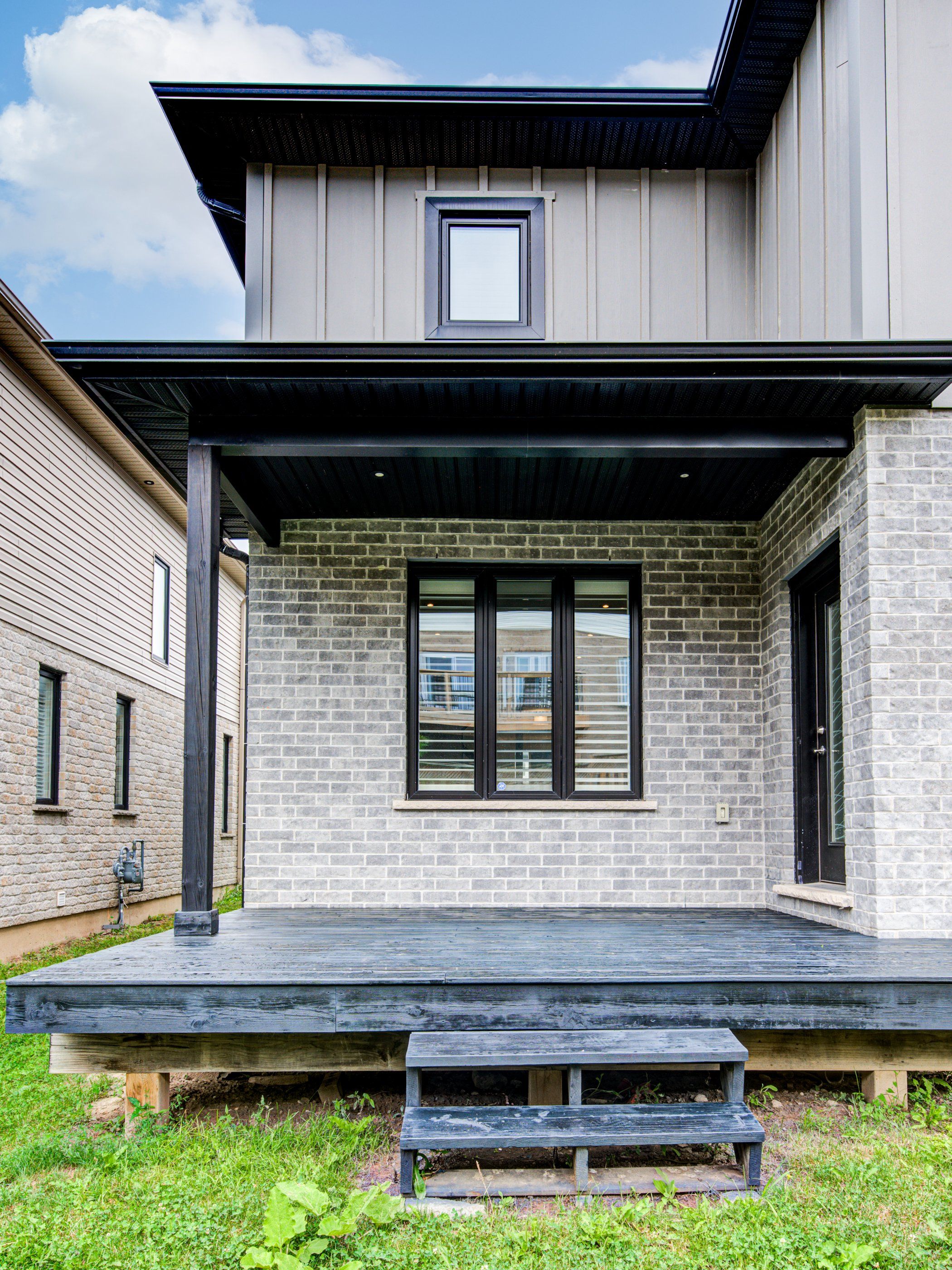 Welcome to this modern, energy-efficient, freshly painted, and move-in-ready home tucked away on a quiet, family-friendly street. With a sleek gray stone and brick exterior, a striking black front door, and a double-car garage, this home seamlessly blends contemporary style with everyday functionality. Inside, you're greeted by a bright, open-concept layout with an impressive floating staircase, designed for both comfort and entertaining. The front powder room is perfectly positioned for guests, while the spacious living area features a fireplace for cozy evenings. The kitchen is a true highlight featuring beautiful quartz countertops, a center island which house an under-the-counter microwave to maximize workspace, and a generous eat-in dining area leading outside to enjoy your walk-out deck, ideal for outdoor dining or morning coffee, and a gazebo nestled at the back of the lush lawn; your private escape after a long day. The entire home is carpet-free and upgraded with california shutters on the main floor for a clean, elegant finish. Convenient garage entry is located through the main floor laundry room, adding ease to your daily routine. Upstairs, you'll find three large bedrooms, including a serene primary suite with a glass walk-in shower, soaker tub, and double sinks for a spa-like experience. The second full bathroom is a functional jack and jill design, perfect for busy family mornings. Downstairs, the fully finished basement offers incredible flexibility. It includes a spacious fourth bedroom with large windows and natural light, a barn door to separate the oversized bedroom from the cozy rec room, and ample space for guests, in-laws, or a potential rental suite. This home combines modern upgrades, thoughtful design, and family-friendly features in one exceptional package. Don't miss your chance to make it yours. This house is virtually staged.