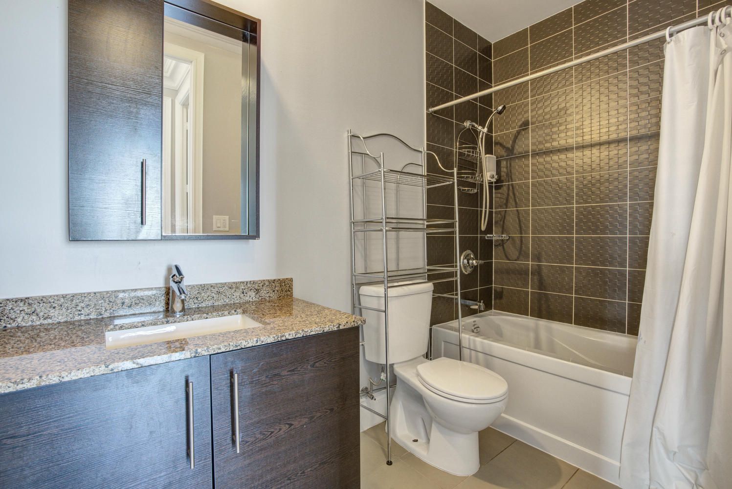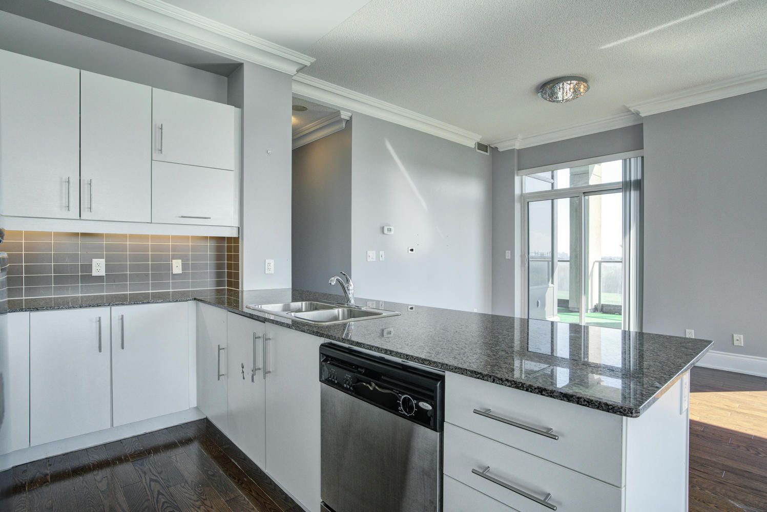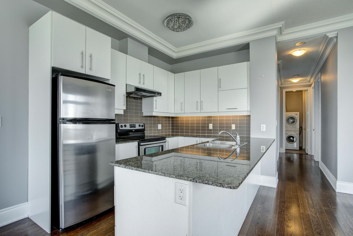 • Modern kitchen with granite countertops and stylish mosaic backsplash.