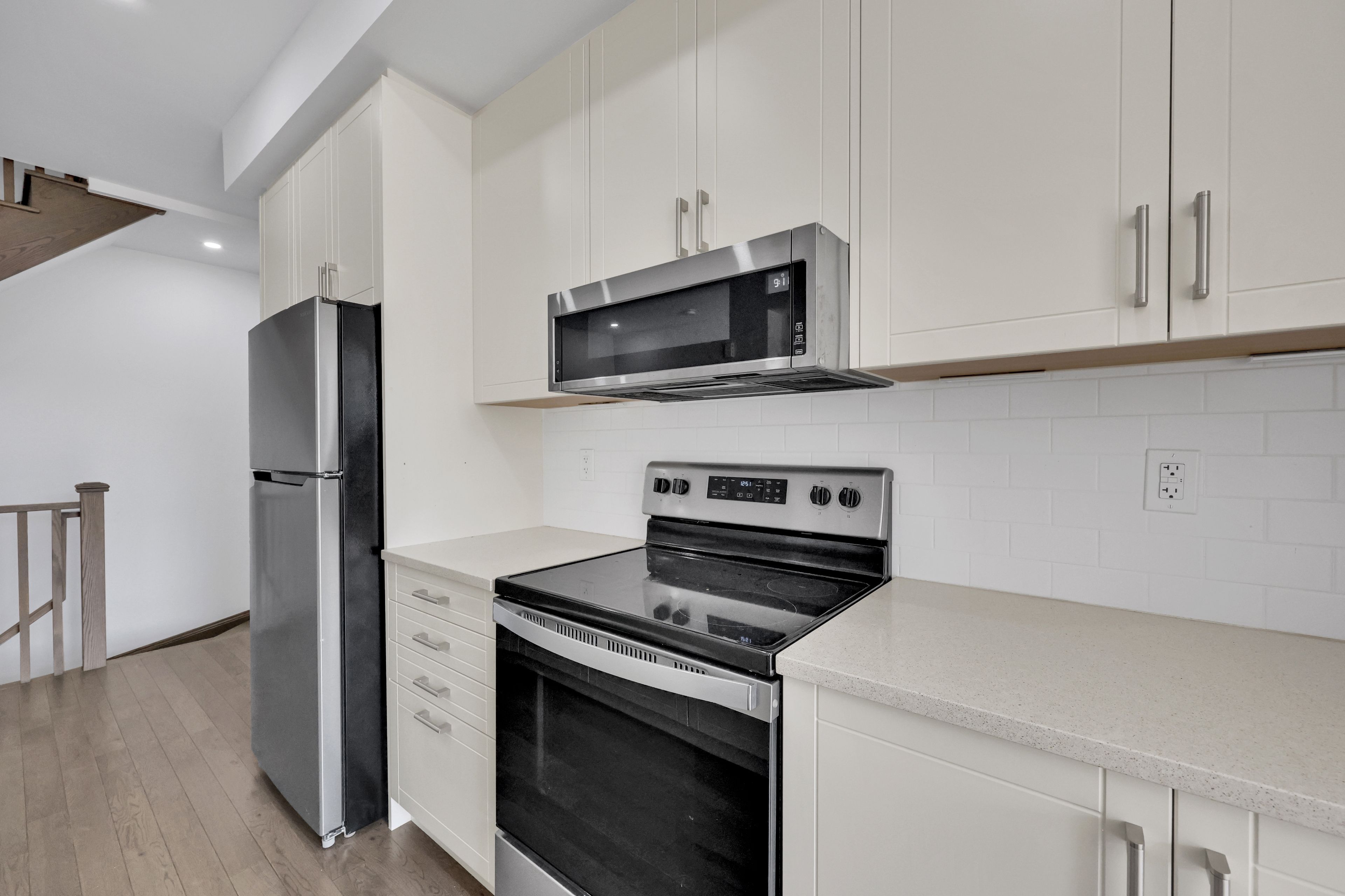 • Modern kitchen includes granite countertops and stainless steel appliances.