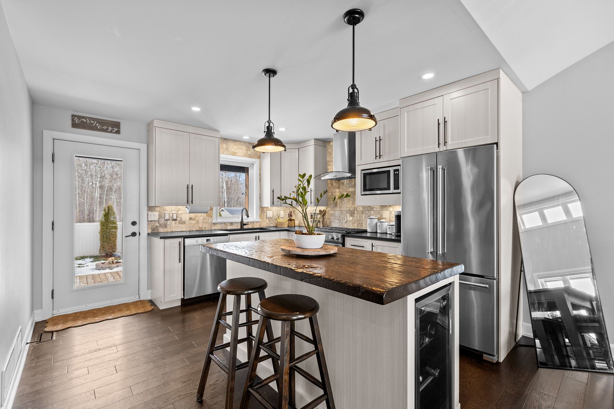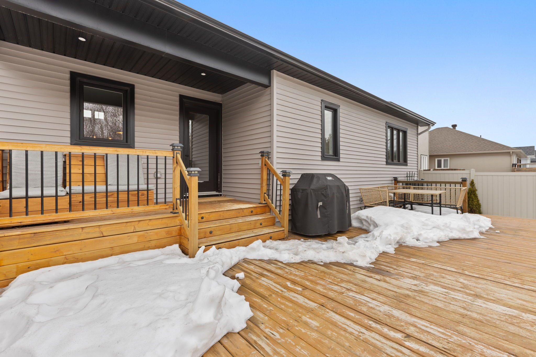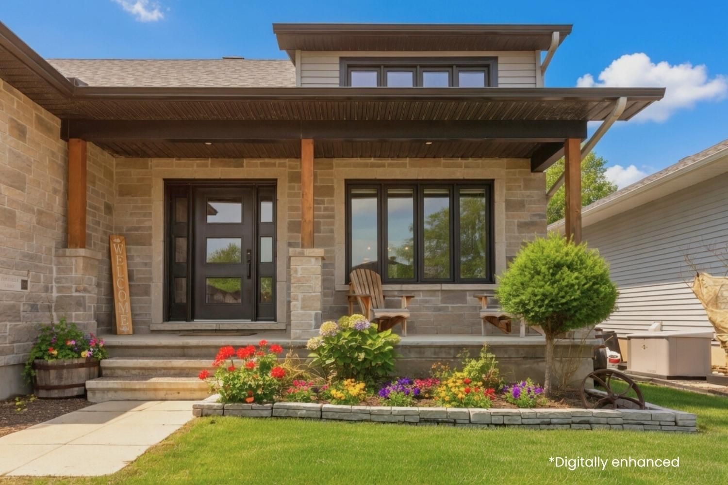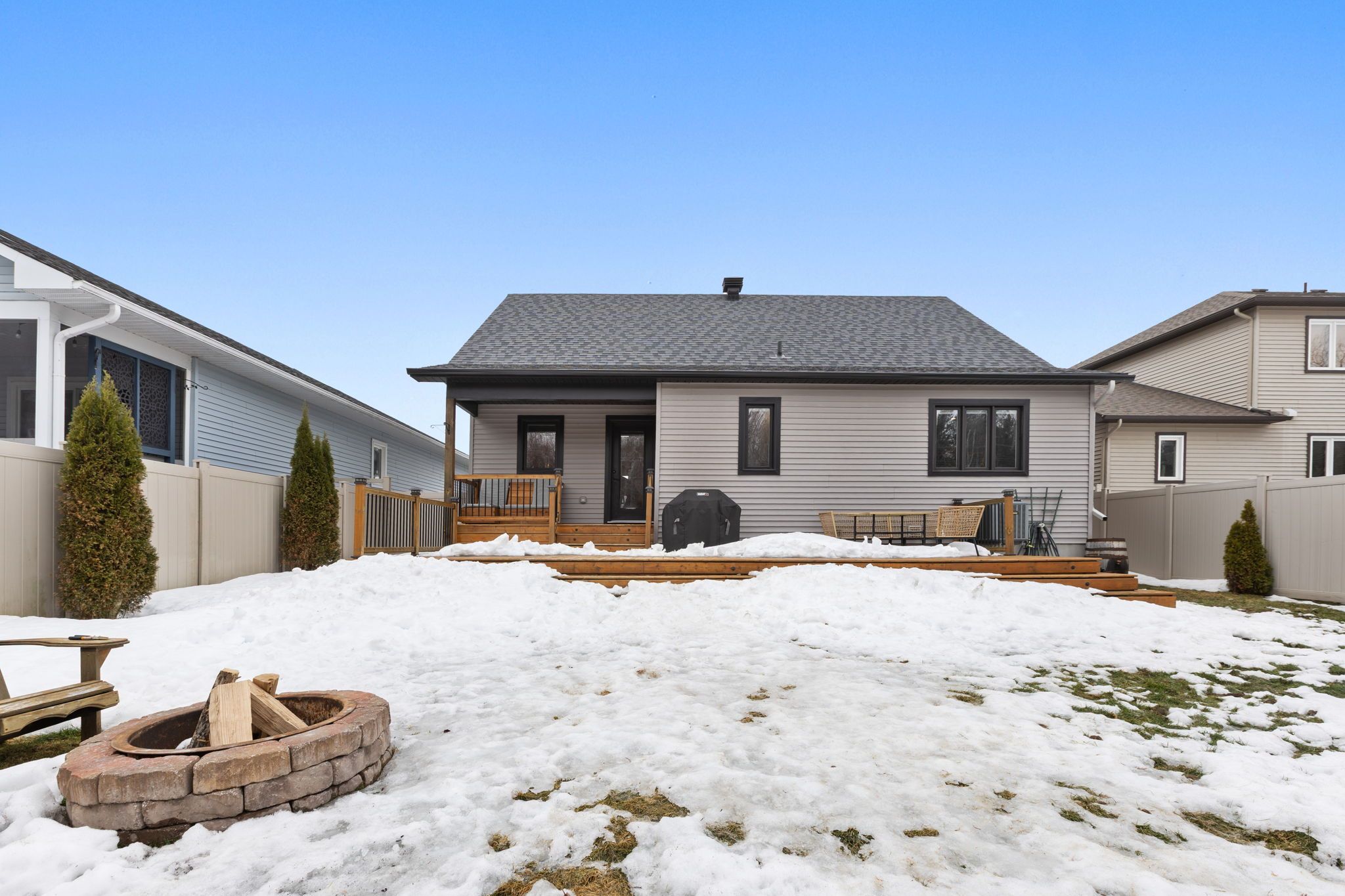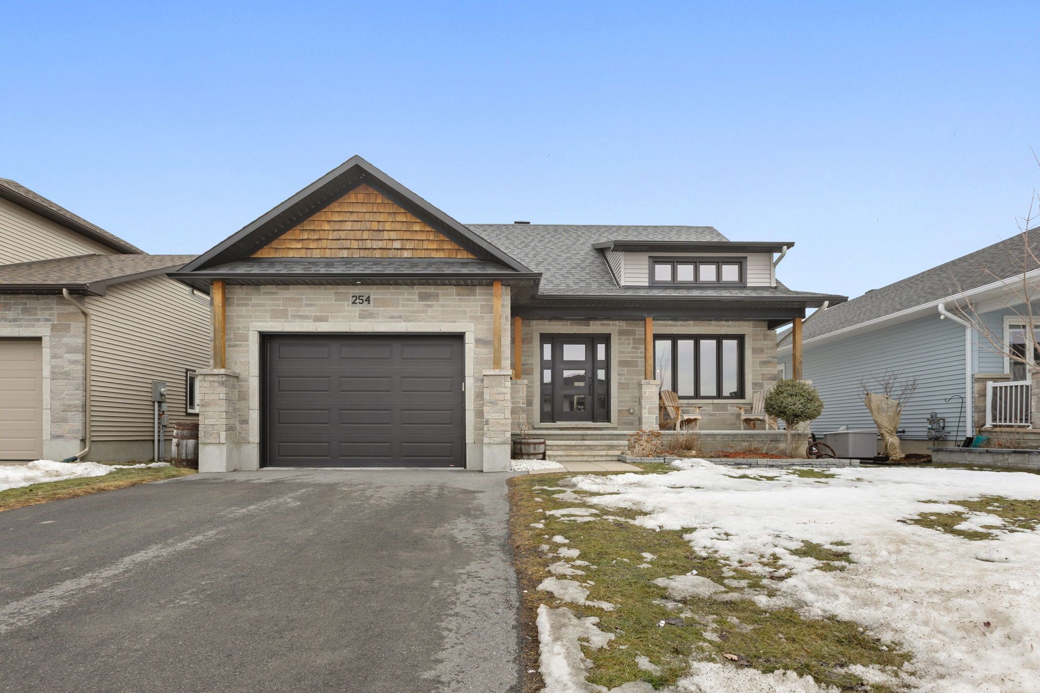 *open house sunday, march 29 , 2:00-4:00 pm* welcome to 254 pioneer road in russell, a beautifully designed 2018-built bungalow offering 2+1 bedrooms and 3 full bathrooms. From the moment you arrive, this home impresses with its stone exterior, warm wood beams, covered front porch, single attached garage, and private double driveway. Inside, a welcoming foyer with tile flooring and a front closet opens into a bright, airy main floor with high ceilings, large windows, and hardwood floors throughout. The open-concept living space feels warm, comfortable, and full of natural light. The kitchen is both stylish and functional, featuring cream cabinetry, stainless steel appliances, generous storage, and a massive antique-style wood island with seating that adds character and warmth. A wine fridge is a great bonus, and the walkout from the kitchen leads directly to the backyard deck, making outdoor dining and entertaining effortless. T he primary bedroom offers a relaxing retreat with a modern ensuite featuring a walk-in shower. A second main-floor bedroom with its own closet is ideal for family, guests, or a home office. A second full bathroom and a convenient laundry room with sink and storage complete the layout. The lower level features beautiful stone accents, a bar and kitchenette with seating area, and a cozy family room with a fireplace and matching stone wall. A third bedroom offers flexibility for guests, office space, or hobbies, along with a third full bathroom. Outside, enjoy a spacious fully fenced backyard overlooking a wooded area with no rear neighbours. The large deck offers room for seating and bbq, while the corner gazebo with built-in wood design creates a charming outdoor dining space. A firepit area adds extra warmth and character. Located in a desirable russell neighbourhood close to groceries, restaurants, and everyday amenities, this home offers comfort, style, privacy, and convenience in one inviting package.