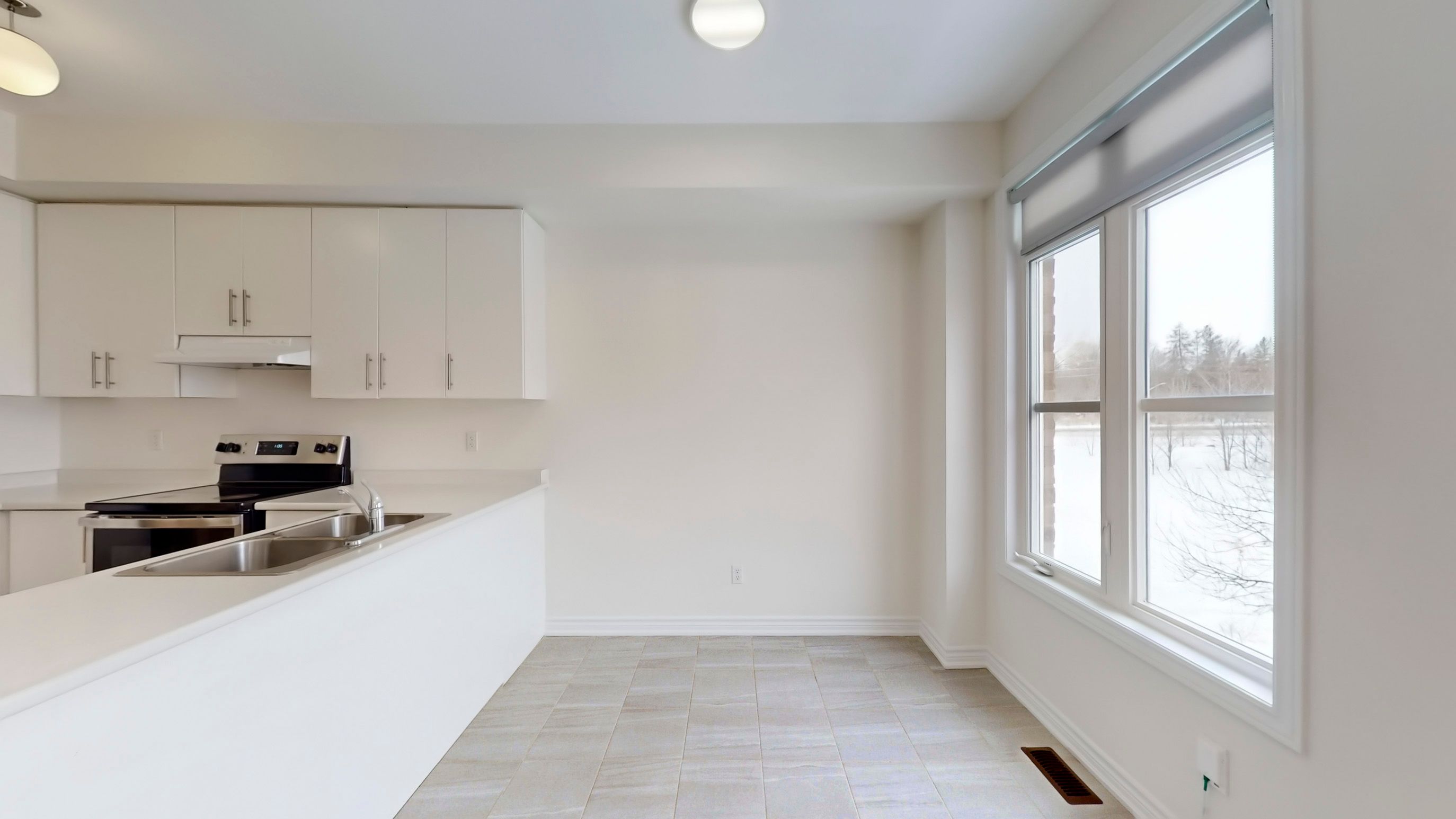 • Open-concept living and dining area with high ceilings for a bright feel.