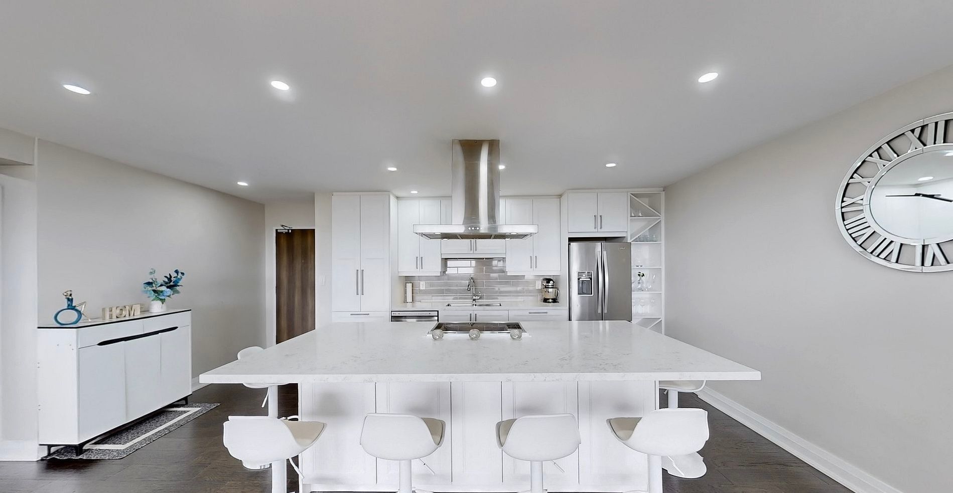 • Open concept layout with modern kitchen featuring stainless steel appliances.