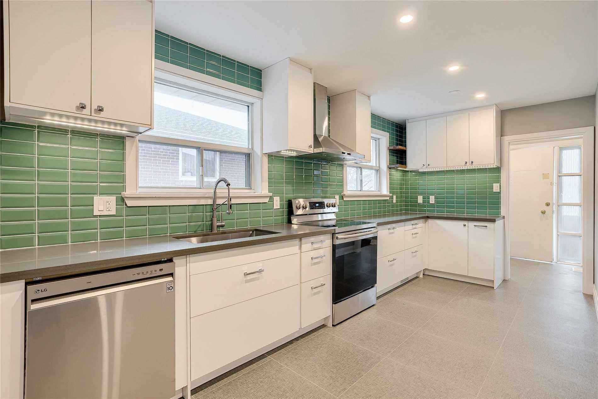 • Modern kitchen with quartz countertops and stainless steel appliances.