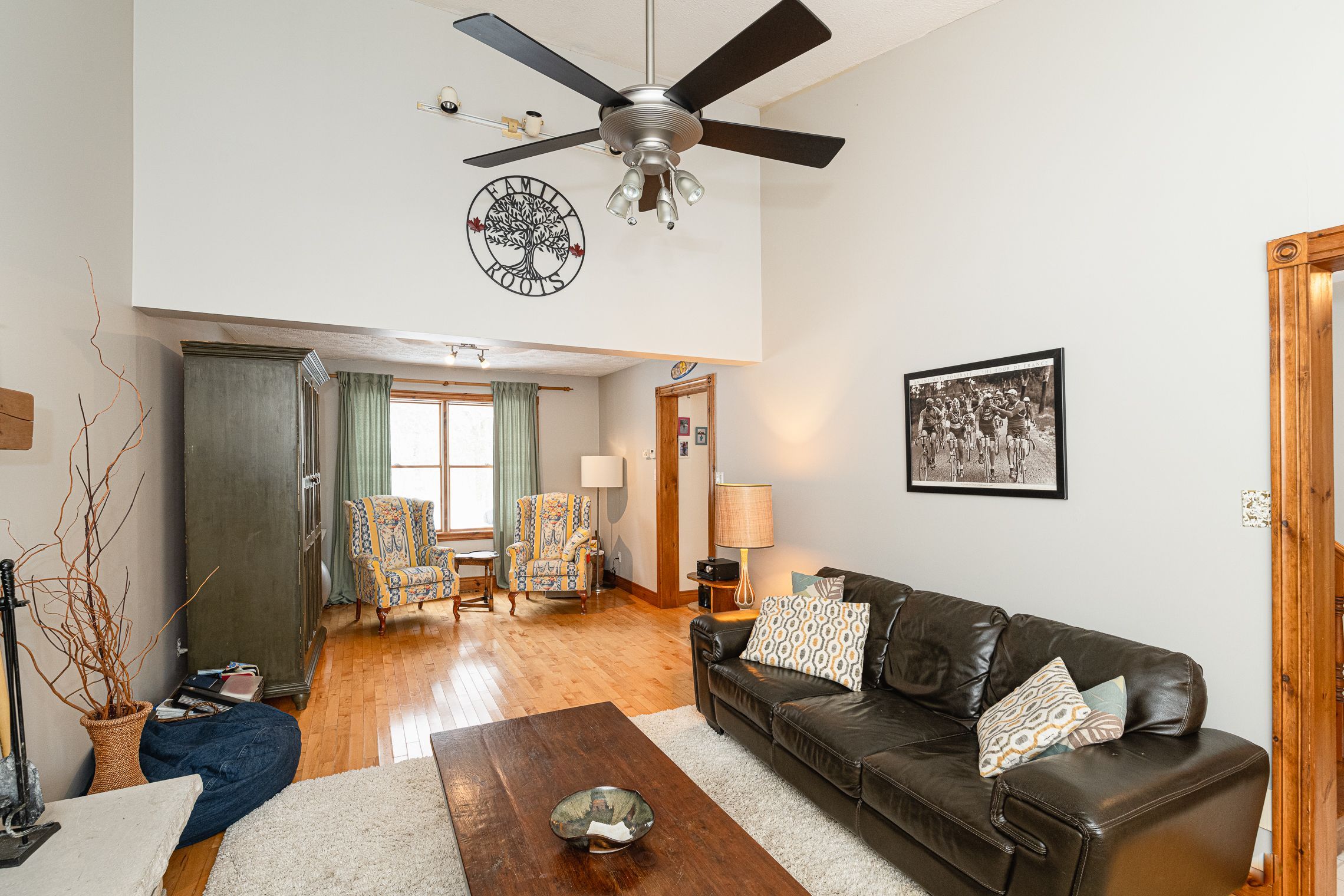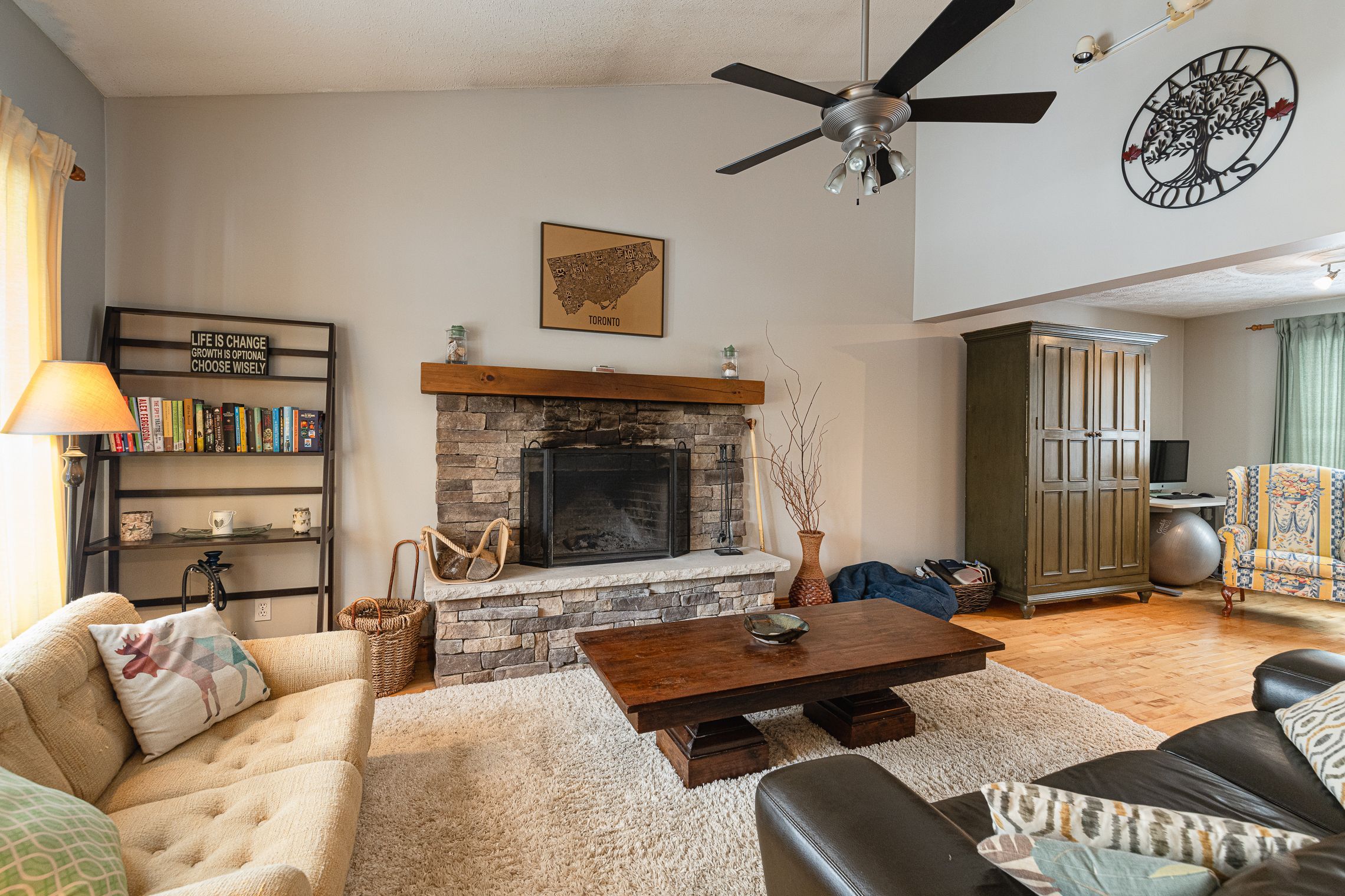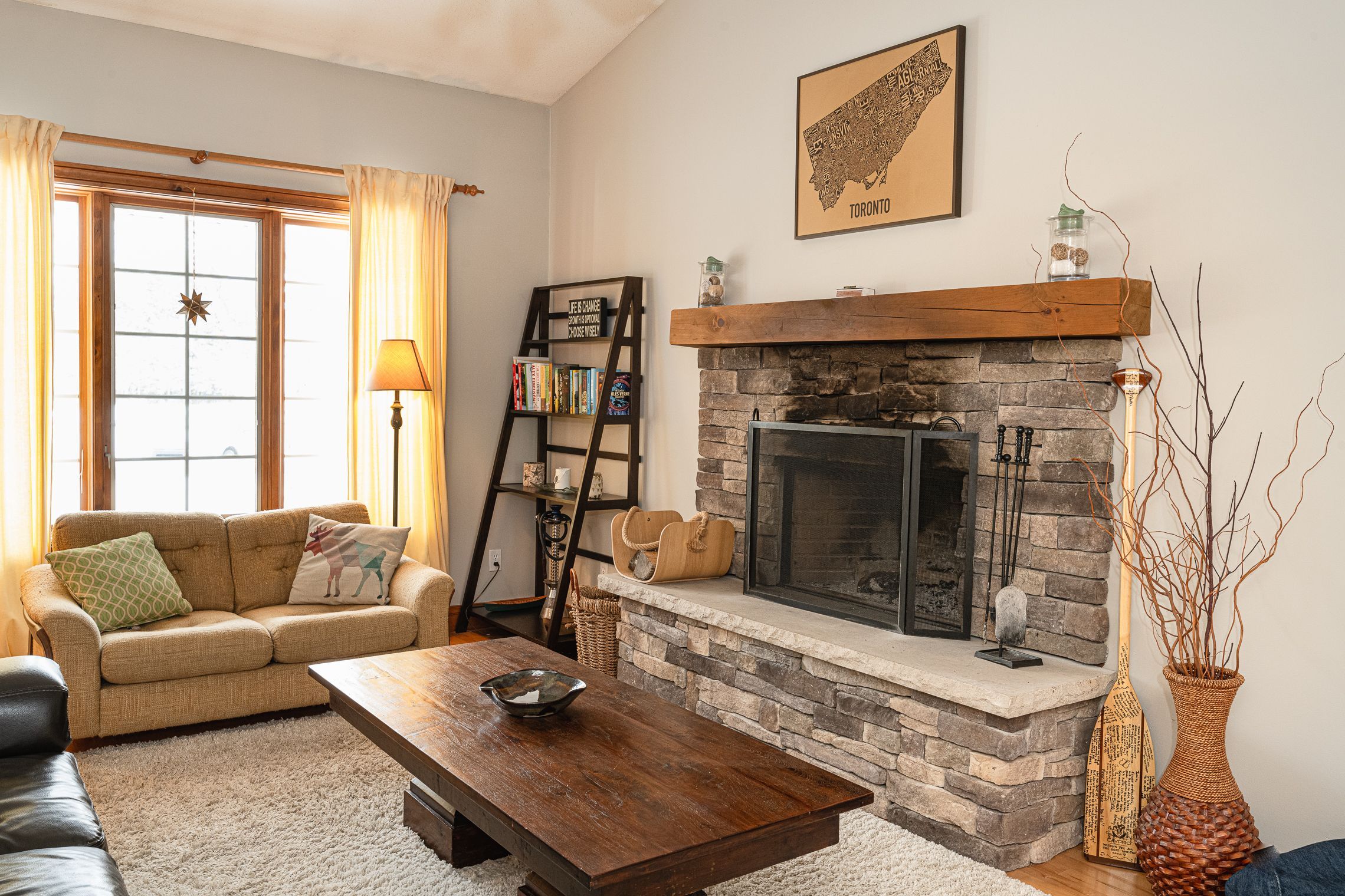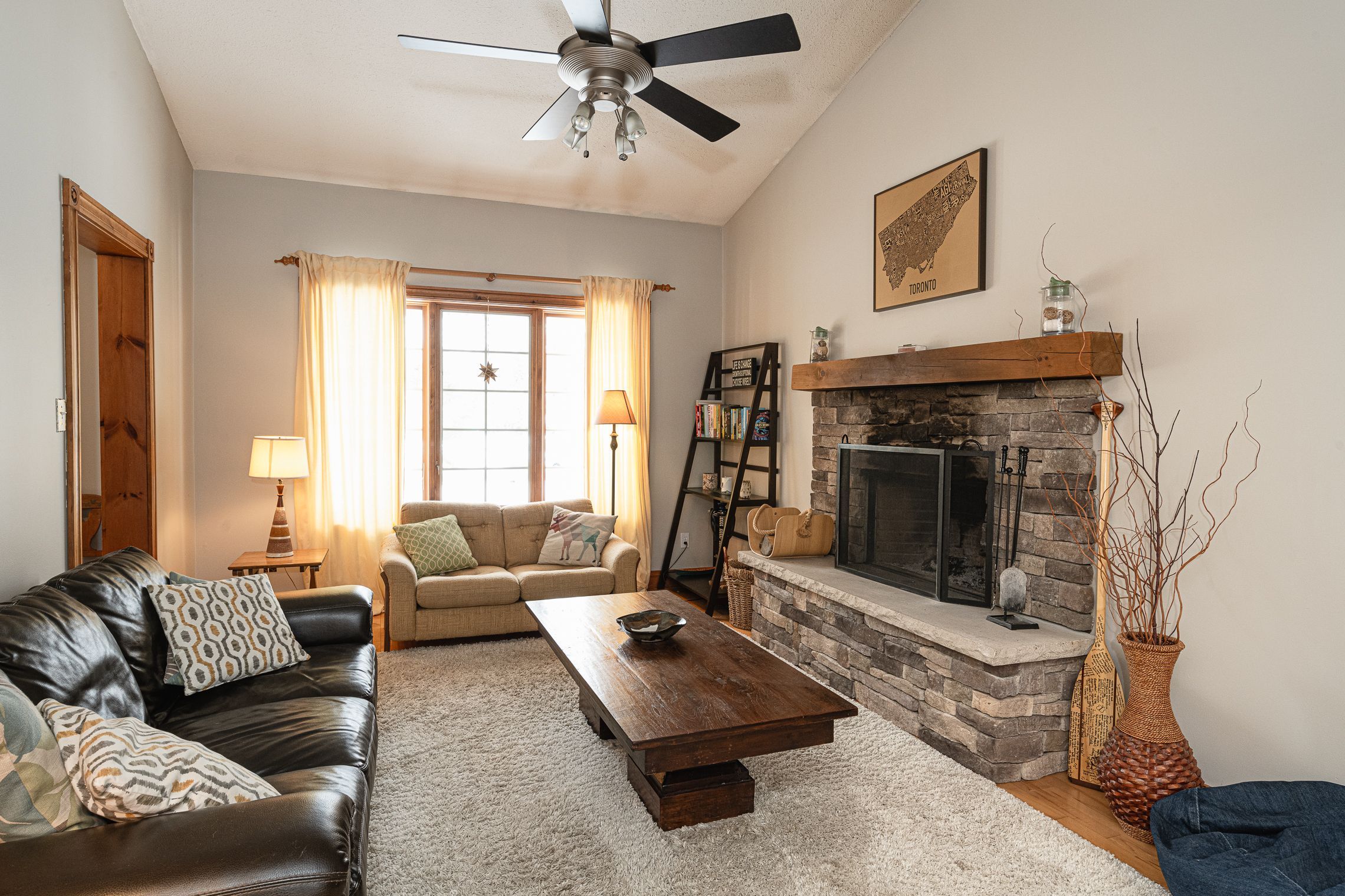 • Spacious living room with vaulted ceiling and cozy wood fireplace.