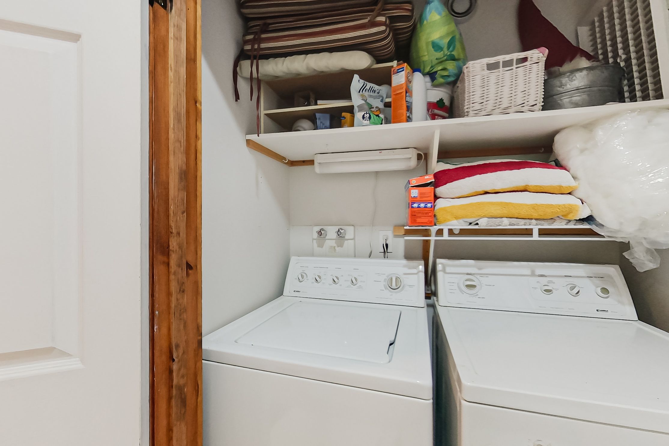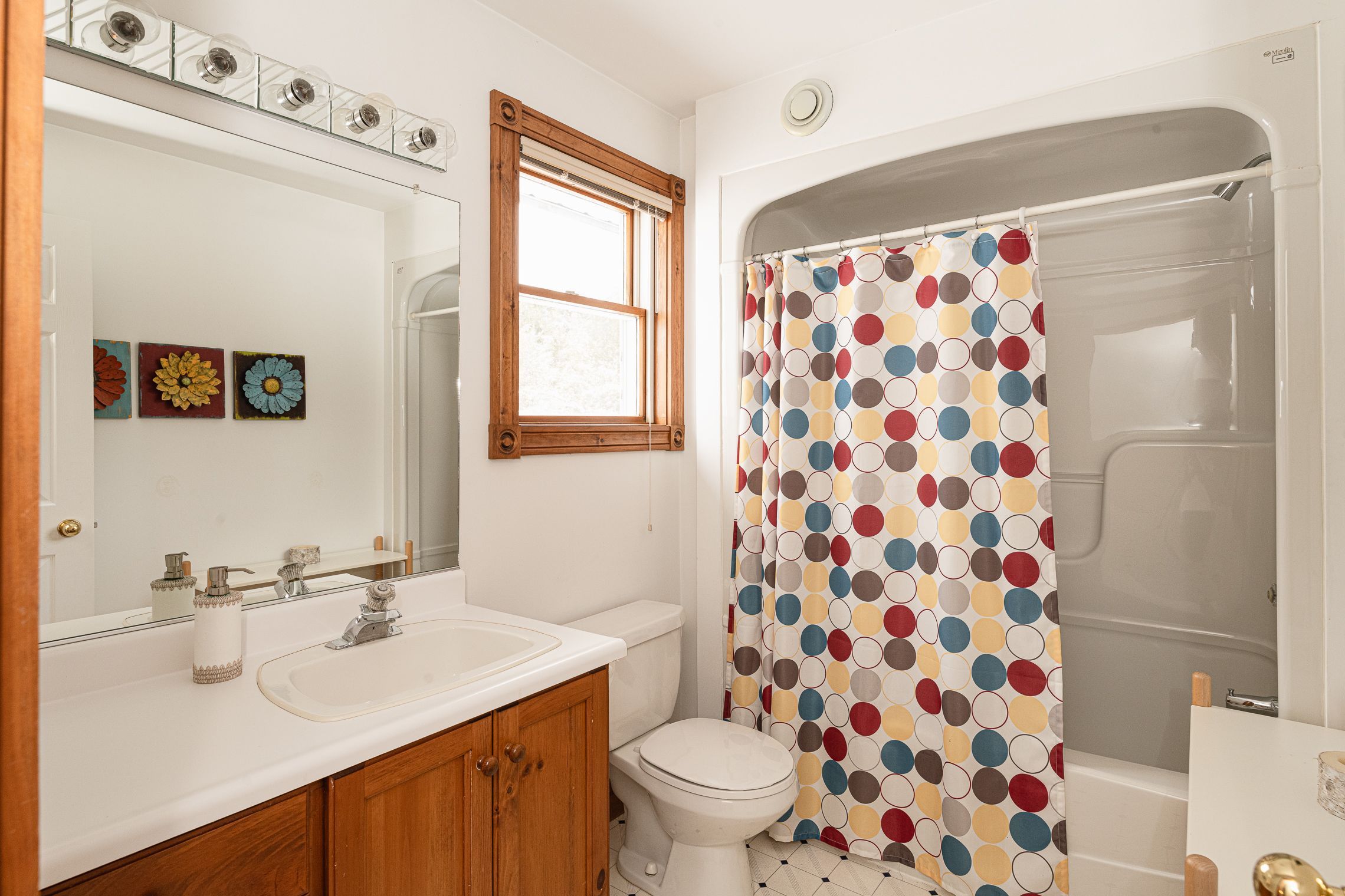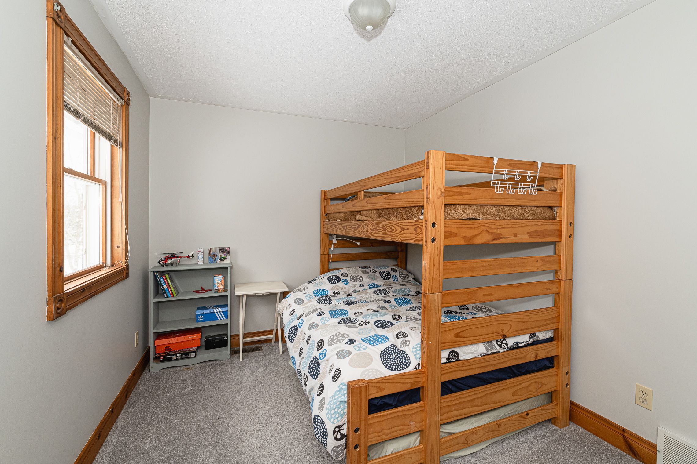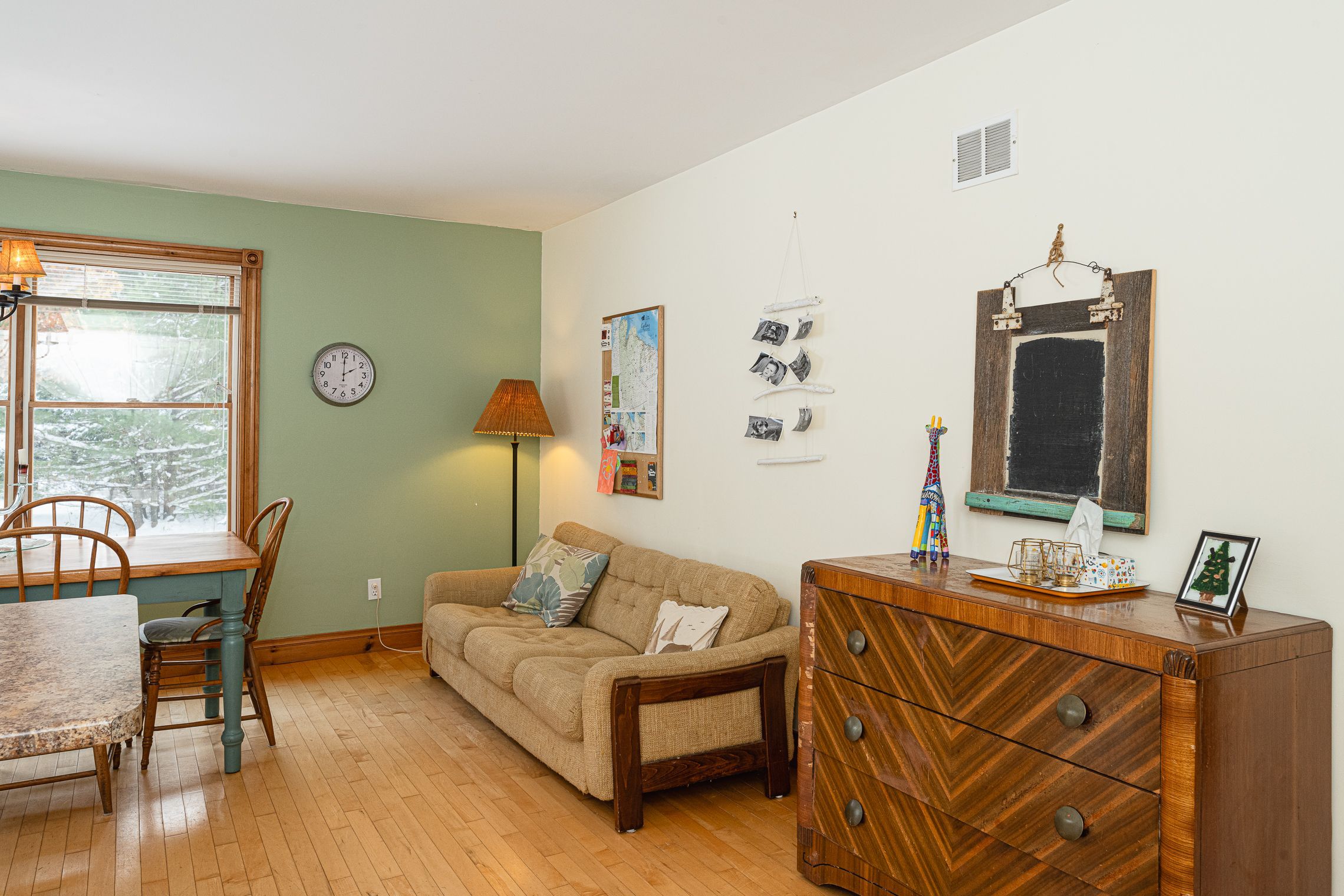 • Spacious living room with vaulted ceiling and cozy wood fireplace.