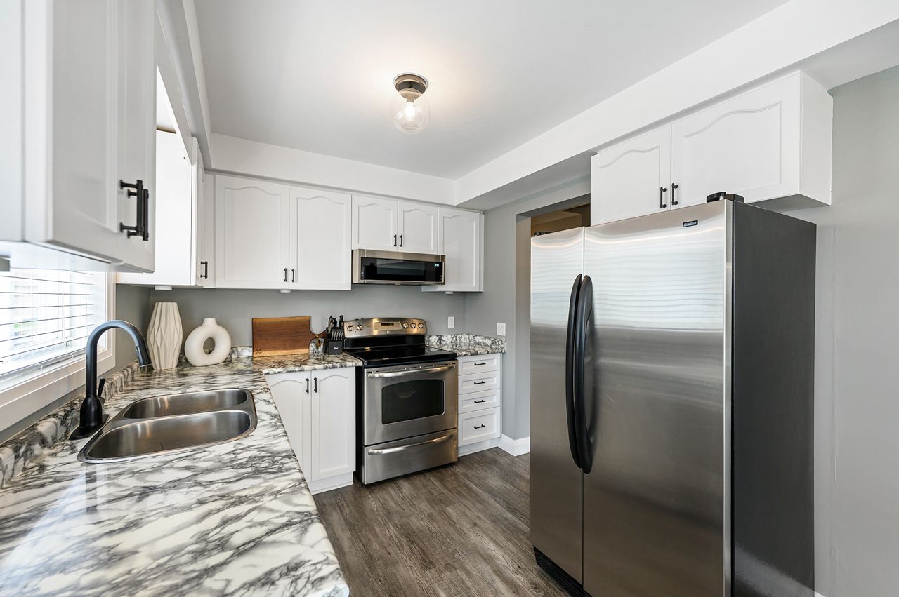 • Spacious eat-in kitchen with stainless steel appliances and private backyard access.