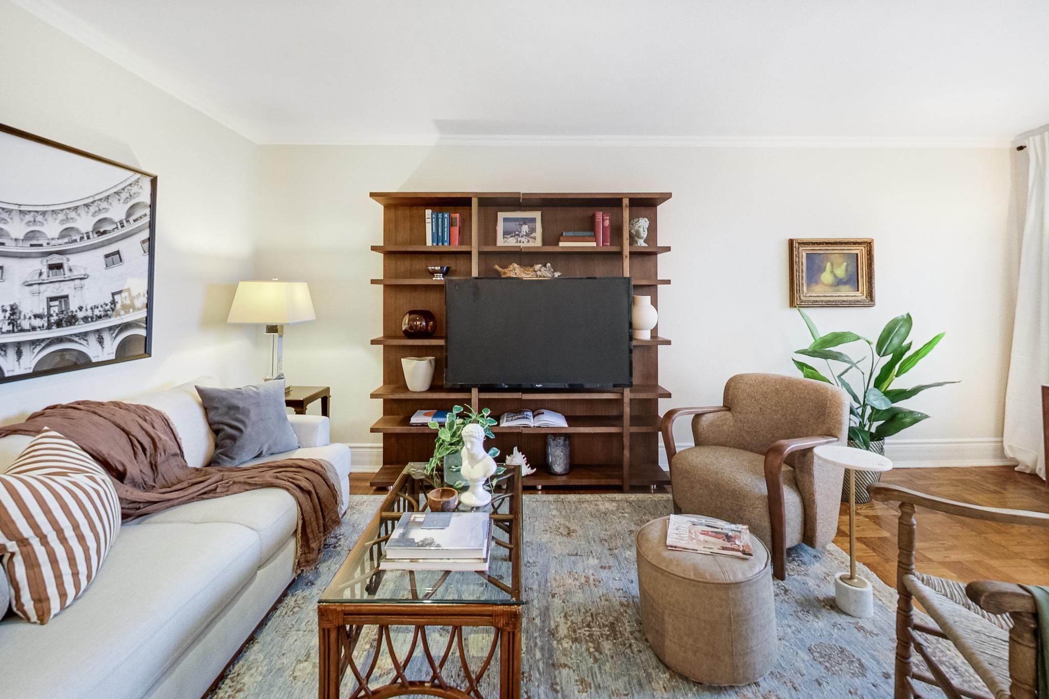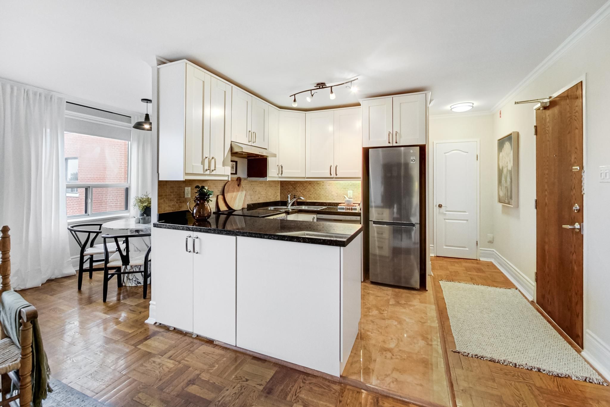 At 740 sq ft, this one-bedroom suite offers a layout that's considered and easy to live in. From the front door, the kitchen sits directly ahead-efficiently planned with a breakfast bar for everyday meals-while a short hallway to the right leads to the bedroom and 4-piece bath, keeping the private spaces set apart from the main living area. Past the kitchen, the living room opens up with a large window for consistent natural light and warm parquet floors that add character without fuss. A defined dining nook sits just off the living area, so you can keep a proper table without giving up flow. The bedroom is comfortably sized with two closets, and the suite has been freshly painted for a clean, move-in-ready feel. Extras that matter day to day: a super quiet building, surface parking, and a locker. As a co-ownership apartment, the monthly fees include utilities and property taxes-one clear monthly number that makes budgeting simpler and ownership feel predictable. A well-proportioned one-bedroom in a midtown location, with practical inclusions and steady carrying costs, for buyers ready to trade renting for something more stable.