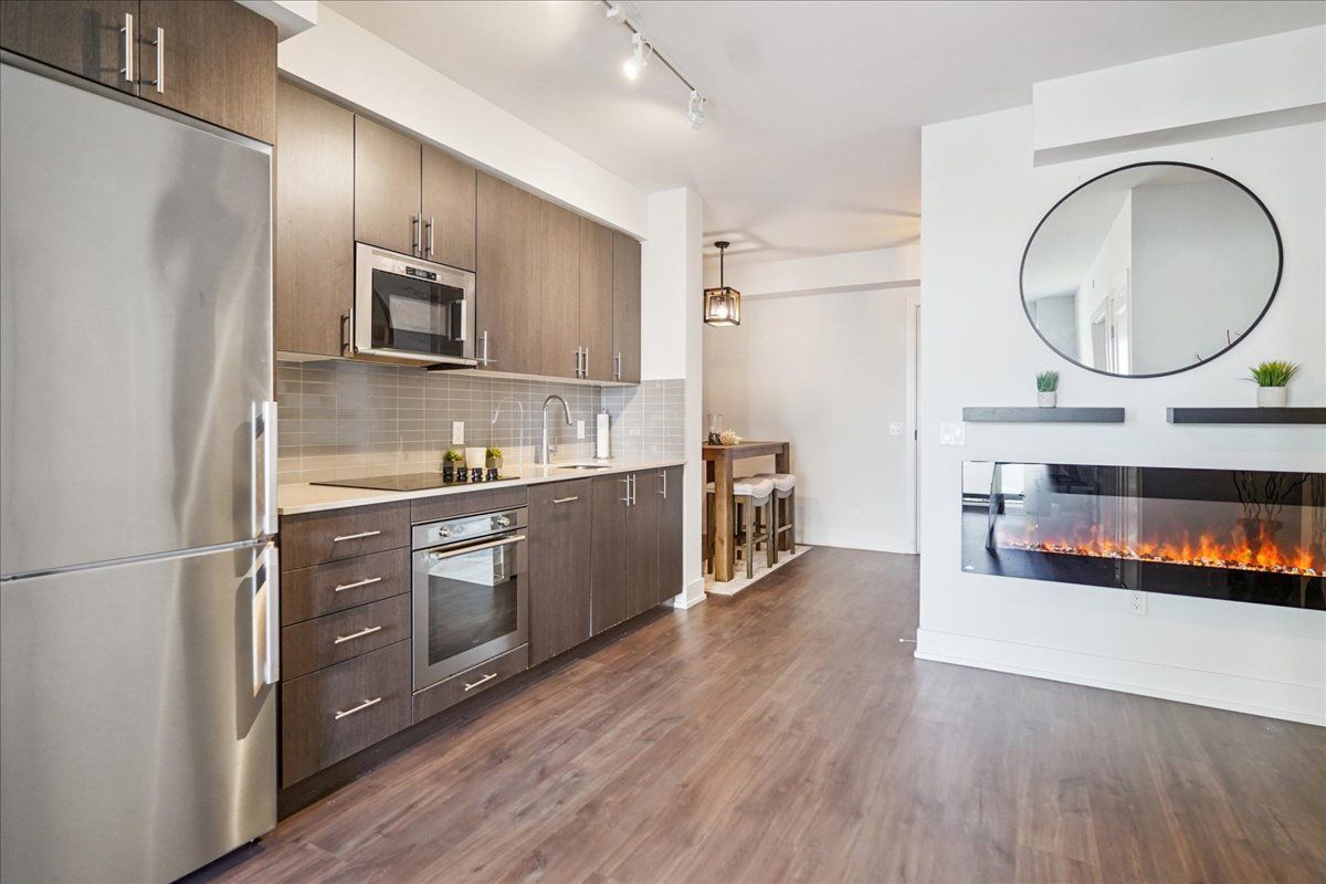 • Stainless steel appliances and contemporary finishes throughout the space.