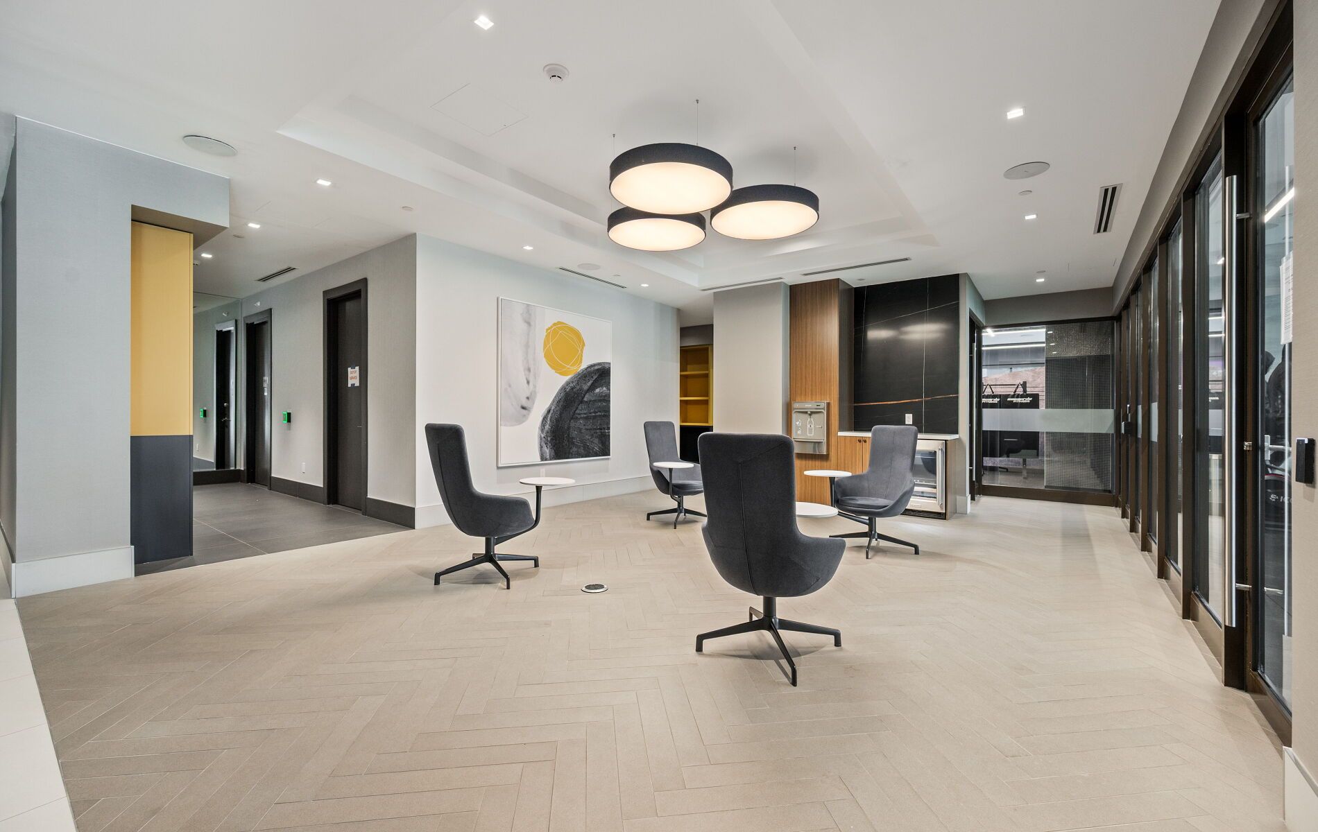 • Open-concept studio plus den, larger than typical one-bedroom units.